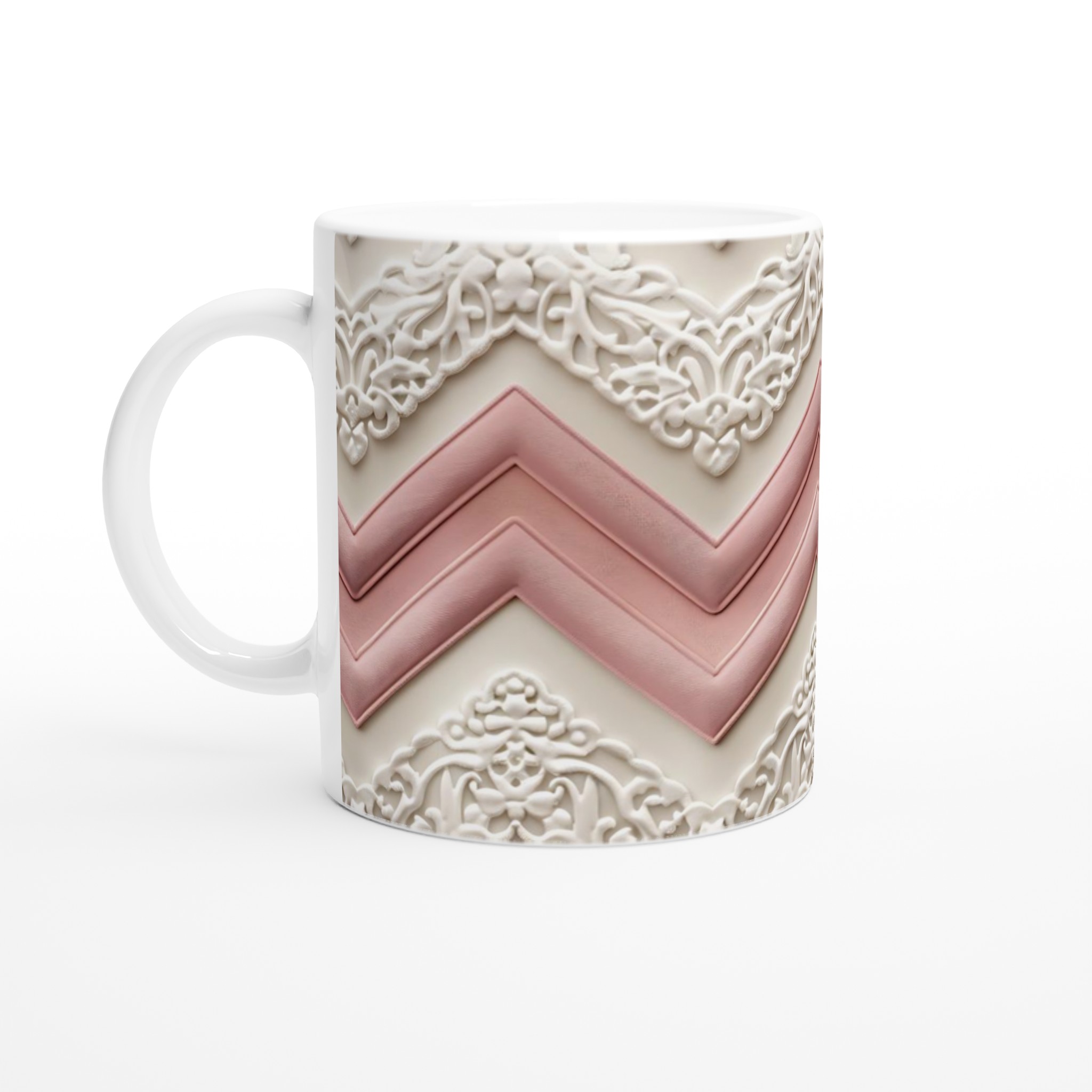Lyft varje kaffestund med vår premium keramikmugg – stilren, hållbar och skapad för att låta ditt motiv glänsa. Inspirerad av bilden, där eleganta rosa chevronmönster möter detaljerad vit spets, erbjuder denna mugg en touch av sofistikerad charm till din dagliga rutin. Dess blanka yta ger ett skarpt och levande tryck som verkligen sticker ut, perfekt för att visa upp en personlig design, ett inspirerande citat eller som en omtänksam present.