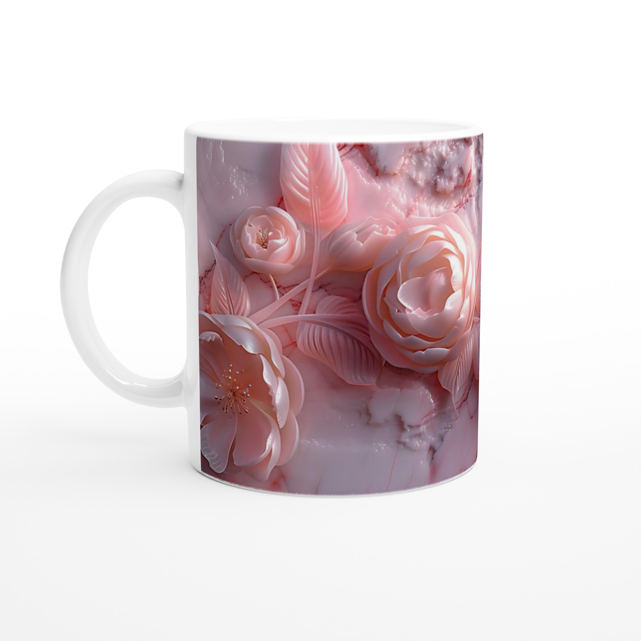 Inspirerad av den drömska skönheten hos rosa marmor och skimrande pärlemorblommor, ger denna mugg en touch av elegans och lugn till din vardag. Den blanka vita ytan ger ett skarpt och levande tryck som verkligen sticker ut, oavsett om det är en personlig design, ett roligt citat eller en present till någon du tycker om.