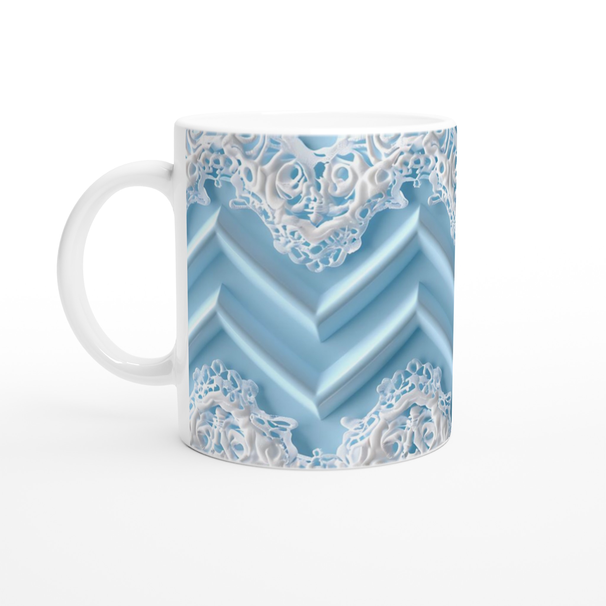 Inspirerad av vinterns elegans med sitt intrikata snöflinge-mönster mot en lugnande blå bakgrund, fångar denna mugg en känsla av ro och sofistikation. Den blanka ytan ger ett skarpt och levande tryck som verkligen sticker ut, perfekt för att starta dagen med en touch av klass eller för att ge bort en present som värmer hjärtat. Skapa din egen vinterdröm genom att välja från en palett av sju frostiga färger, från krispigt vitt till djupblått, och låt din personliga design stråla.