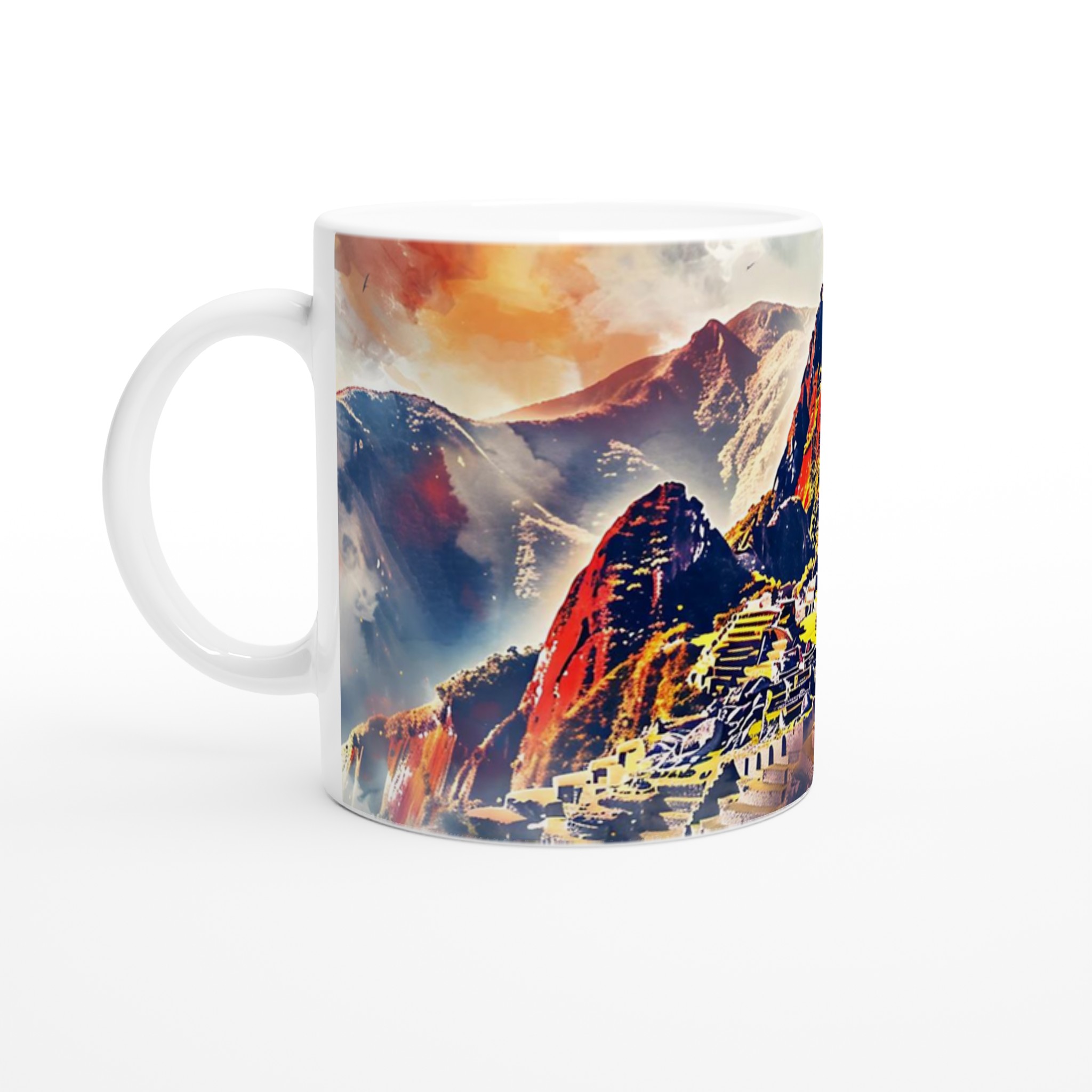 Lyft varje kaffestund med vår premium keramikmugg – stilren, hållbar och skapad för att låta ditt motiv glänsa. Denna mugg fångar den majestätiska skönheten hos Machu Picchu i en färgstark akvarellstil, med dramatiska bergstoppar, gyllene soluppgångar och mystiska ruiner. Den blanka vita ytan ger ett skarpt och levande tryck som verkligen sticker ut, oavsett om det är en personlig design, ett roligt citat eller en present till någon du tycker om.