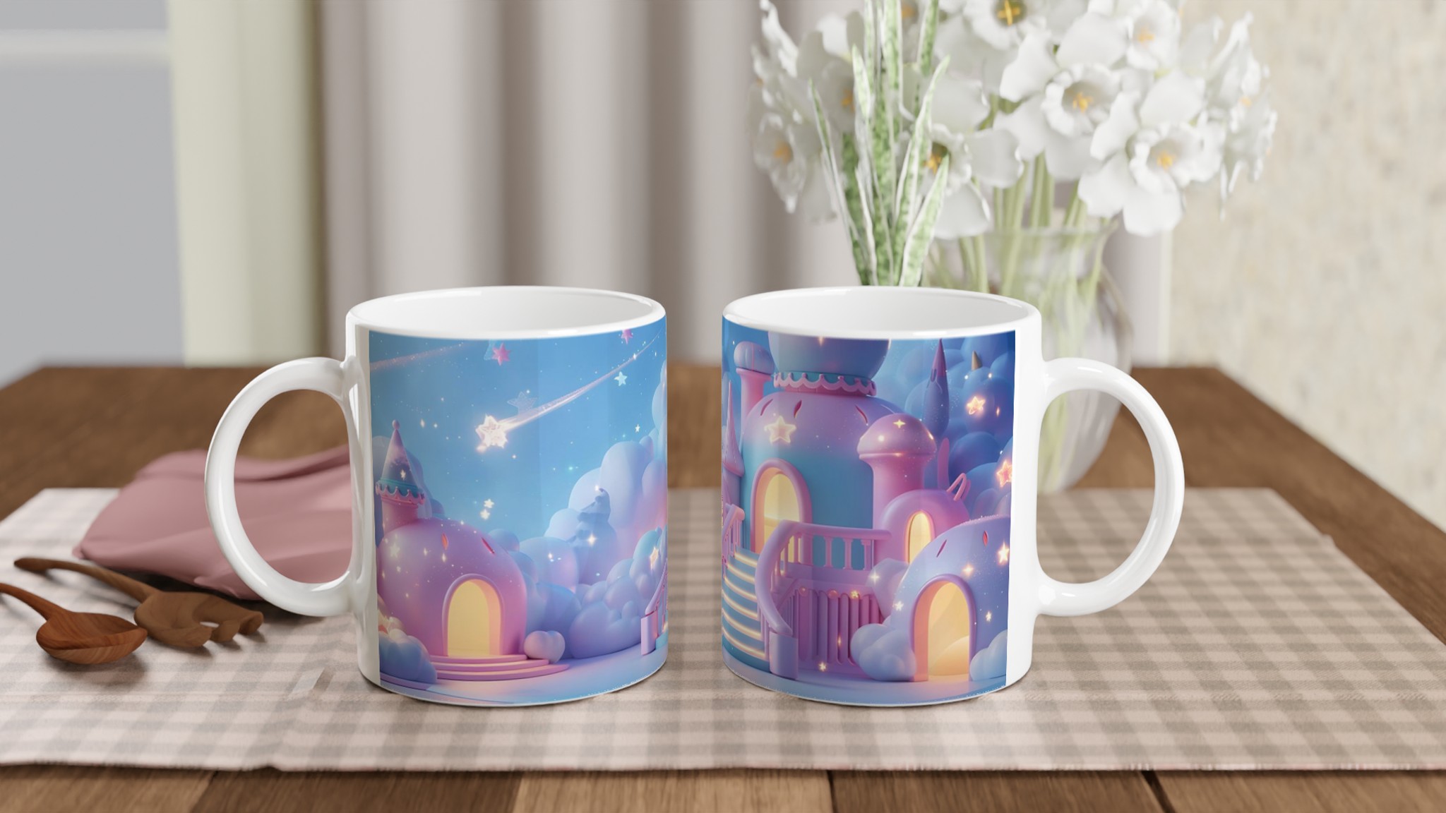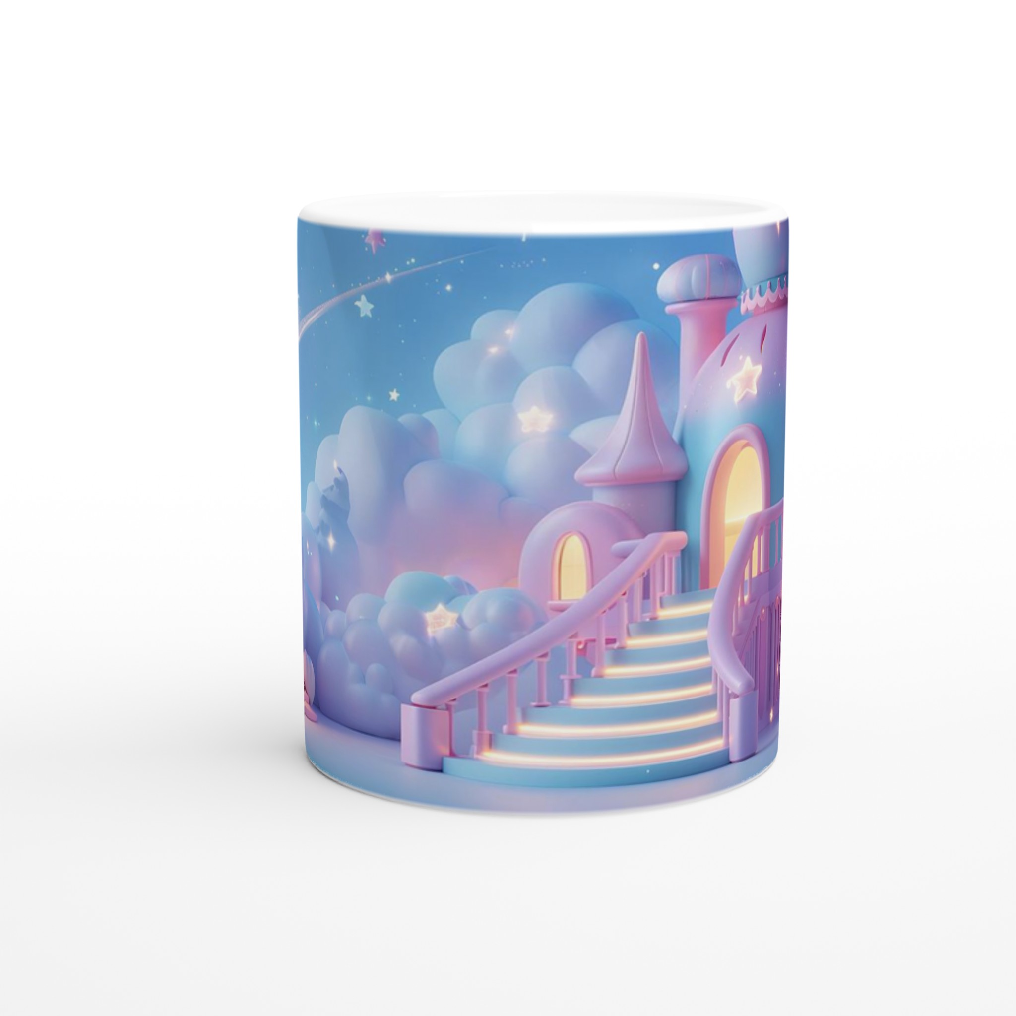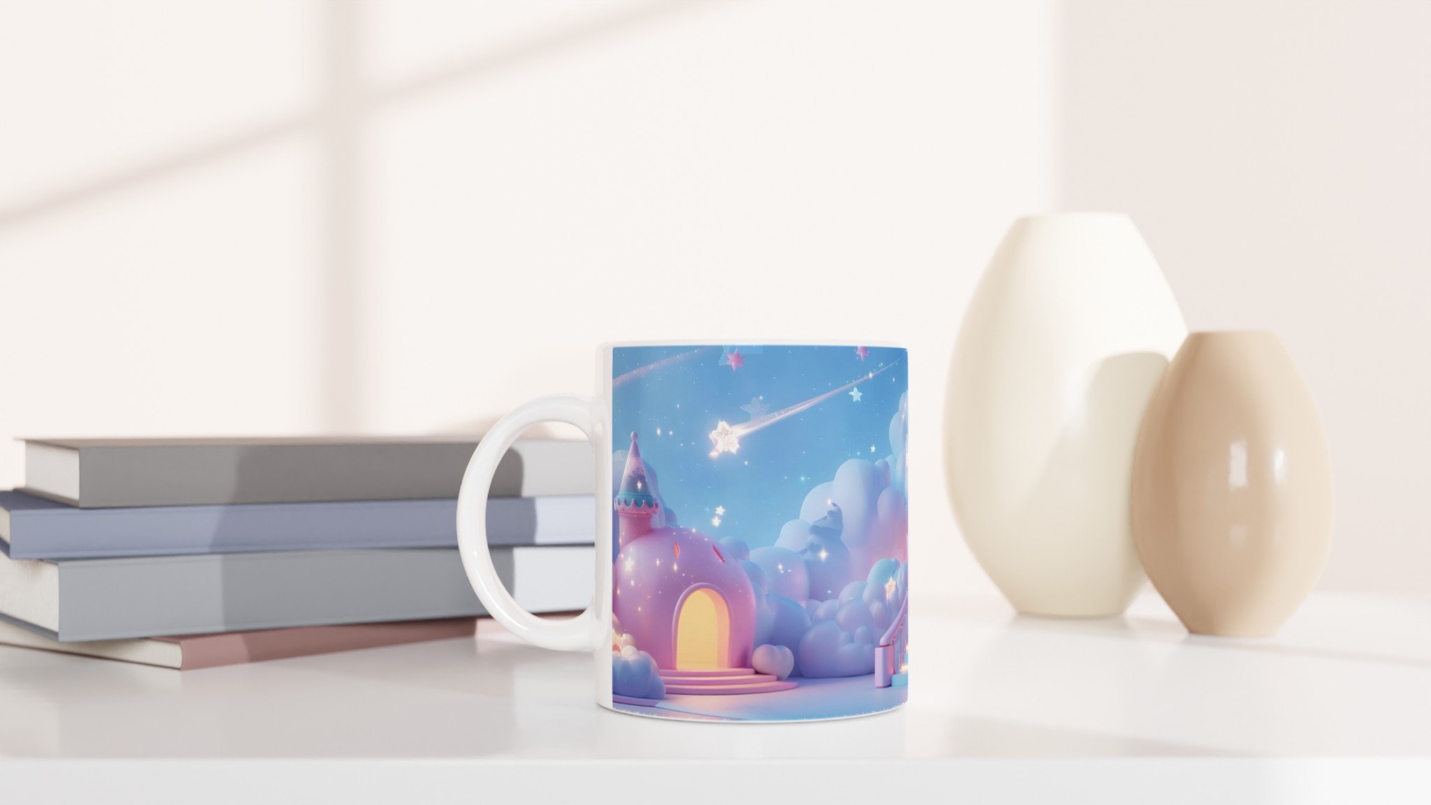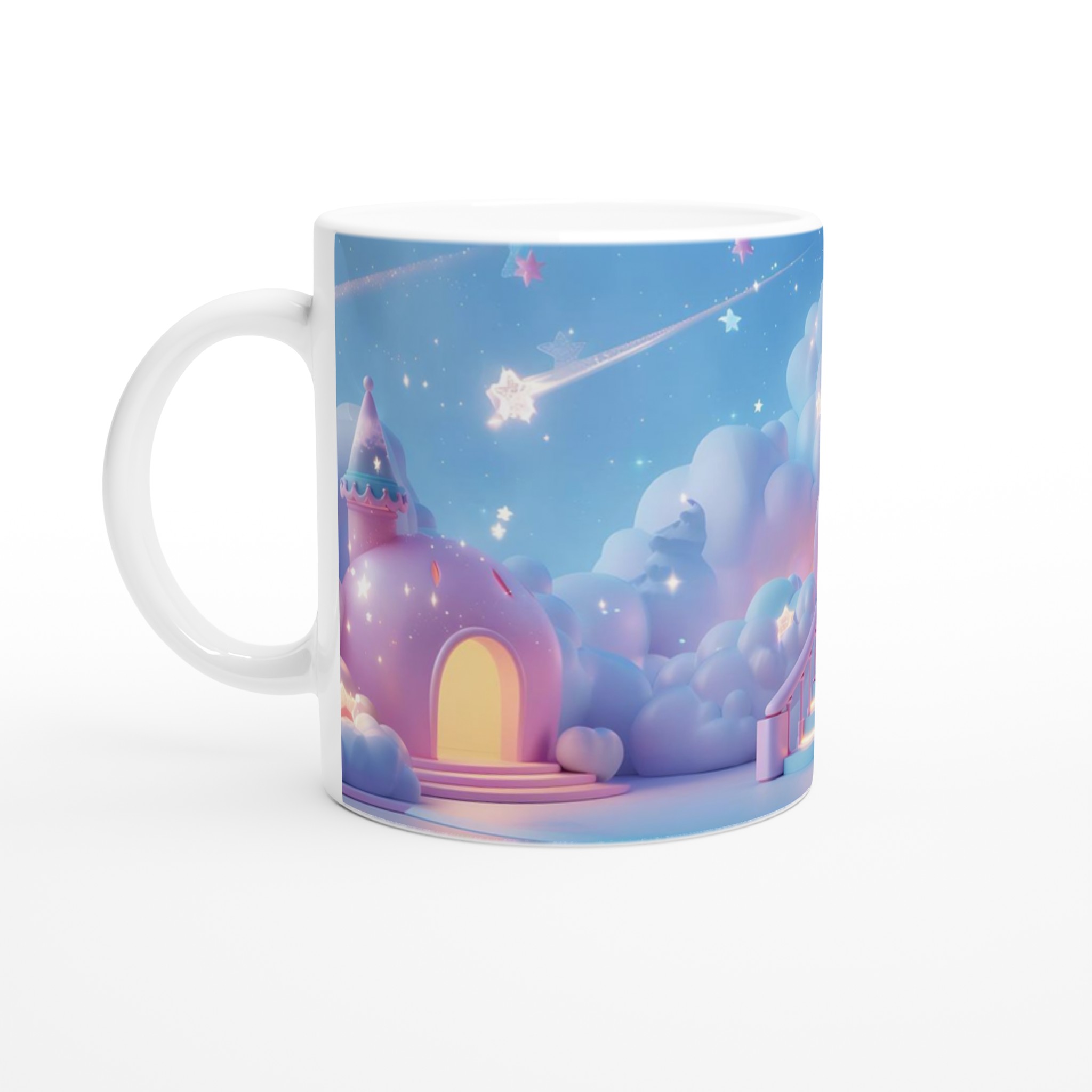 Fånga magin med vår förtrollande keramiska mugg, inspirerad av fantasins sagoslott och lysande stjärnhimmel. Med sin ljuva palett av pastellrosa och himmelsblått, förvandlar denna mugg varje dryckesstund till en drömsk flykt. Den blanka vita ytan ser till att de mjuka trycken framhävs med klara och levande färger, som håller sig fina även efter många turer i mikron och diskmaskinen.