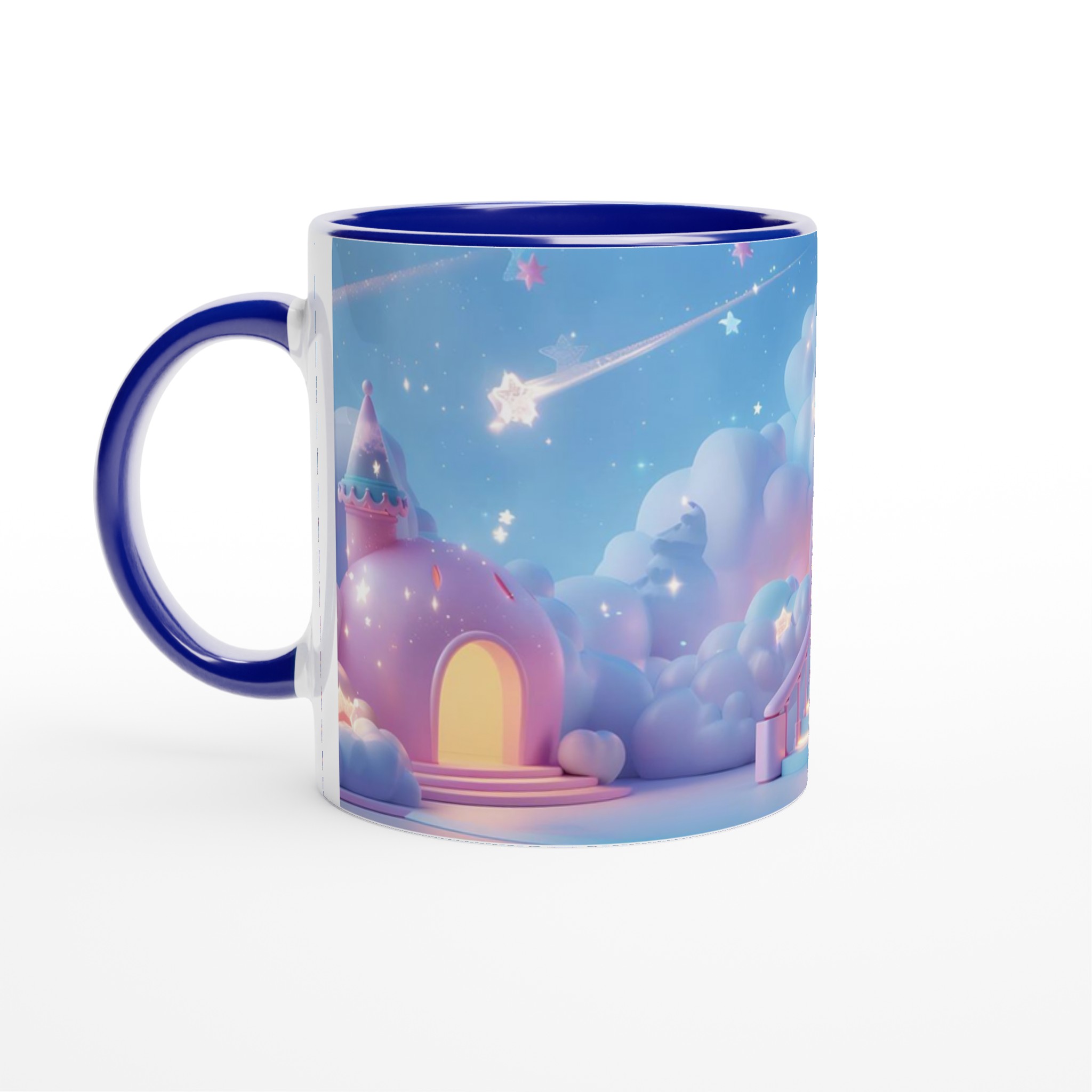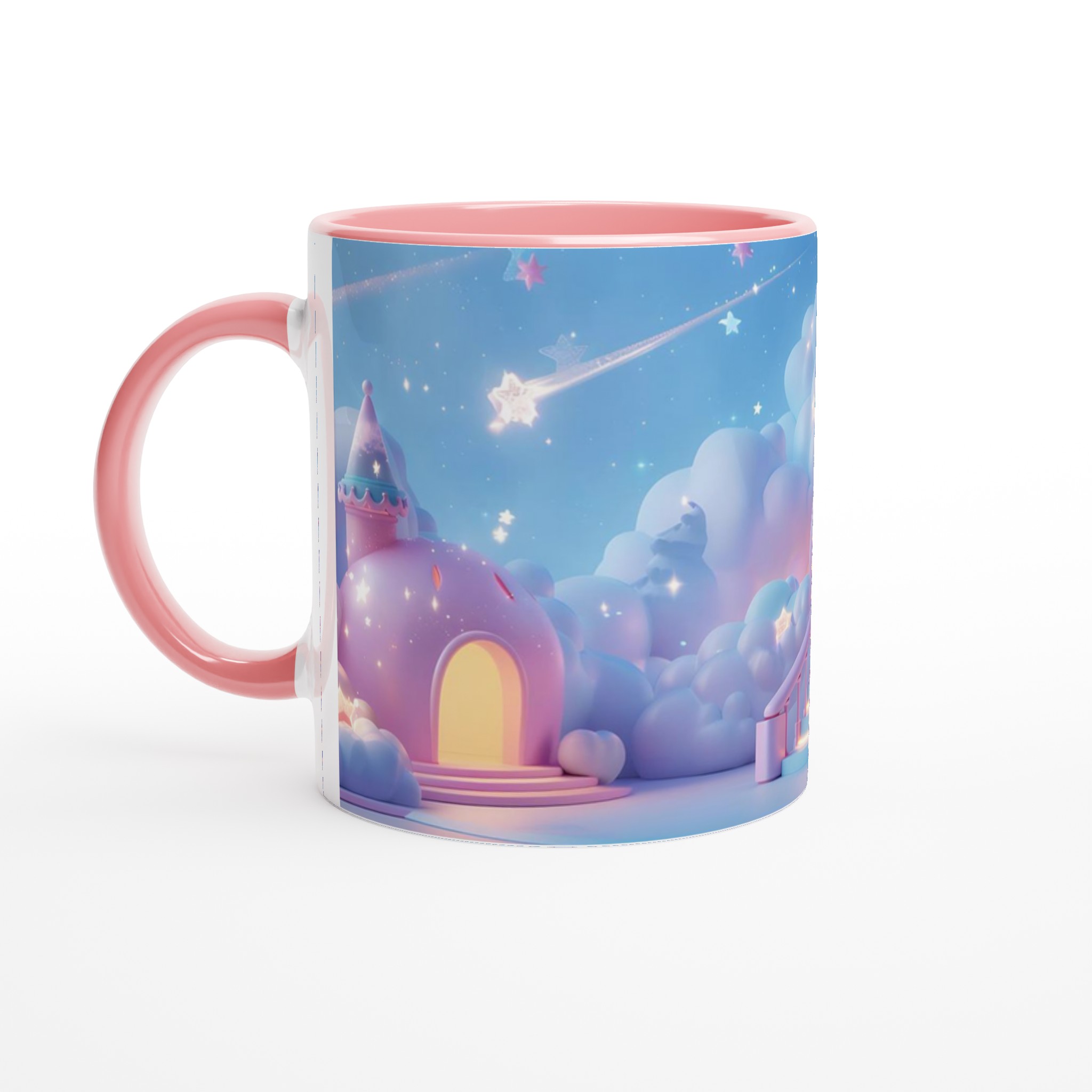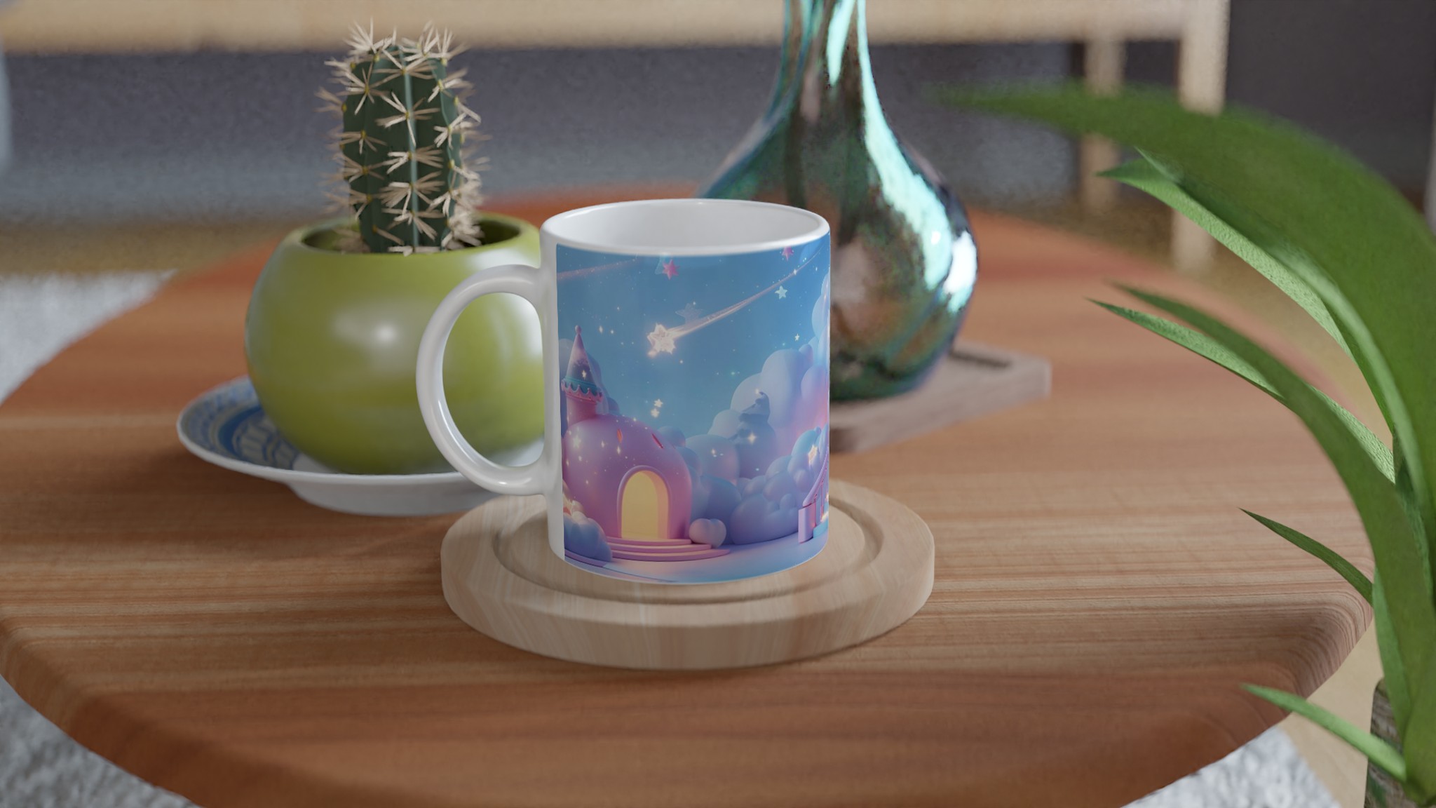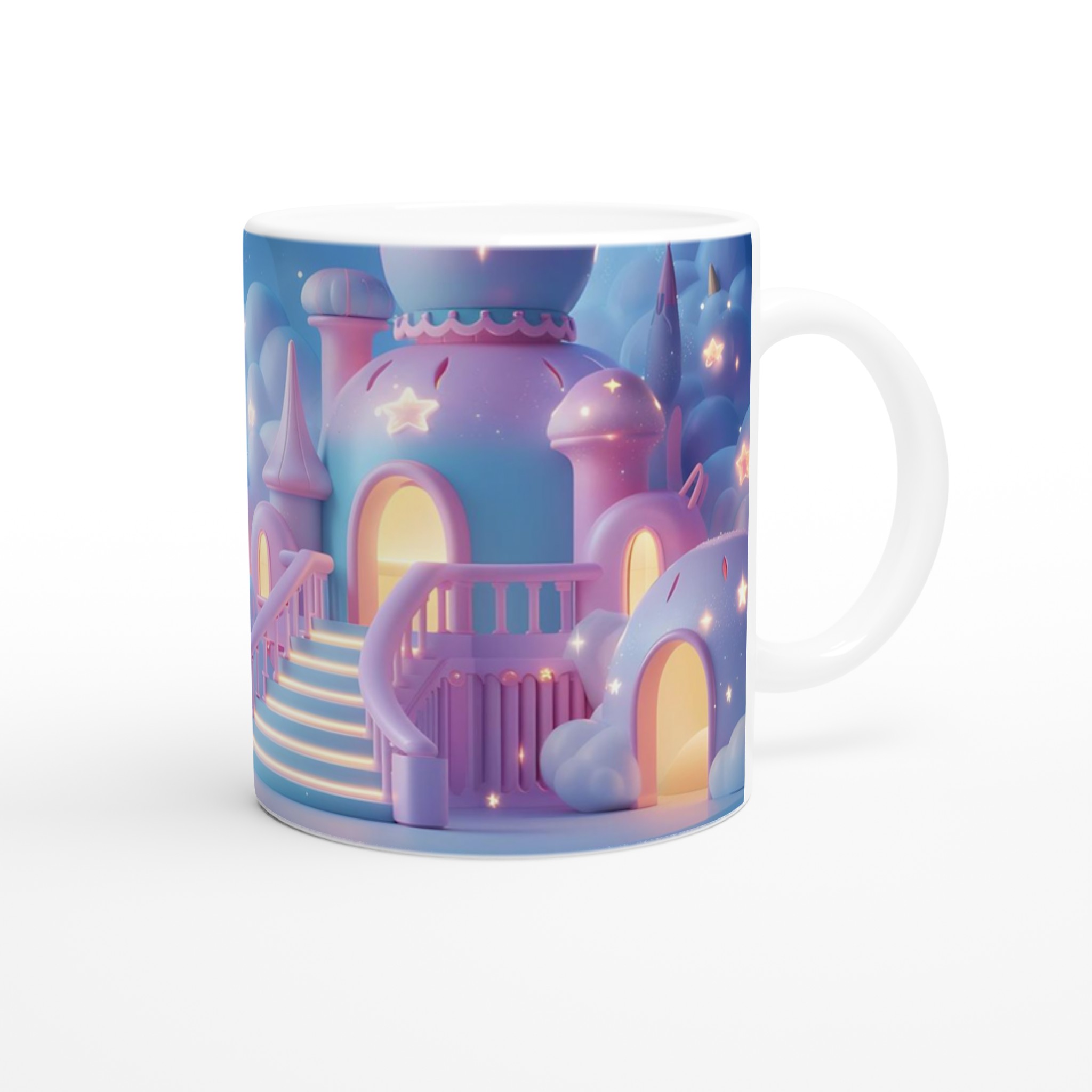 Fånga magin med vår förtrollande keramiska mugg, inspirerad av fantasins sagoslott och lysande stjärnhimmel. Med sin ljuva palett av pastellrosa och himmelsblått, förvandlar denna mugg varje dryckesstund till en drömsk flykt. Den blanka vita ytan ser till att de mjuka trycken framhävs med klara och levande färger, som håller sig fina även efter många turer i mikron och diskmaskinen.