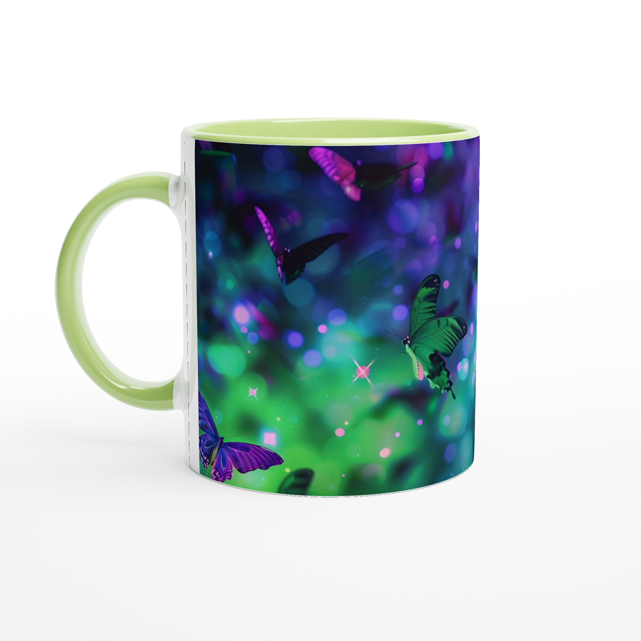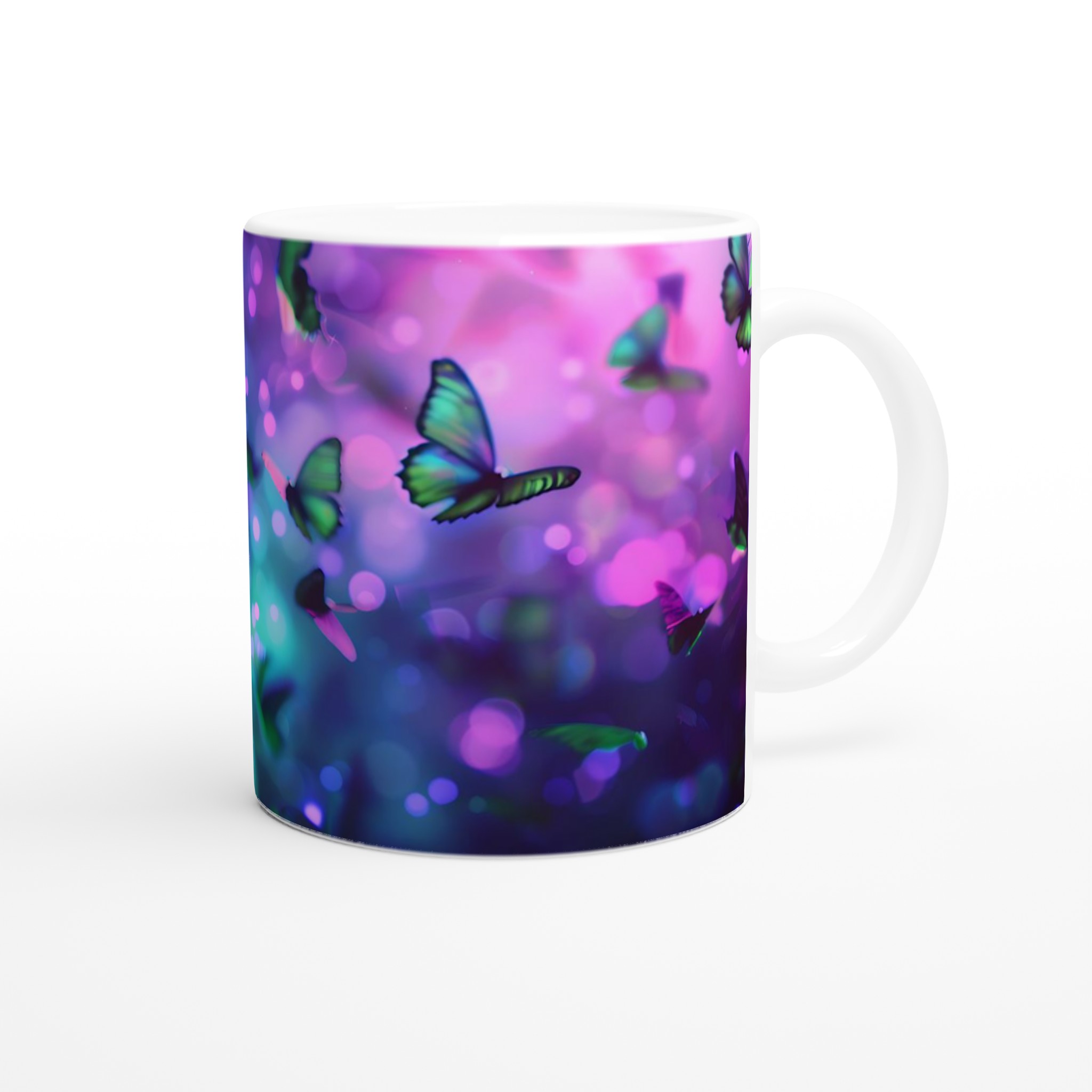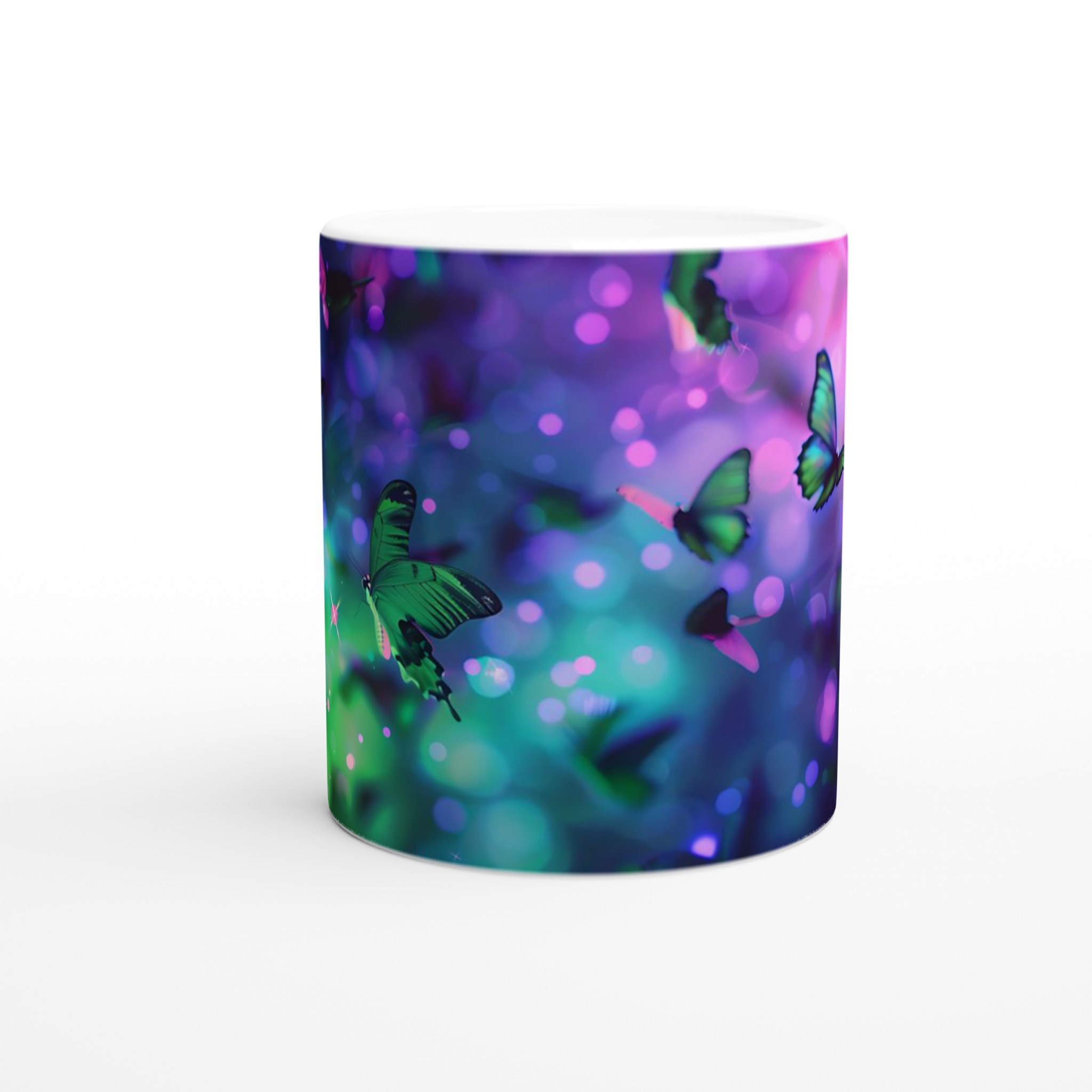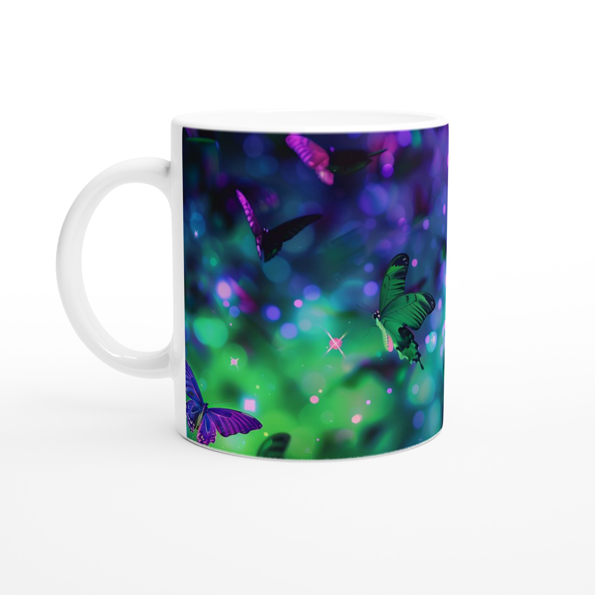 Fånga magin från en drömlik fjärilsvärld med vår förtrollande keramiska mugg. Varje klunk blir en flykt till ett kalejdoskop av levande färger och skimrande ljus, inspirerat av bilden av vackra fjärilar som dansar i en symfoni av gröna och lila nyanser. Denna mugg är inte bara en behållare för din dryck; den är en inbjudan till att omfamna det extraordinära i din vardag, perfekt för morgonkaffet, kvällens varma choklad eller när du bara vill njuta av en kopp te.
