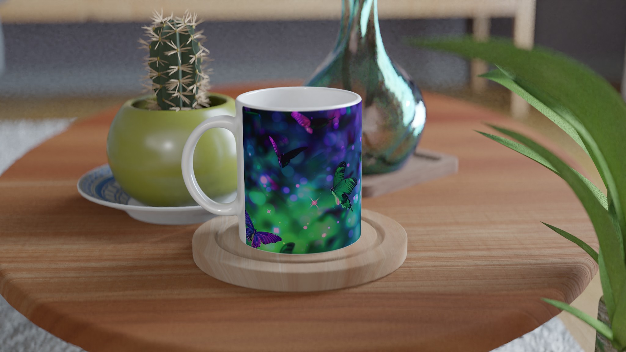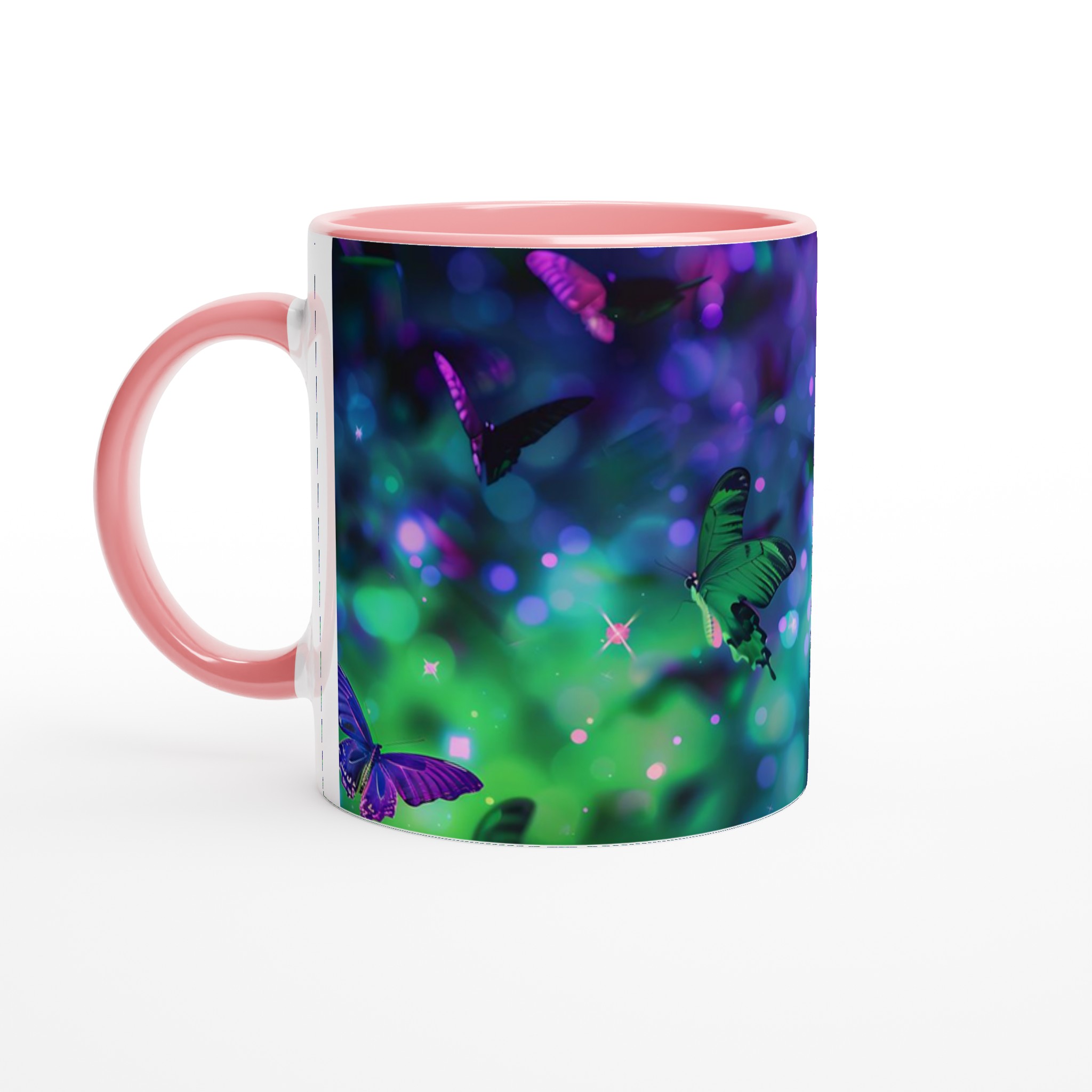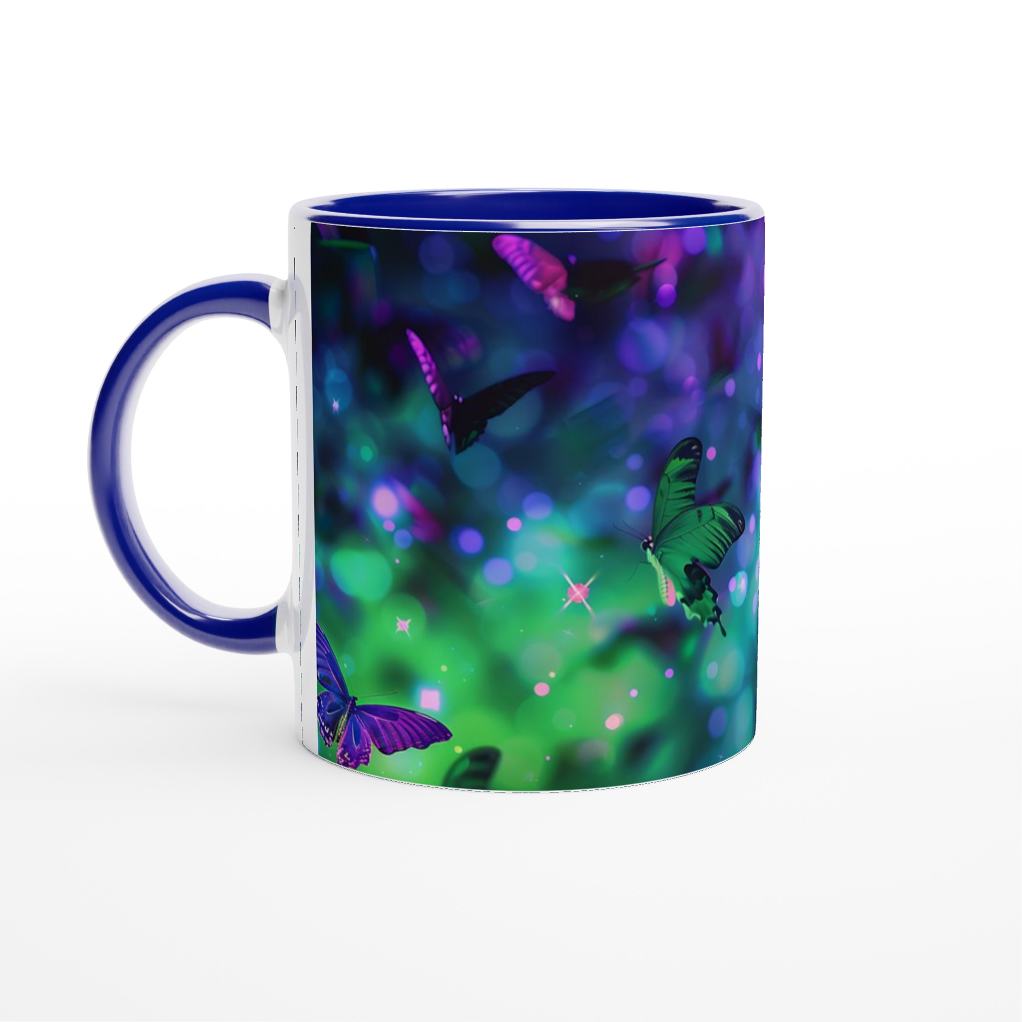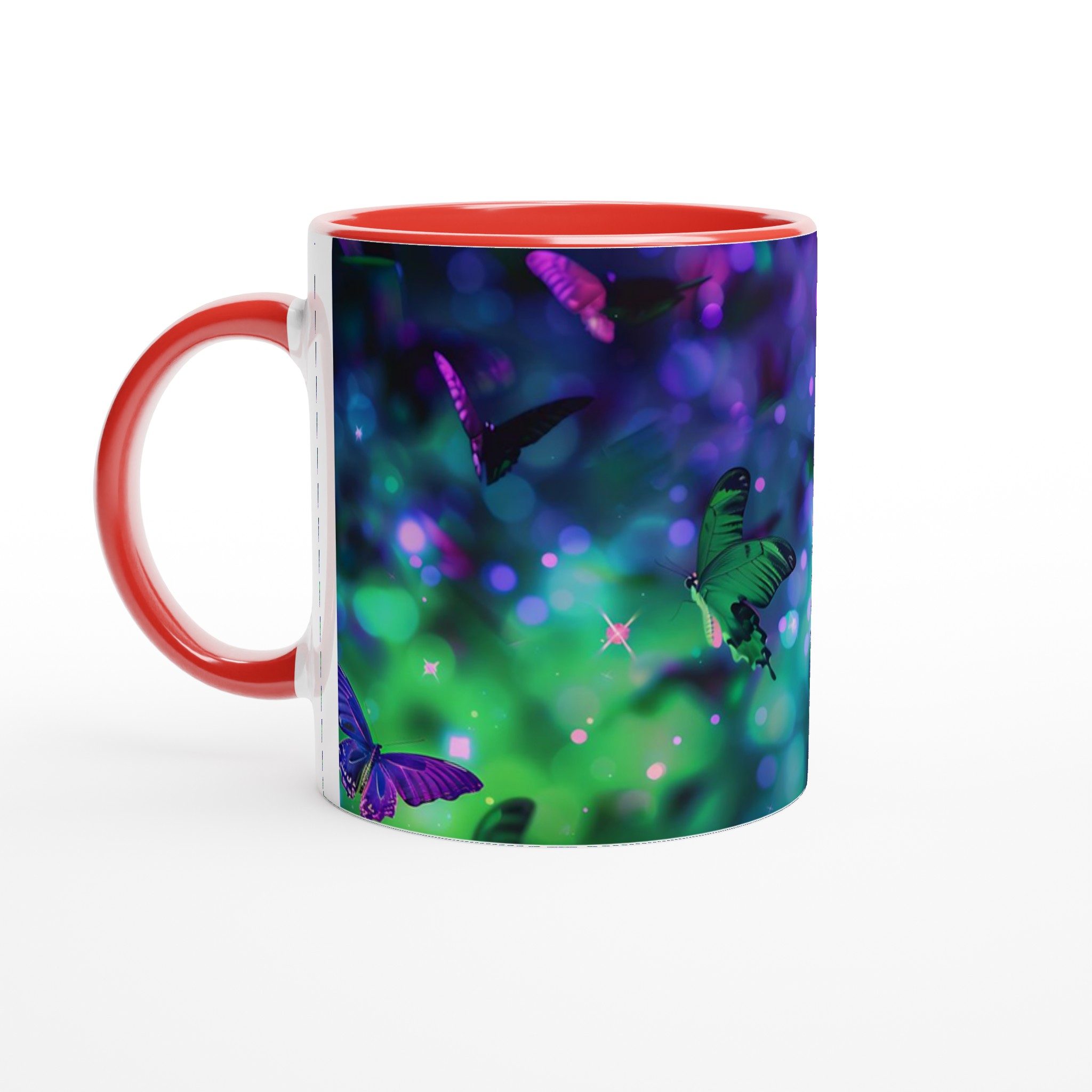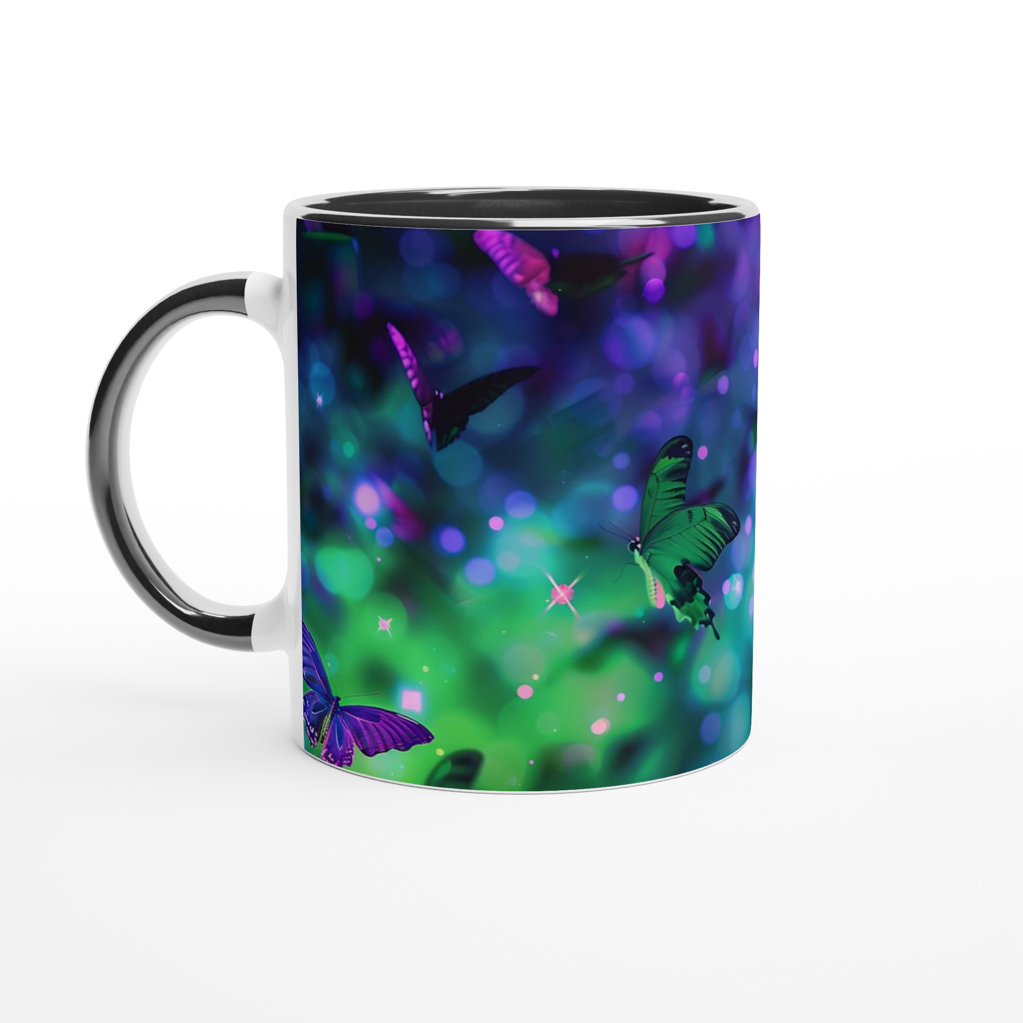 Fånga magin från en drömlik fjärilsvärld med vår förtrollande keramiska mugg. Varje klunk blir en flykt till ett kalejdoskop av levande färger och skimrande ljus, inspirerat av bilden av vackra fjärilar som dansar i en symfoni av gröna och lila nyanser. Denna mugg är inte bara en behållare för din dryck; den är en inbjudan till att omfamna det extraordinära i din vardag, perfekt för morgonkaffet, kvällens varma choklad eller när du bara vill njuta av en kopp te.