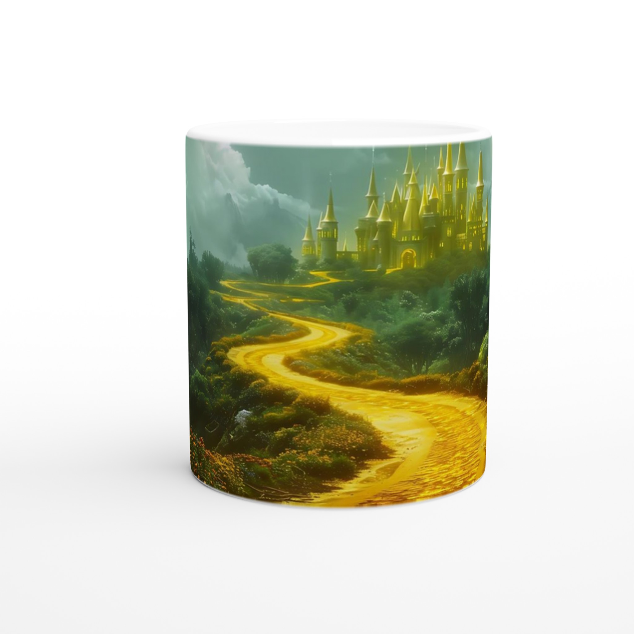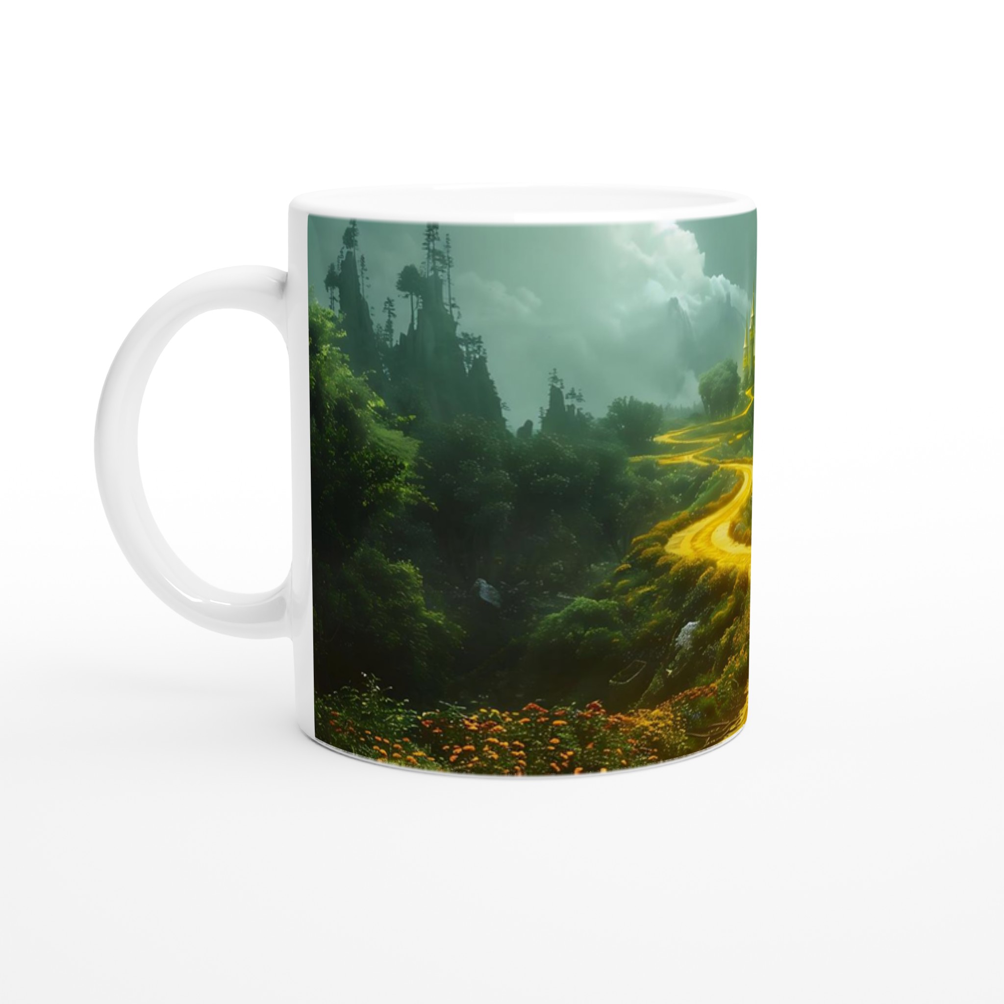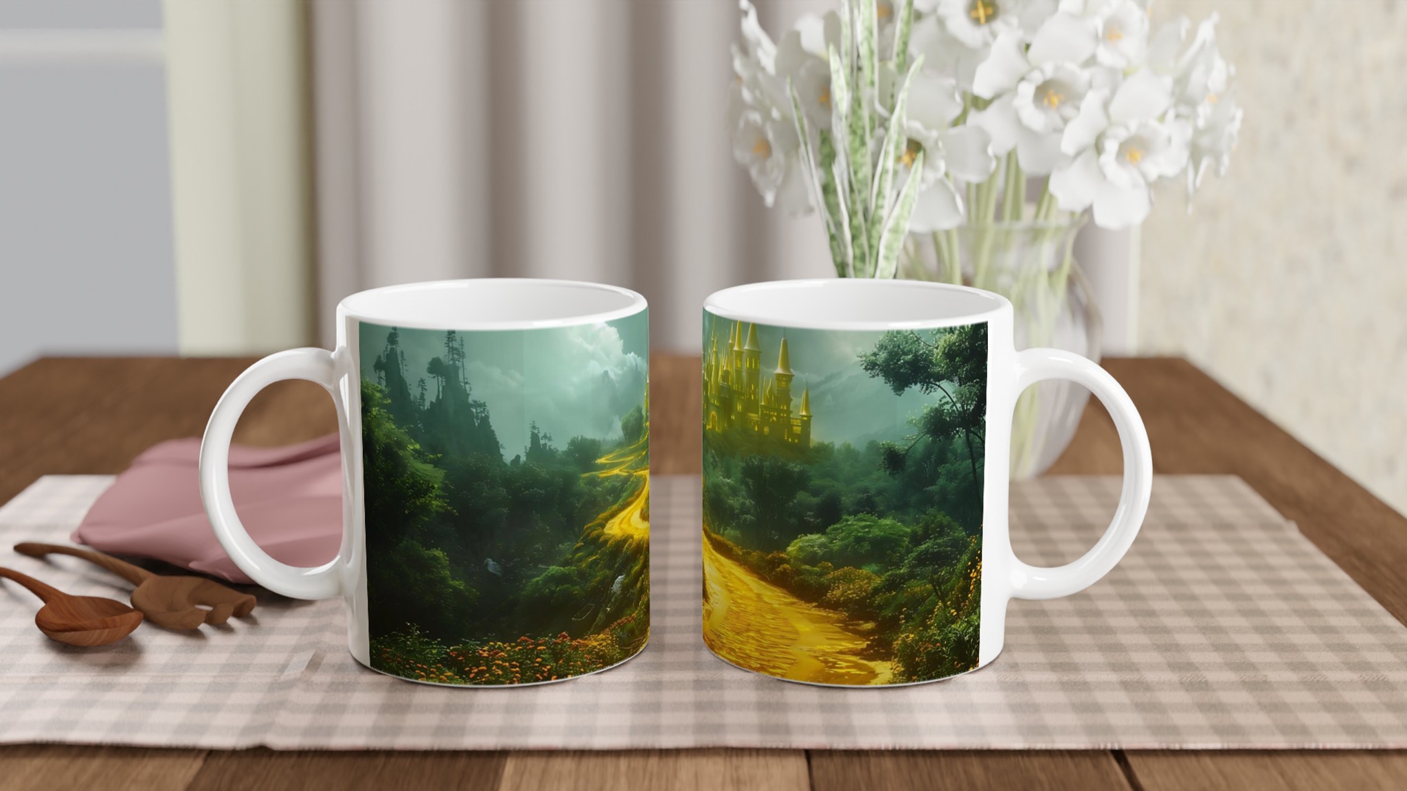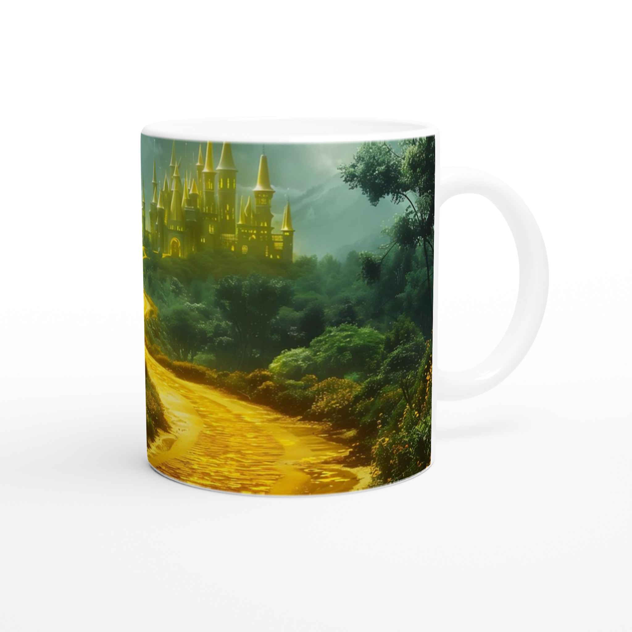 Stig in i en värld av förtrollning varje gång du lyfter din kopp! Den här stilrena keramiska muggen, prydd med ett magnifikt guldslott omgivet av frodig grönska och en skimrande guldväg, blir snabbt en vardagsfavorit. Perfekt för morgonkaffet, kvällens varma choklad, eller när du bara vill njuta av en kopp te medan du drömmer dig bort till magiska riken. Den blanka vita ytan gör att trycken framhävs med klara och levande färger, som håller sig fina även efter många turer i mikron och diskmaskinen.