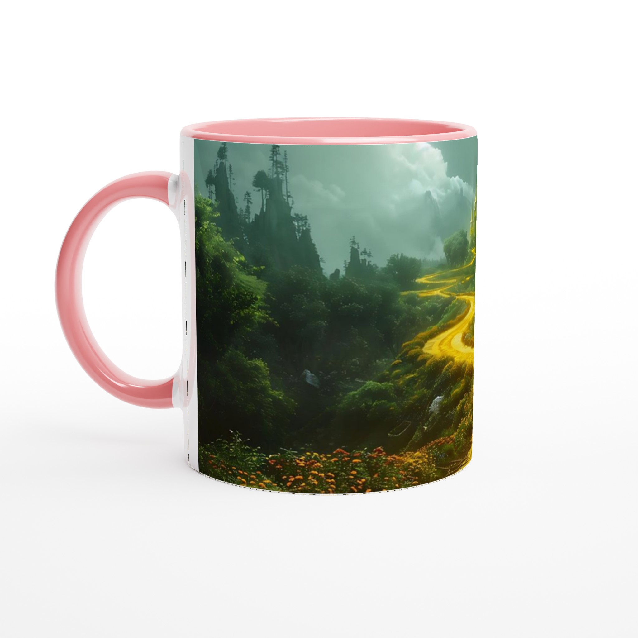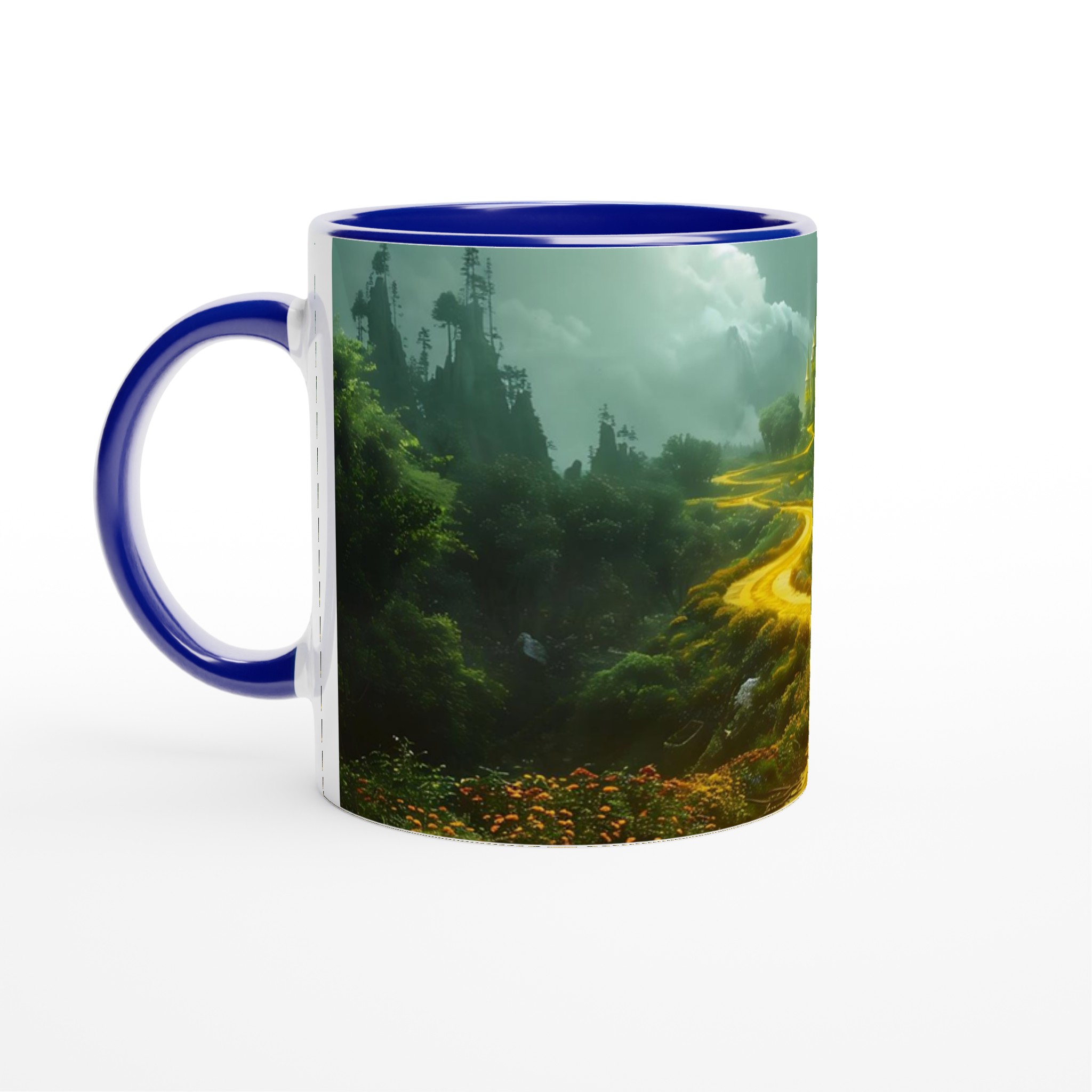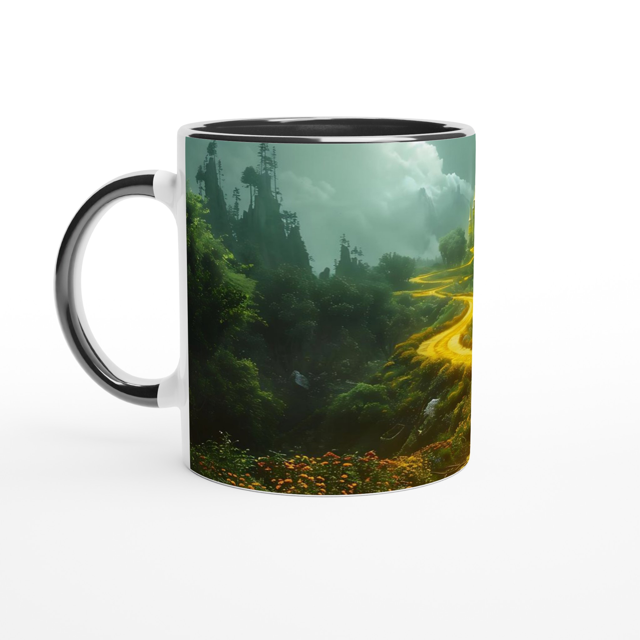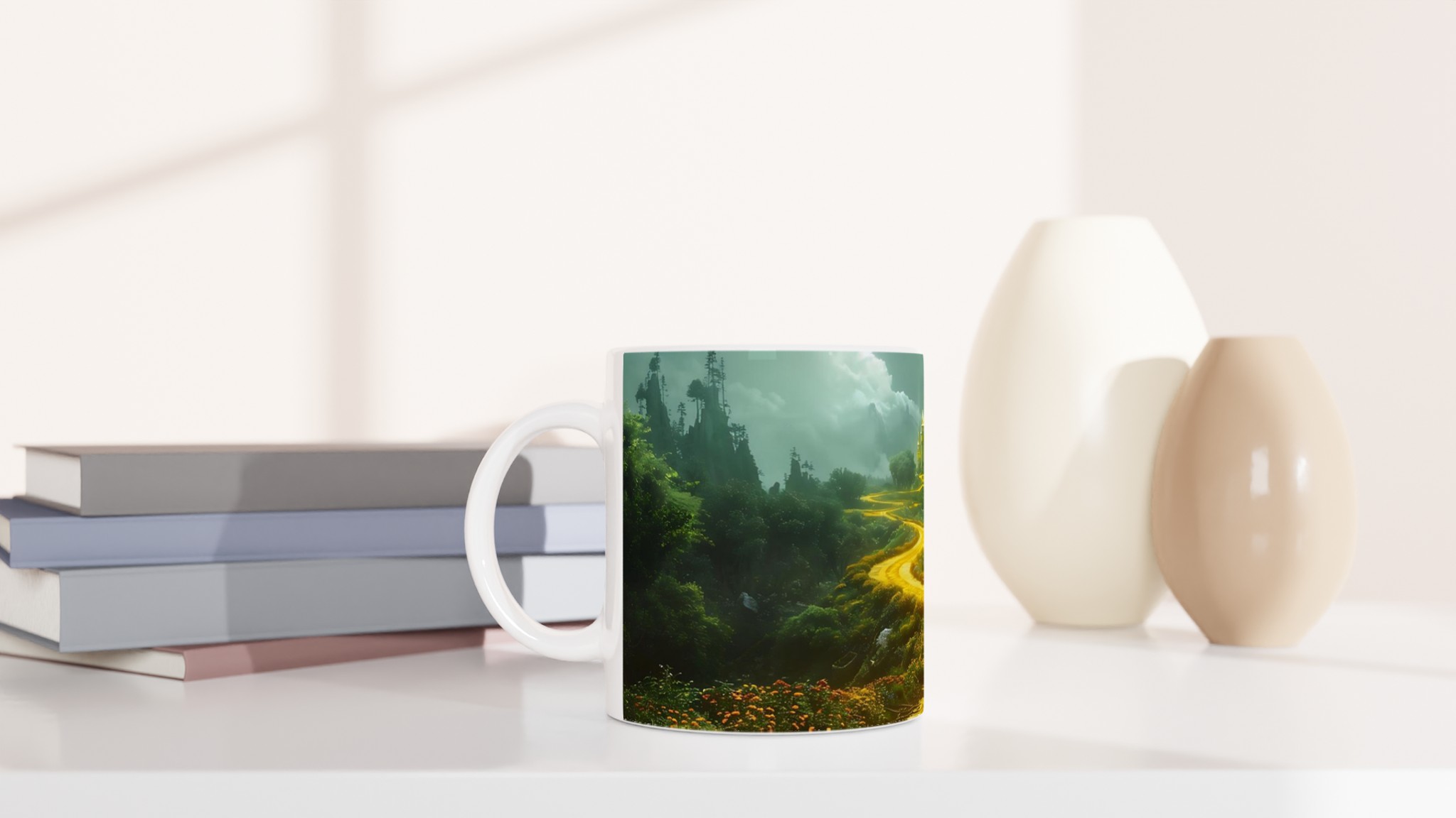 Stig in i en värld av förtrollning varje gång du lyfter din kopp! Den här stilrena keramiska muggen, prydd med ett magnifikt guldslott omgivet av frodig grönska och en skimrande guldväg, blir snabbt en vardagsfavorit. Perfekt för morgonkaffet, kvällens varma choklad, eller när du bara vill njuta av en kopp te medan du drömmer dig bort till magiska riken. Den blanka vita ytan gör att trycken framhävs med klara och levande färger, som håller sig fina även efter många turer i mikron och diskmaskinen.