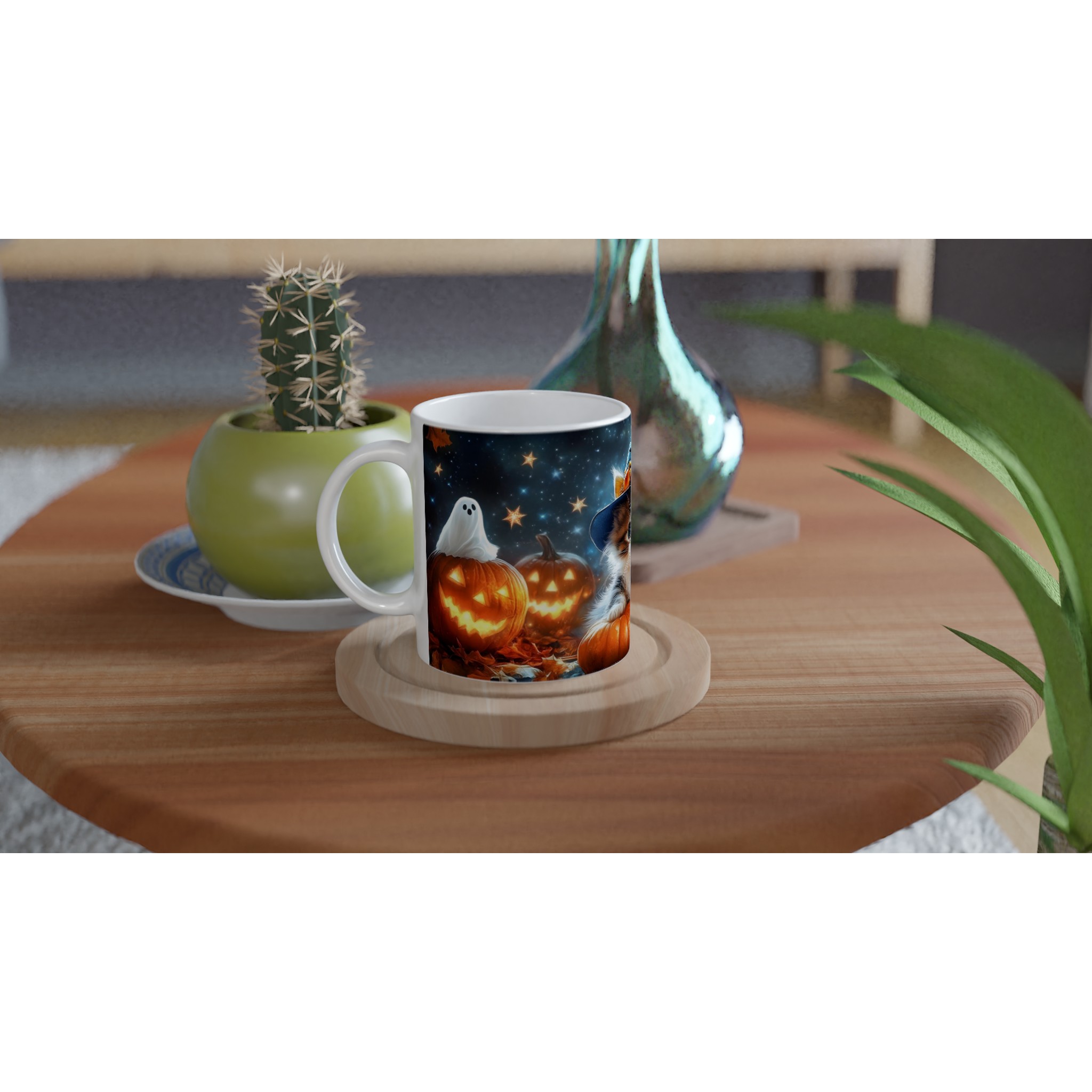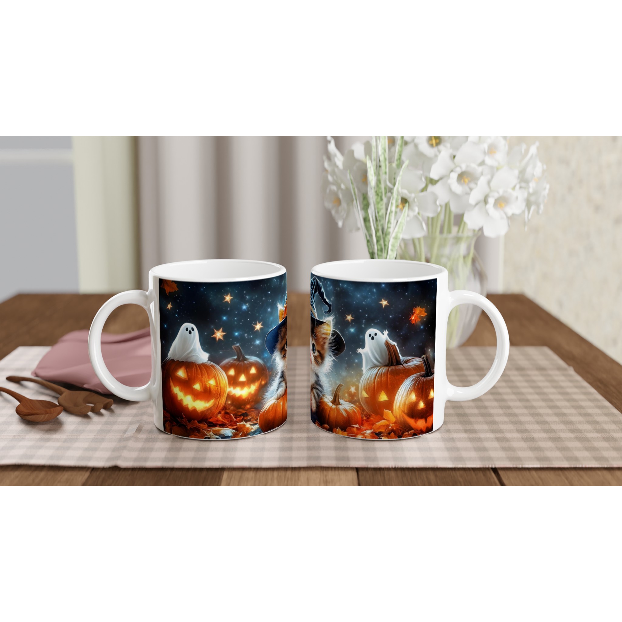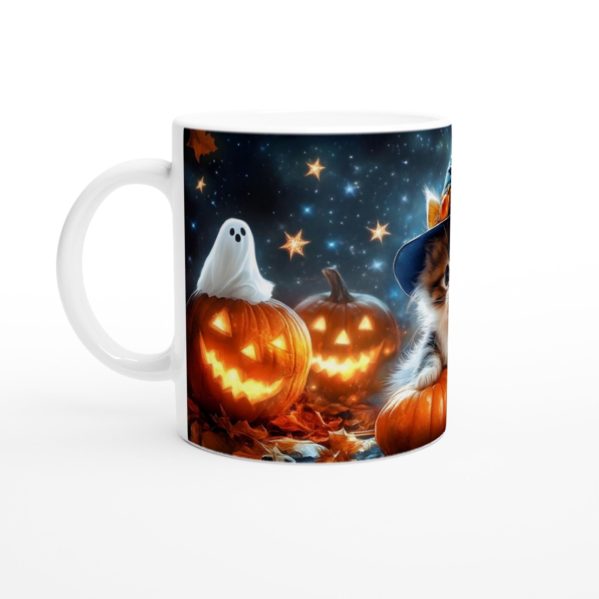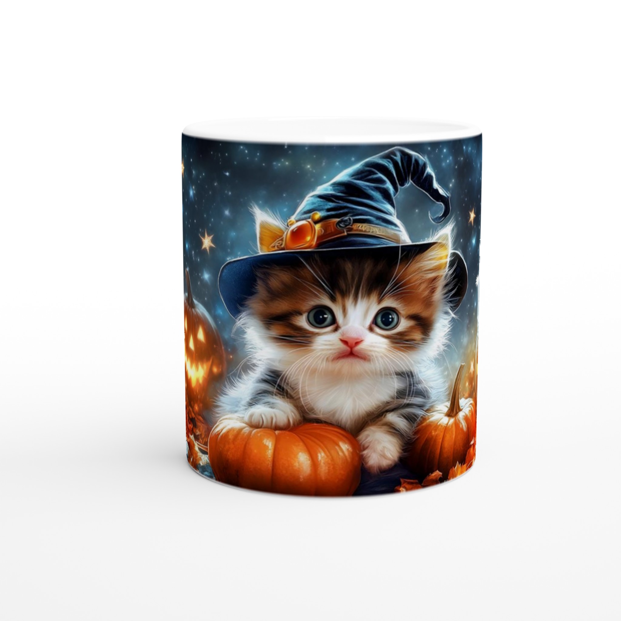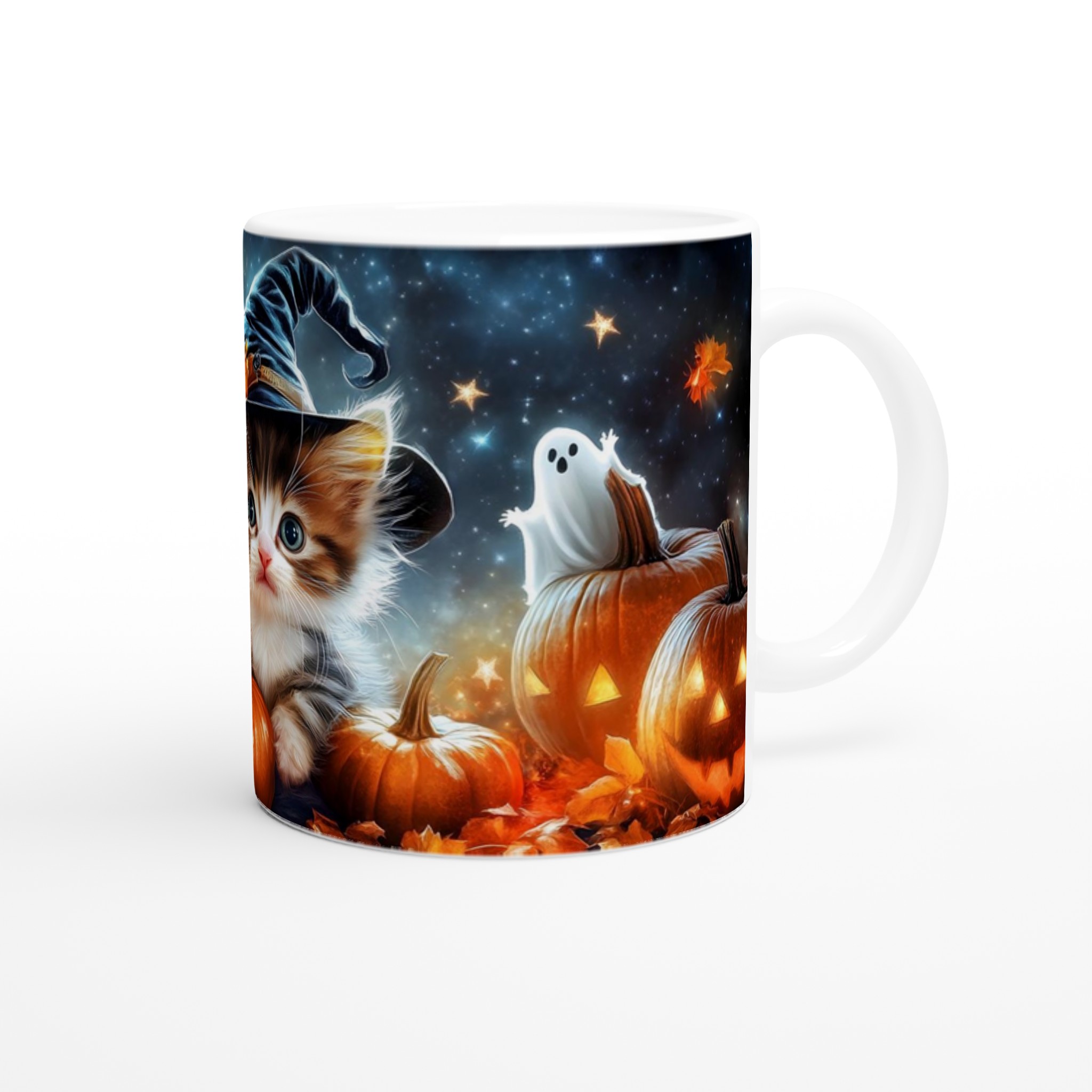Fånga Halloween-stämningen med denna bedårande keramikmugg, prydd med en söt, häxhattsprydd kattunge omgiven av lysande pumpor och busiga spöken under en stjärnklar natthimmel. Denna mugg är perfekt för alla dagens stunder – morgonkaffet, en värmande kopp te eller en härlig varm choklad, och förvandlar varje sipp till en festlig upplevelse.