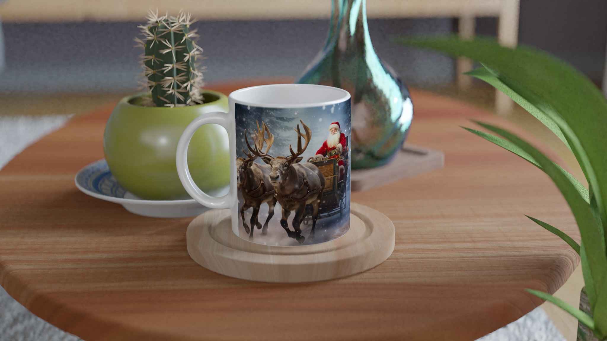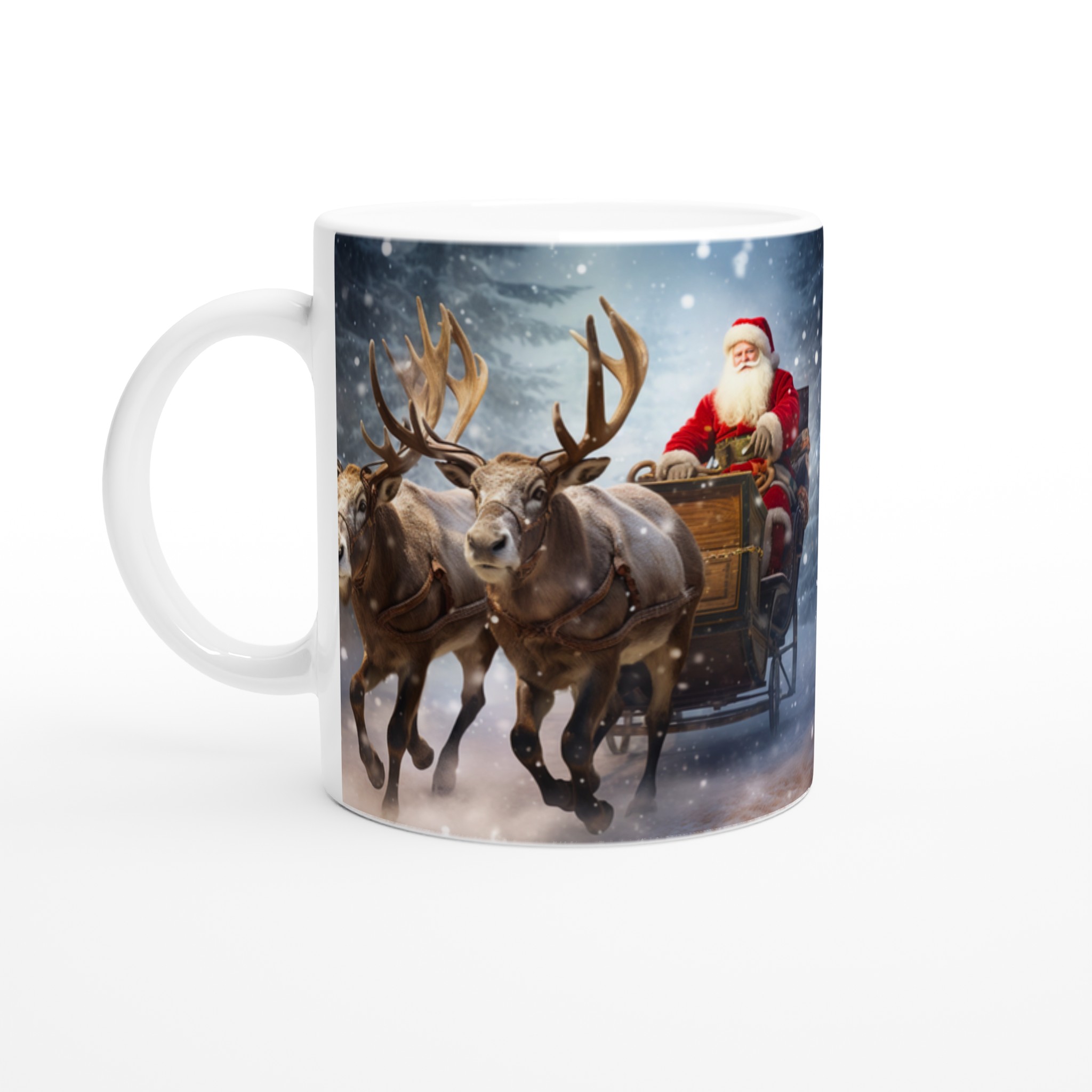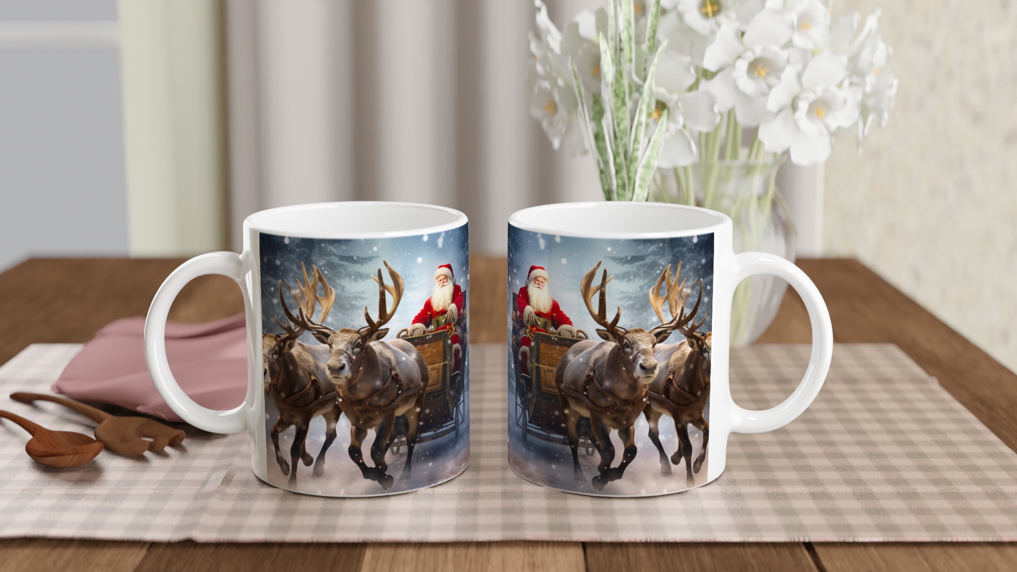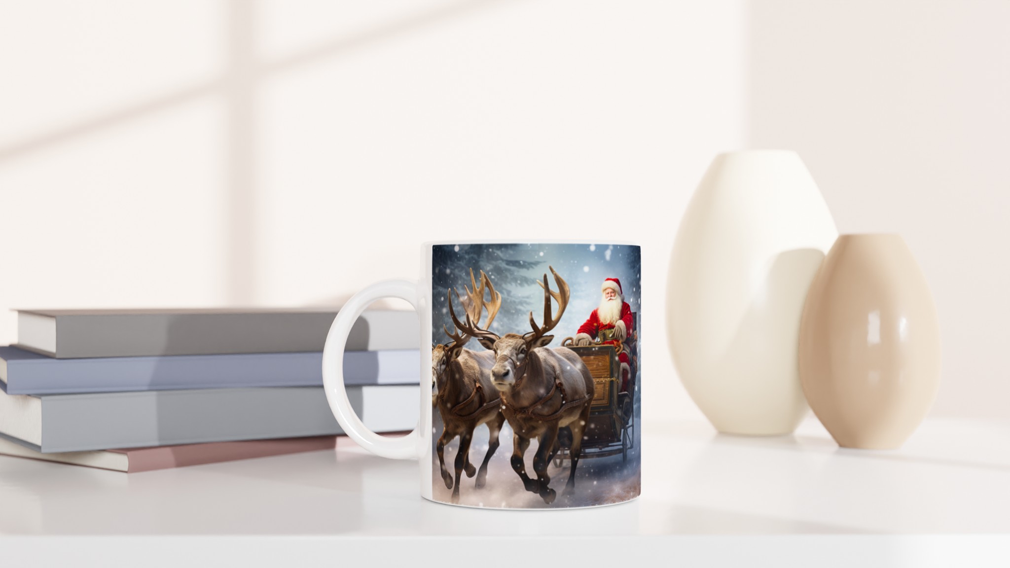 Fånga julens magi varje gång du tar en klunk! Denna förtrollande keramiska mugg transporterar dig direkt till en gnistrande vinternatt med Tomten och hans ståtliga renar, mitt i ett stilla snöfall. Perfekt för morgonkaffet som värmer själen, kvällens mysiga varma choklad, eller när du bara vill njuta av en kopp te medan snöflingorna faller utanför ditt fönster. Den blanka ytan framhäver det detaljrika vinterlandskapet med klara och levande färger, som håller sig fina även efter otaliga turer i mikron och diskmaskinen.
