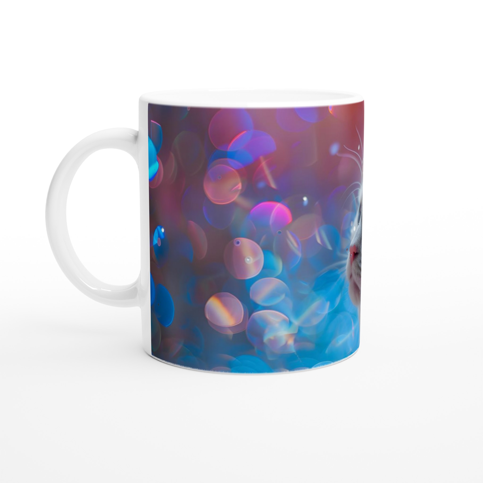 Fånga den drömska magin varje dag med vår förtrollande keramikmugg! Denna mugg är prydd med en vit katt mot en bakgrund av skimrande, drömska bokeh-ljus i toner av rosa, lila och blått. De gnistrande detaljerna och den eteriska känslan gör varje klunk till en liten flykt. Det är den perfekta muggen för ditt morgonkaffe, en värmande kopp te eller en härlig varm choklad som lyfter sinnet och inspirerar till dagdrömmar.