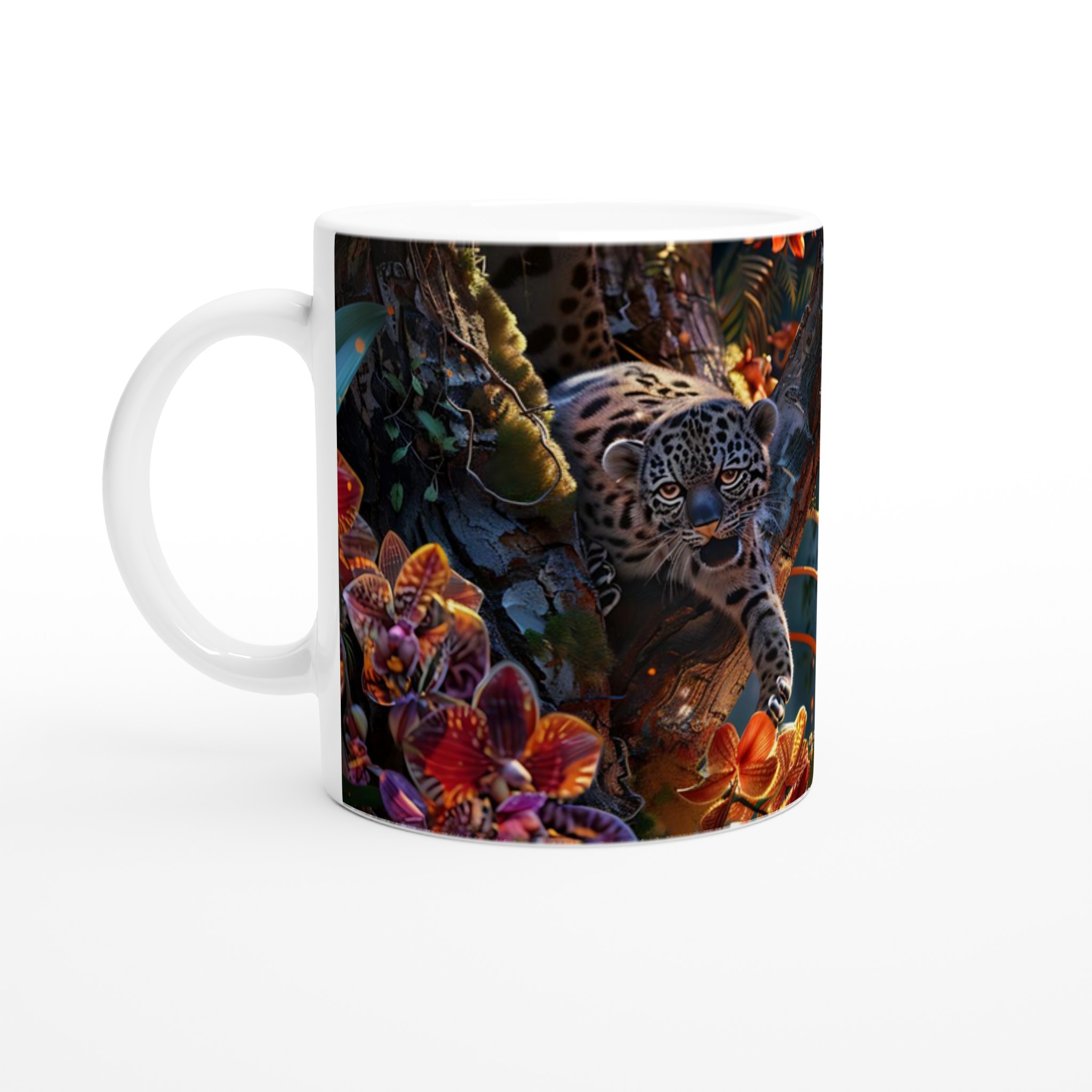 Föreställ dig en bedårande leopardunge som smyger genom en magisk djungel fylld med glödande orkidéer och mystiskt ljus. Denna design fångar den vilda naturens charm och äventyrets lockelse, perfekt för att ge din fikastund en unik karaktär. Den blanka vita ytan ger ett skarpt och levande tryck som verkligen sticker ut, oavsett om det är en personlig design, ett roligt citat eller en present till någon du tycker om.