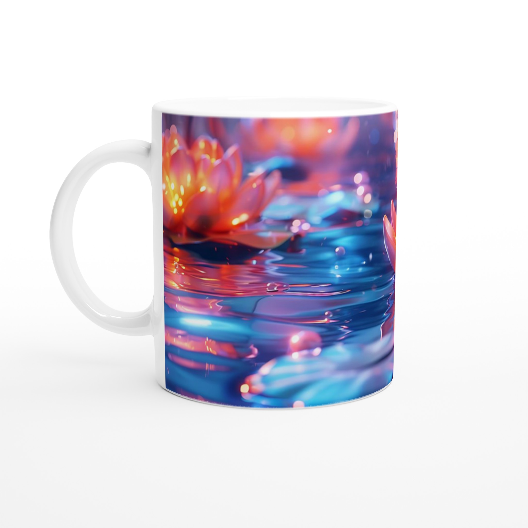 Inspirerad av den förtrollande skönheten hos lysande lotusblommor som svävar på ett magiskt vatten, fångar denna mugg en drömsk och lugnande atmosfär med sina livfulla nyanser av korall, lila och turkos. Den blanka vita ytan ger ett skarpt och levande tryck som verkligen sticker ut, oavsett om det är en personlig design, ett roligt citat eller en present till någon du tycker om.