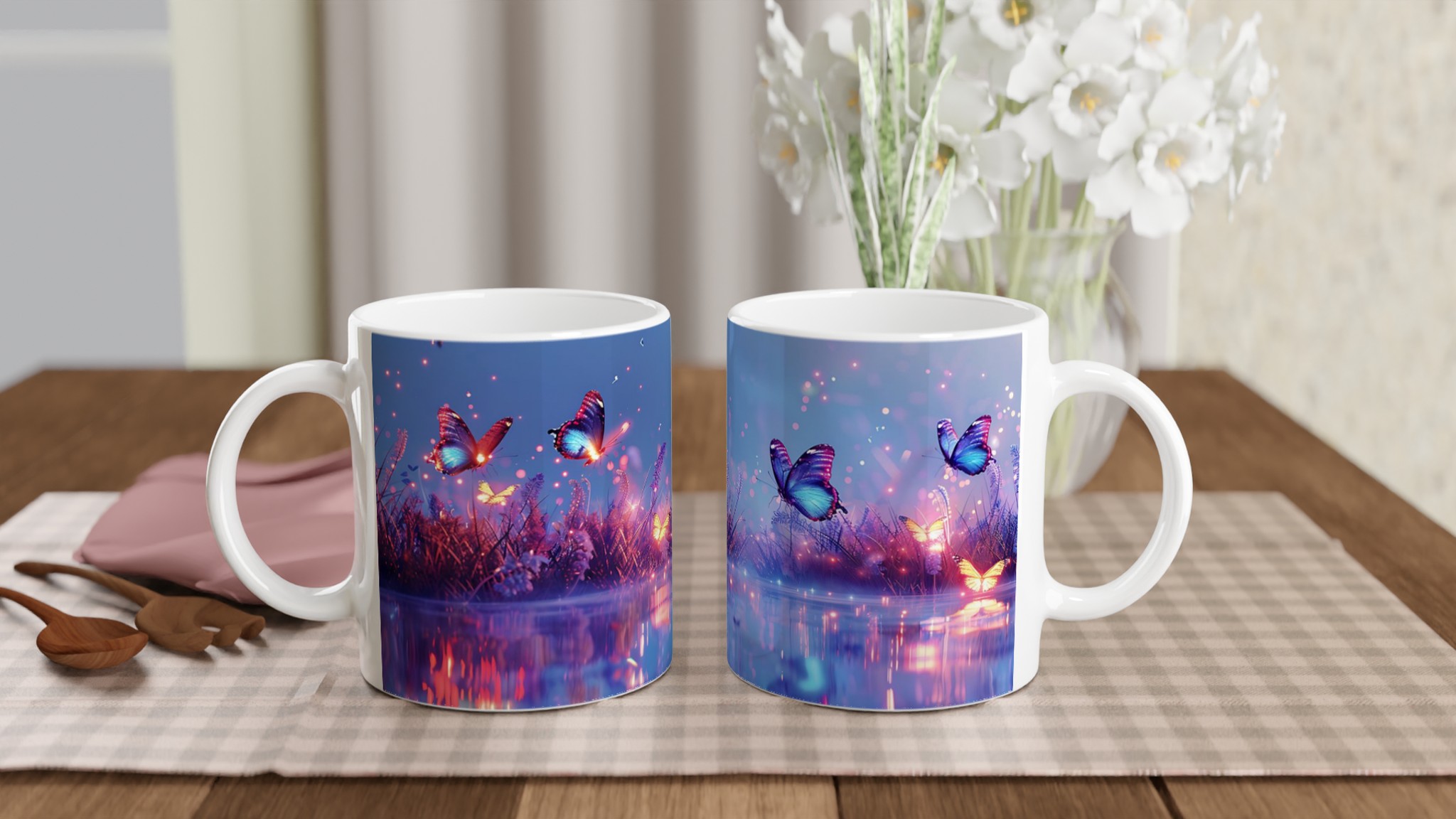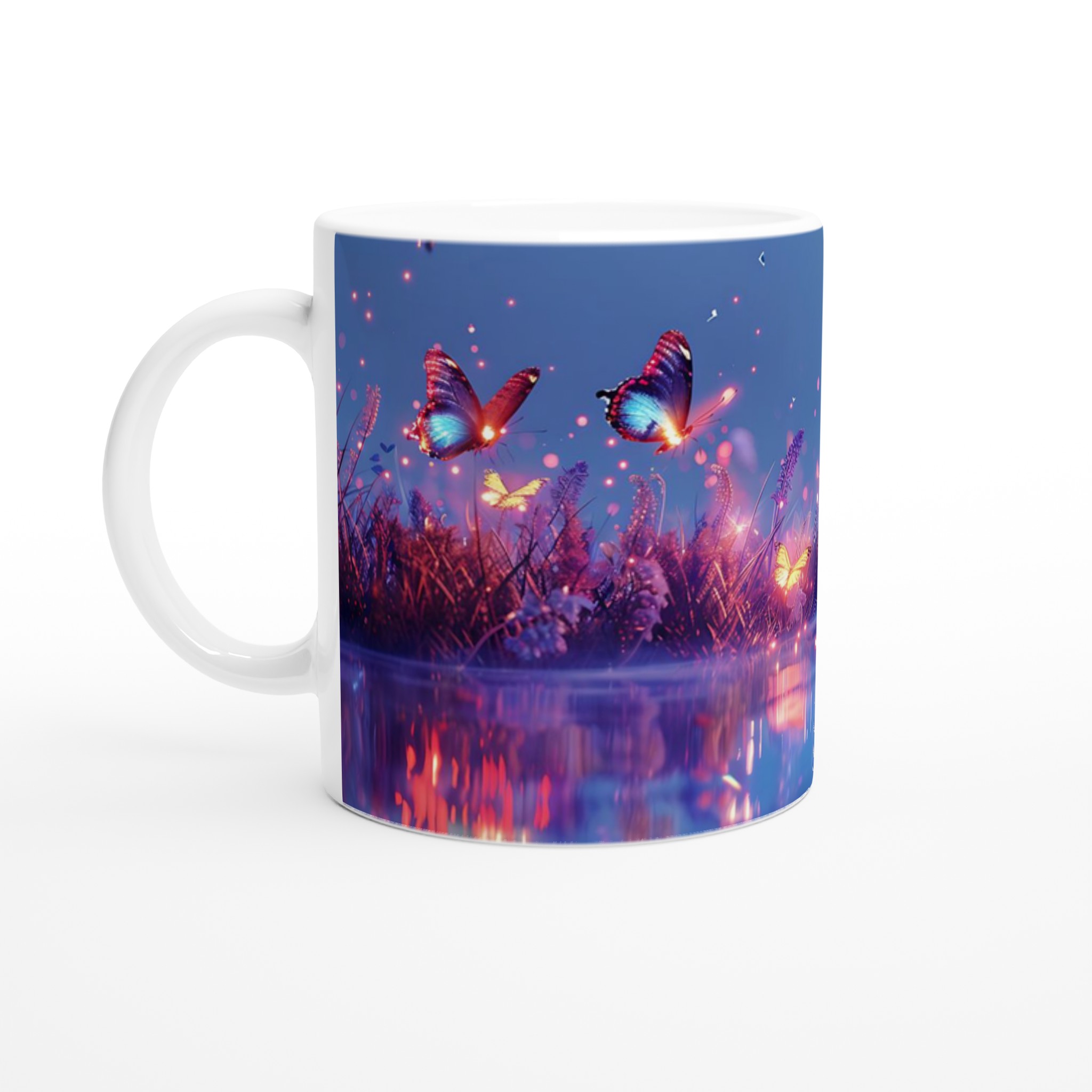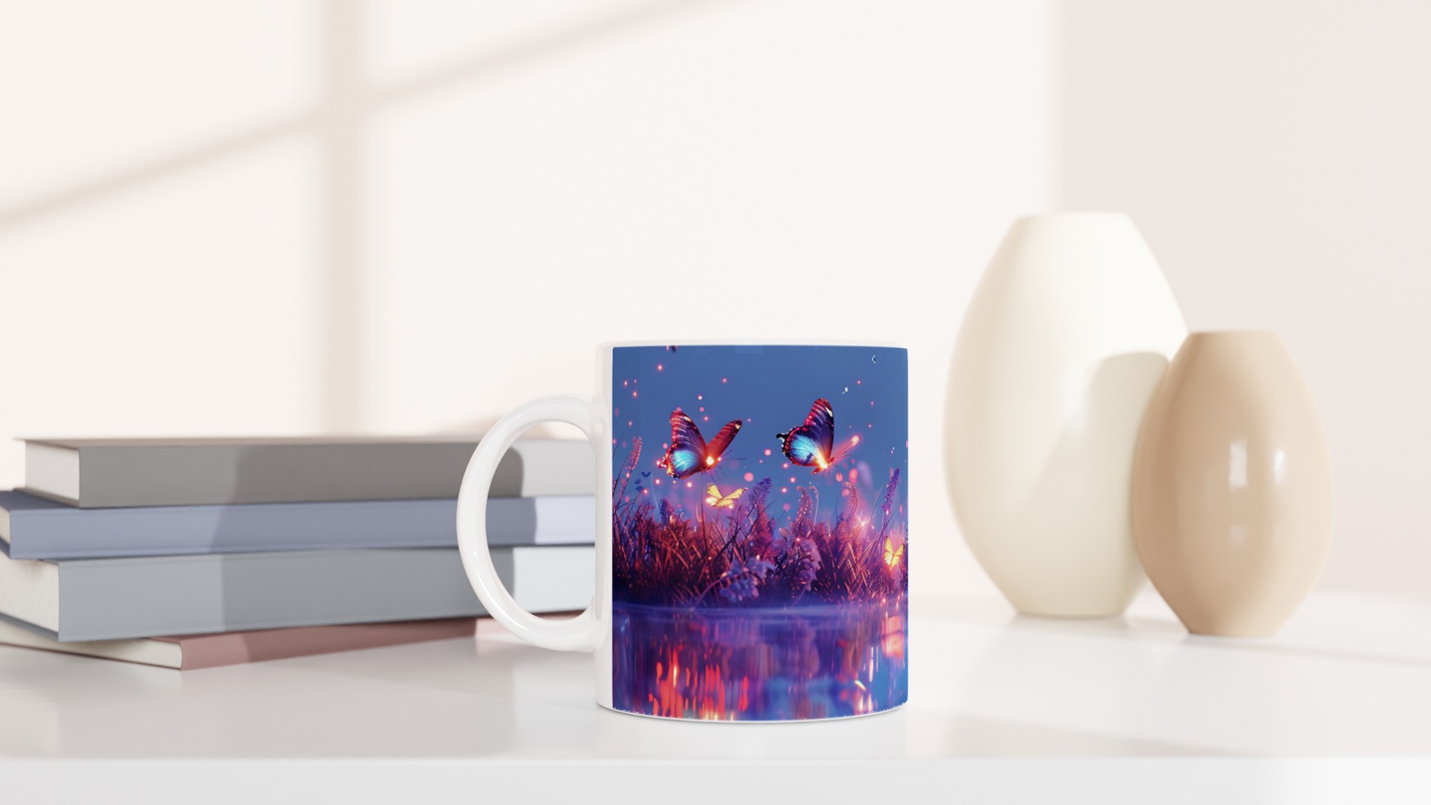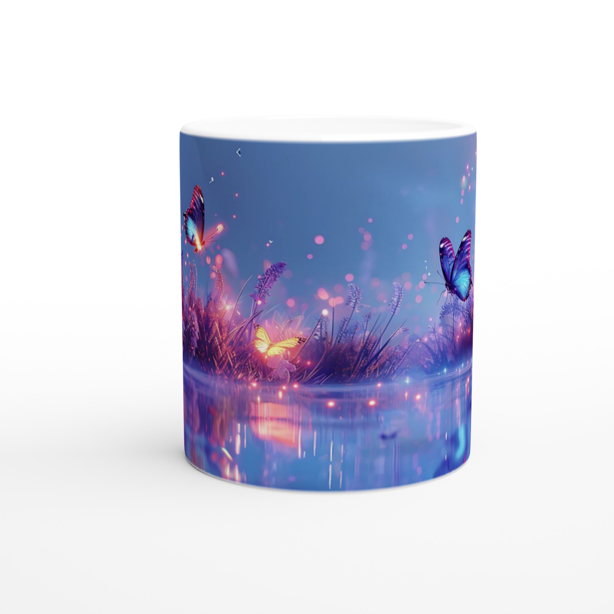 Fånga den magiska stämningen från en sommarnatt med fjärilar som dansar över vattnet med vår förtrollande keramiska mugg. Varje klunk blir en flykt till en drömlik trädgård, perfekt för ditt morgonkaffe, kvällens mysiga choklad, eller en avkopplande kopp te. Den blanka ytan framhäver de levande färgerna från designen och garanterar att den håller sig vacker, även efter otaliga turer i mikron och diskmaskinen.