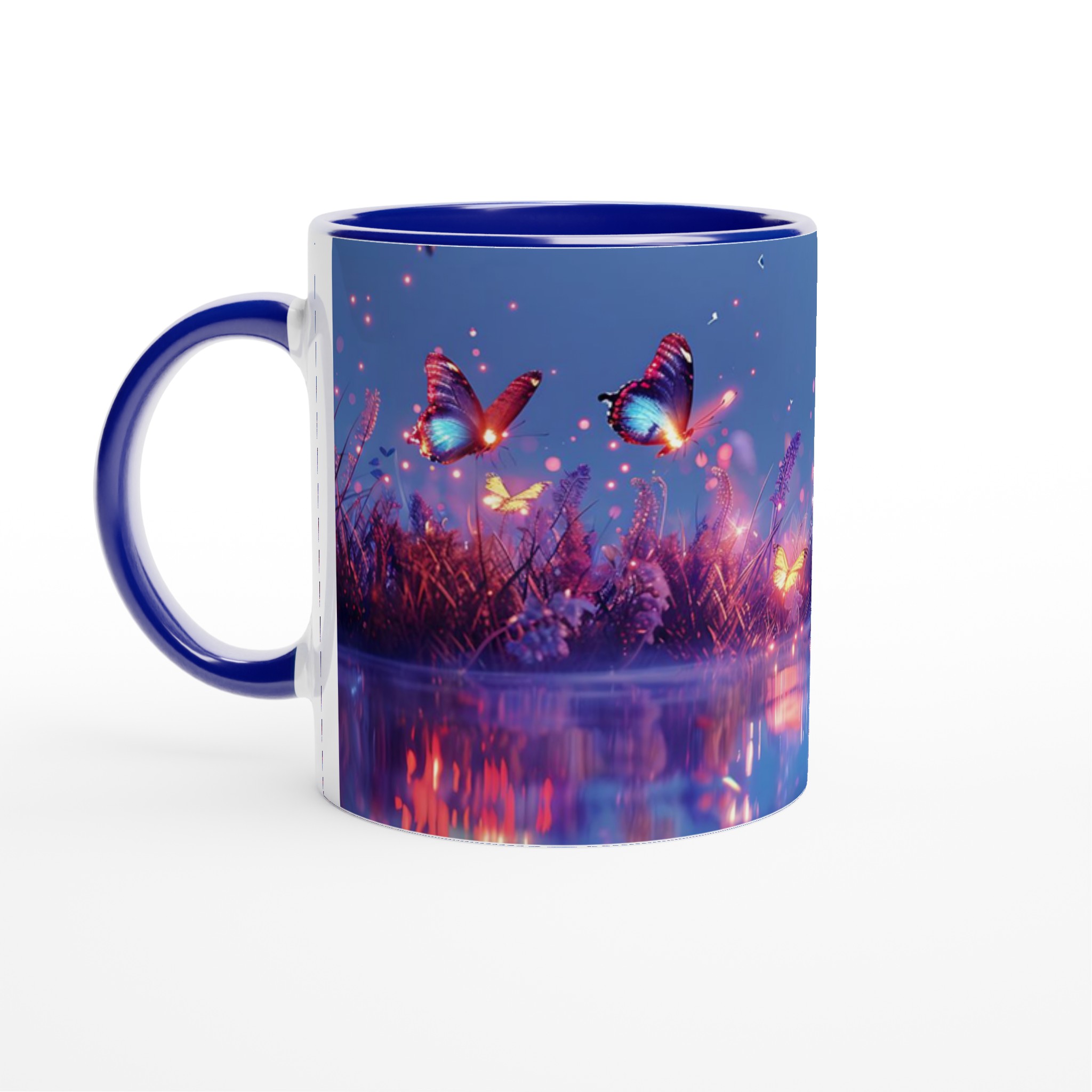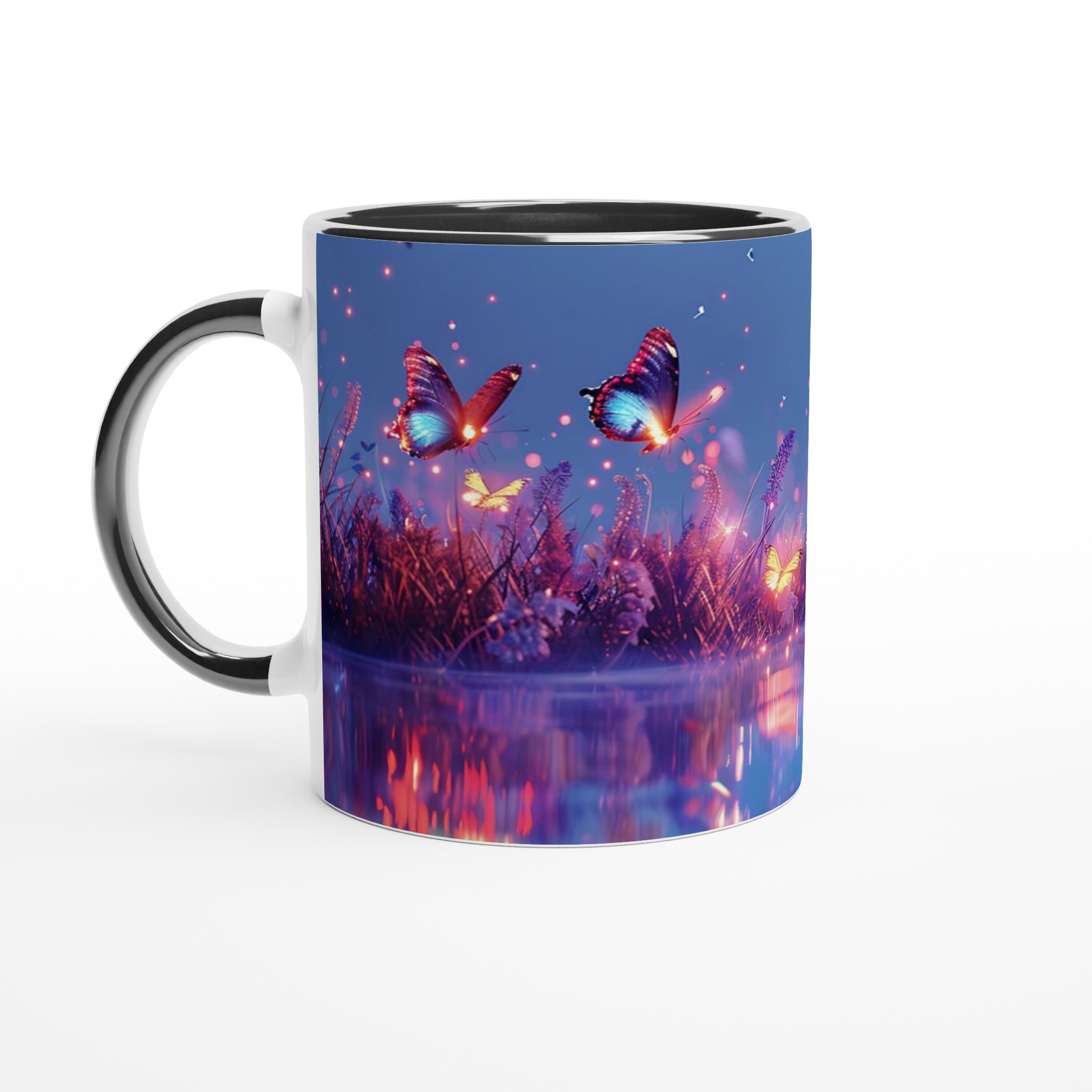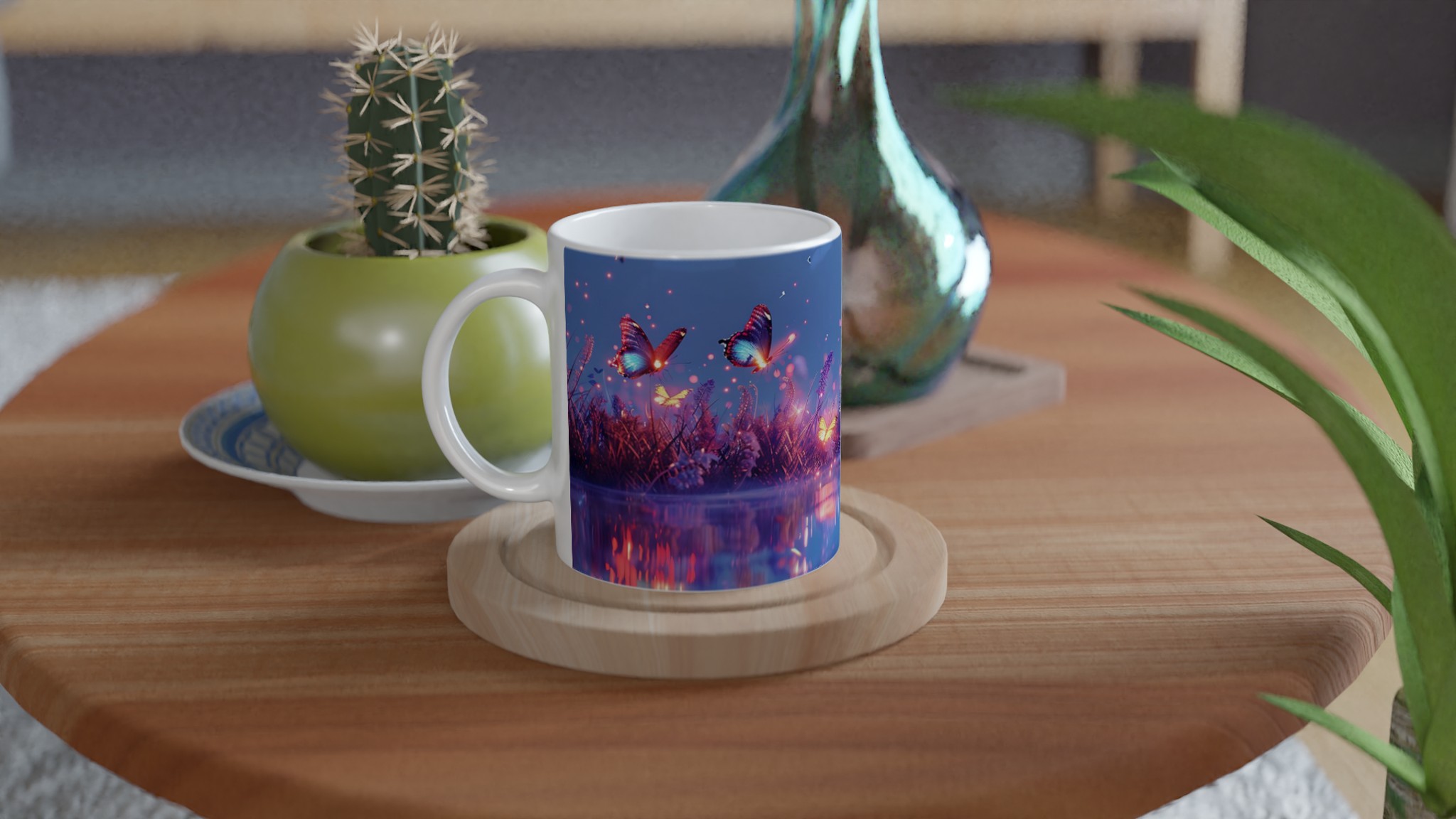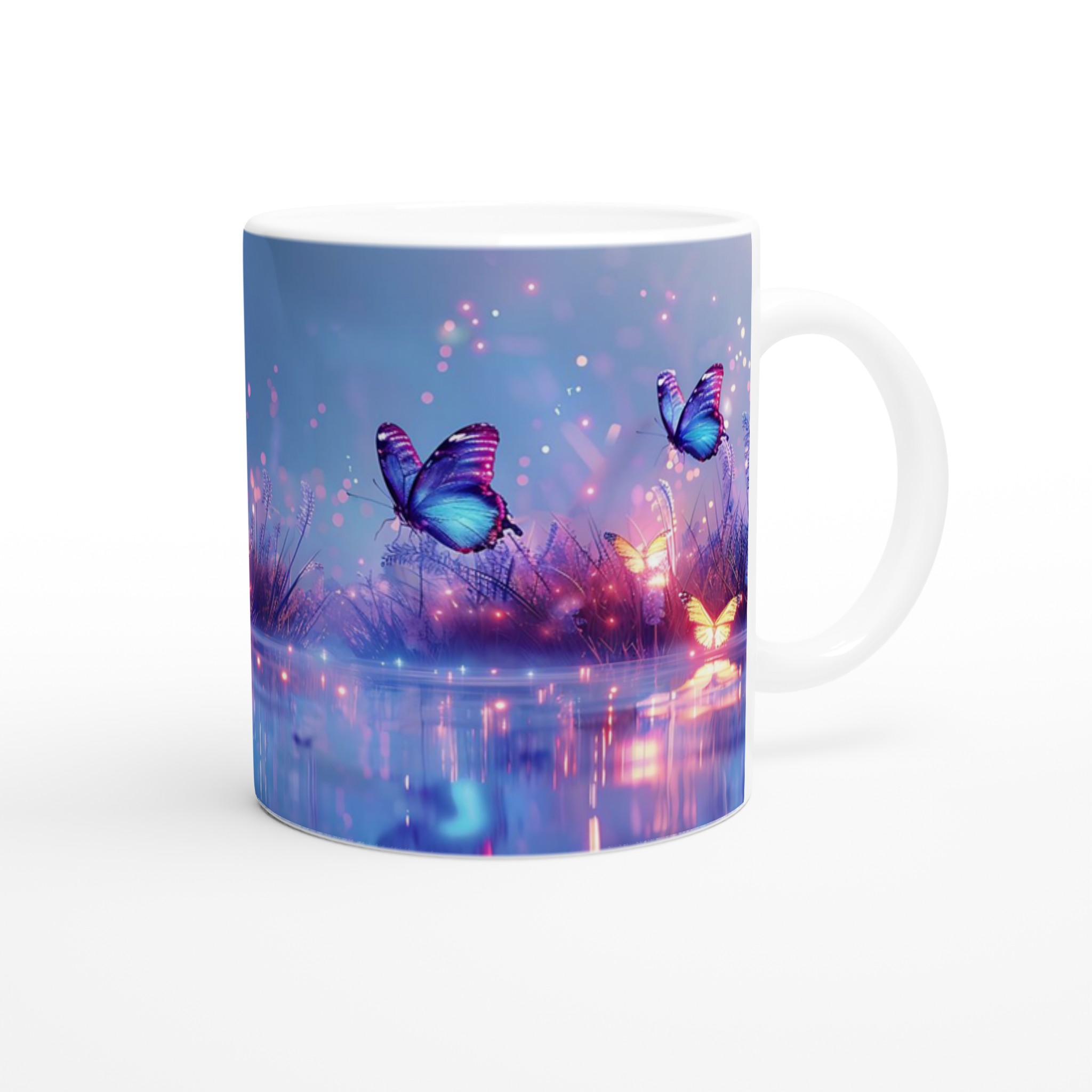 Fånga den magiska stämningen från en sommarnatt med fjärilar som dansar över vattnet med vår förtrollande keramiska mugg. Varje klunk blir en flykt till en drömlik trädgård, perfekt för ditt morgonkaffe, kvällens mysiga choklad, eller en avkopplande kopp te. Den blanka ytan framhäver de levande färgerna från designen och garanterar att den håller sig vacker, även efter otaliga turer i mikron och diskmaskinen.