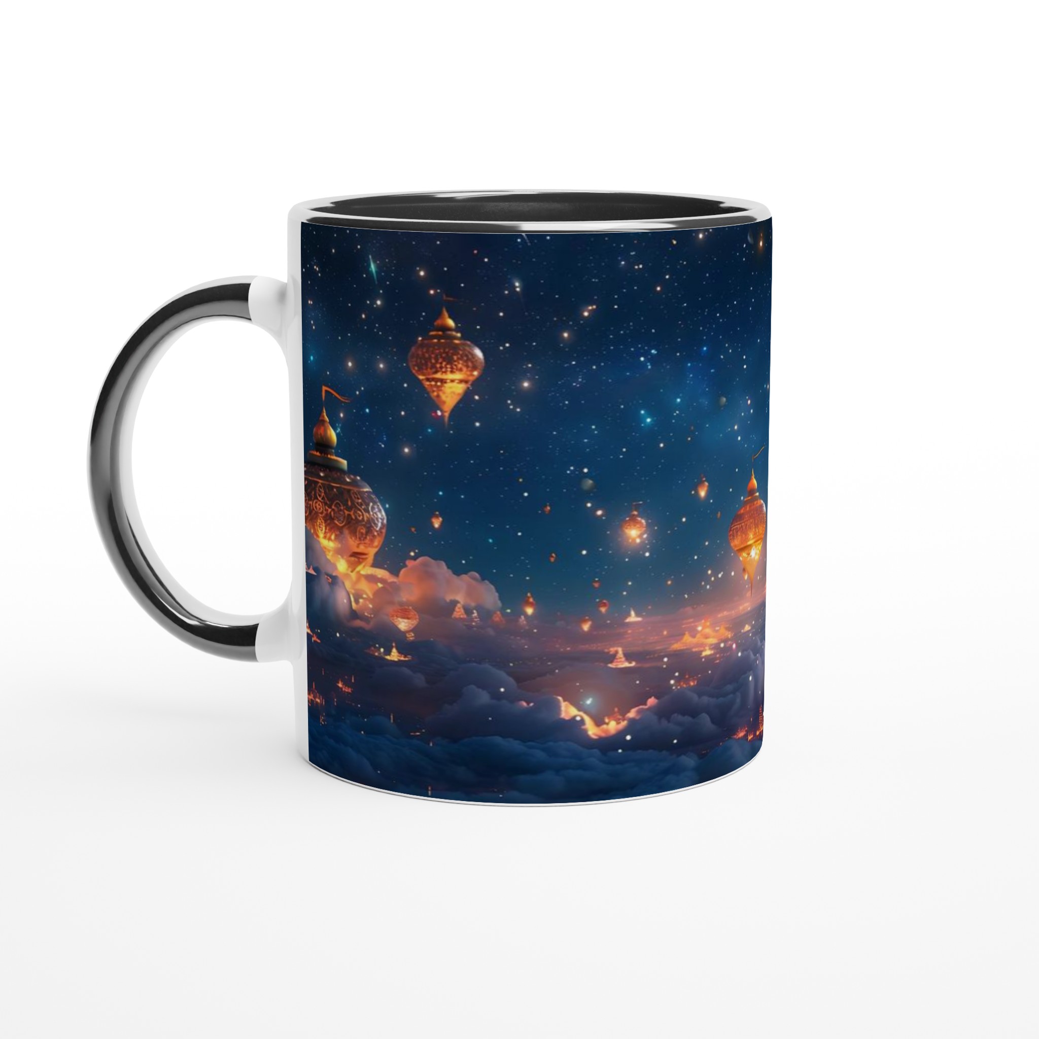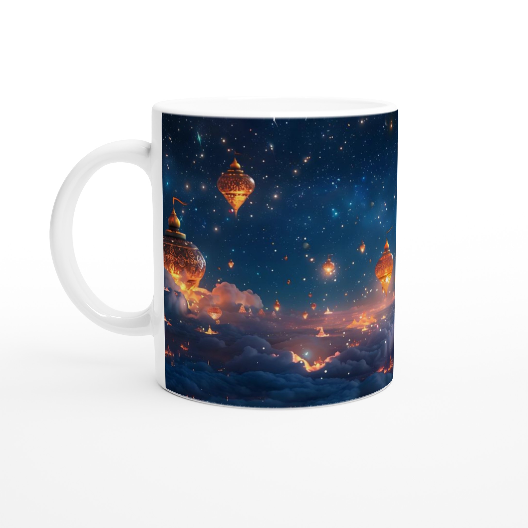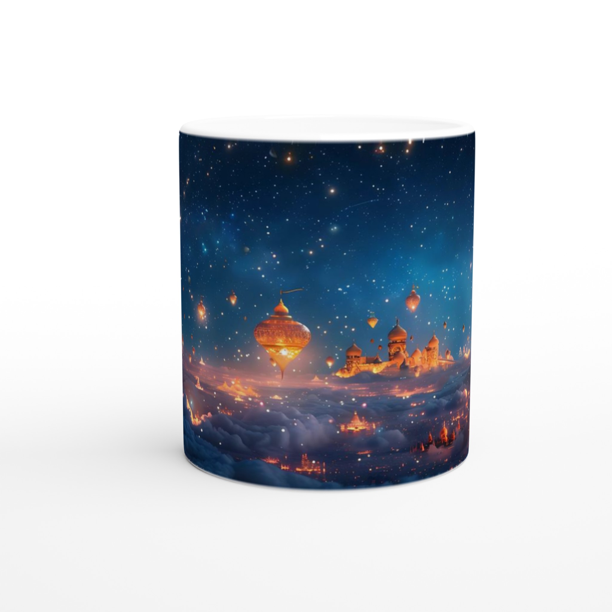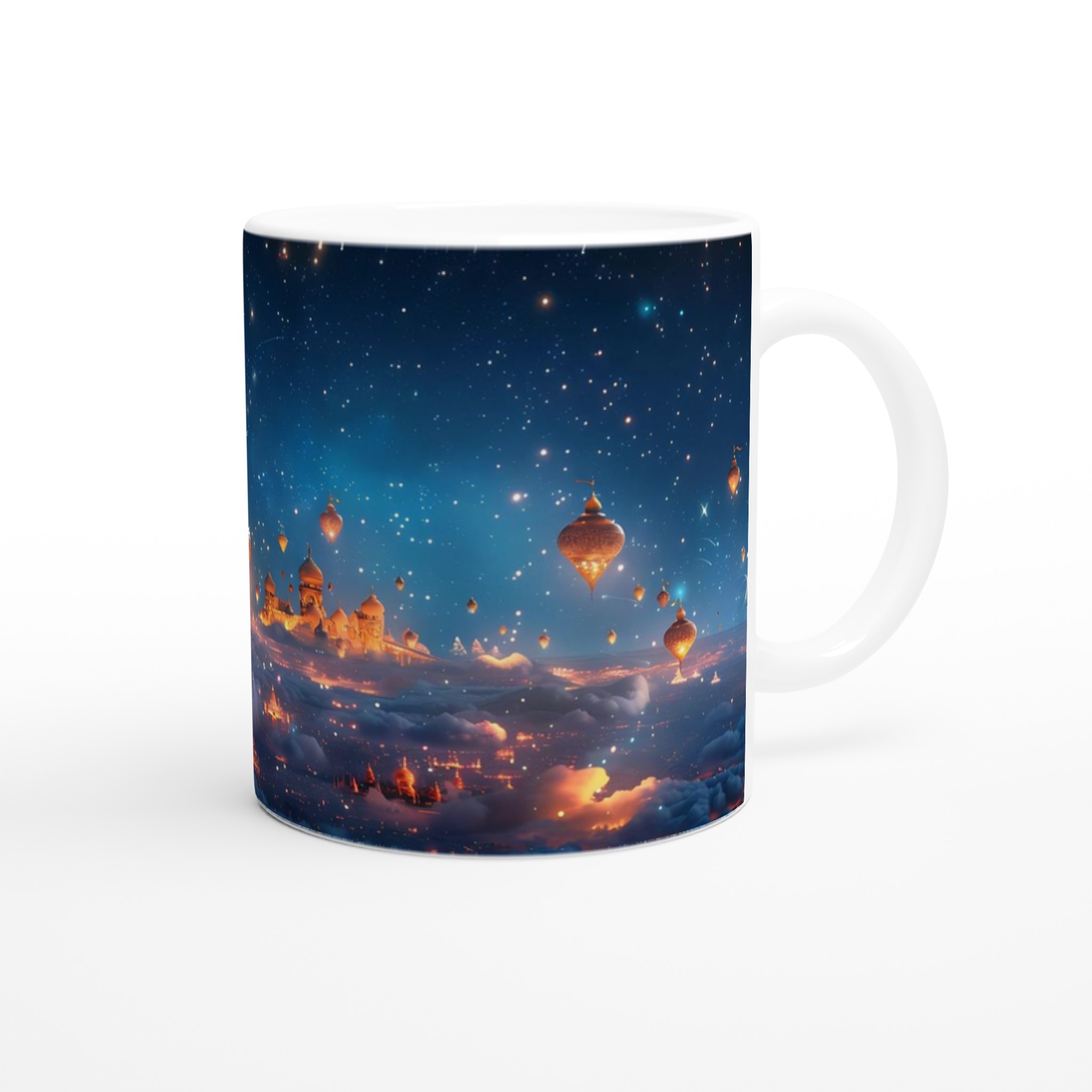 Föreställ dig att du svävar över en förtrollad stad, upplyst under en gnistrande stjärnhimmel. Denna keramiska mugg fångar den magiska känslan av en natt fylld av under och äventyr. Med sin drömska design är den mer än bara en mugg – det är en inbjudan att drömma dig bort med varje klunk, perfekt för att starta morgonen med inspiration eller avsluta kvällen med en lugn stund.