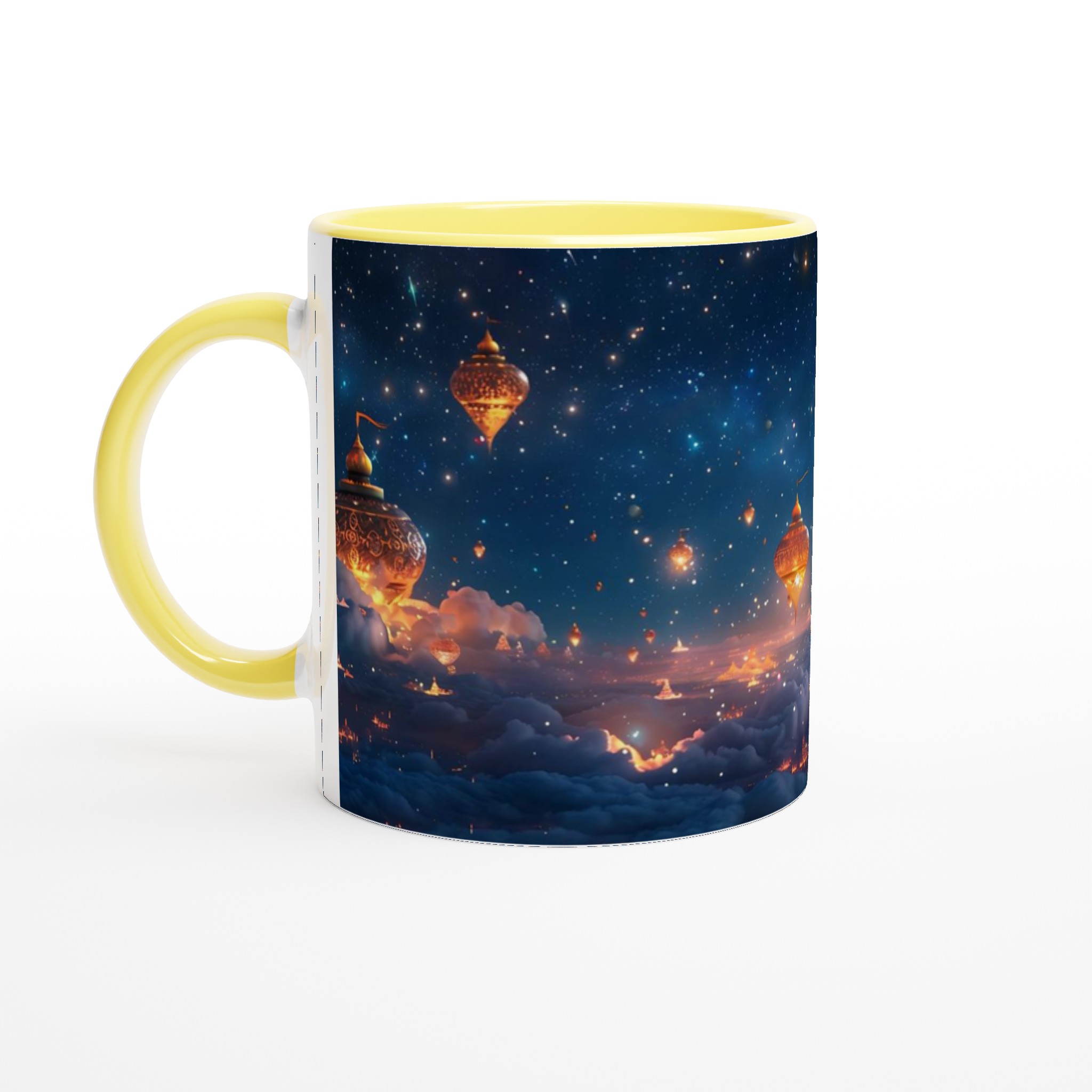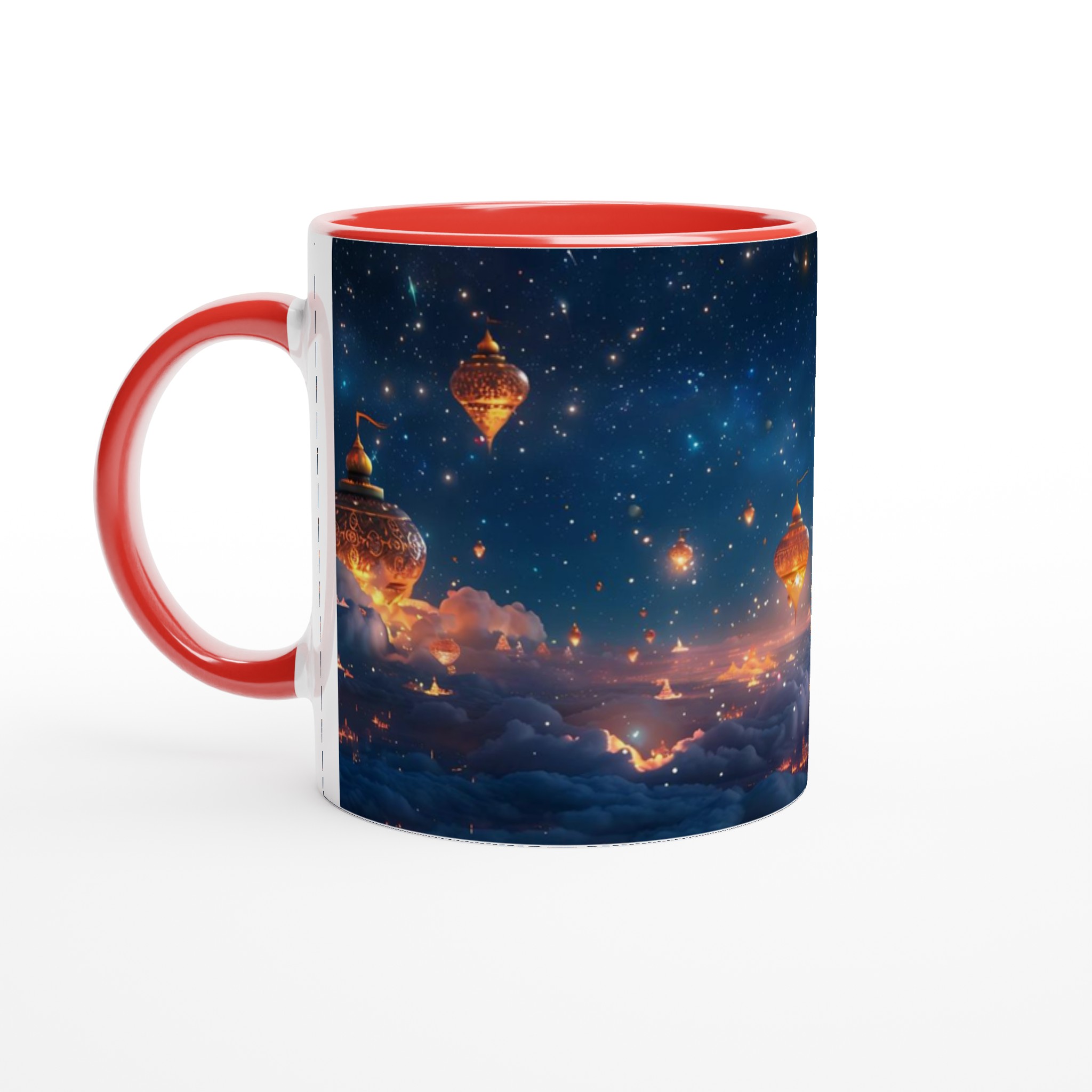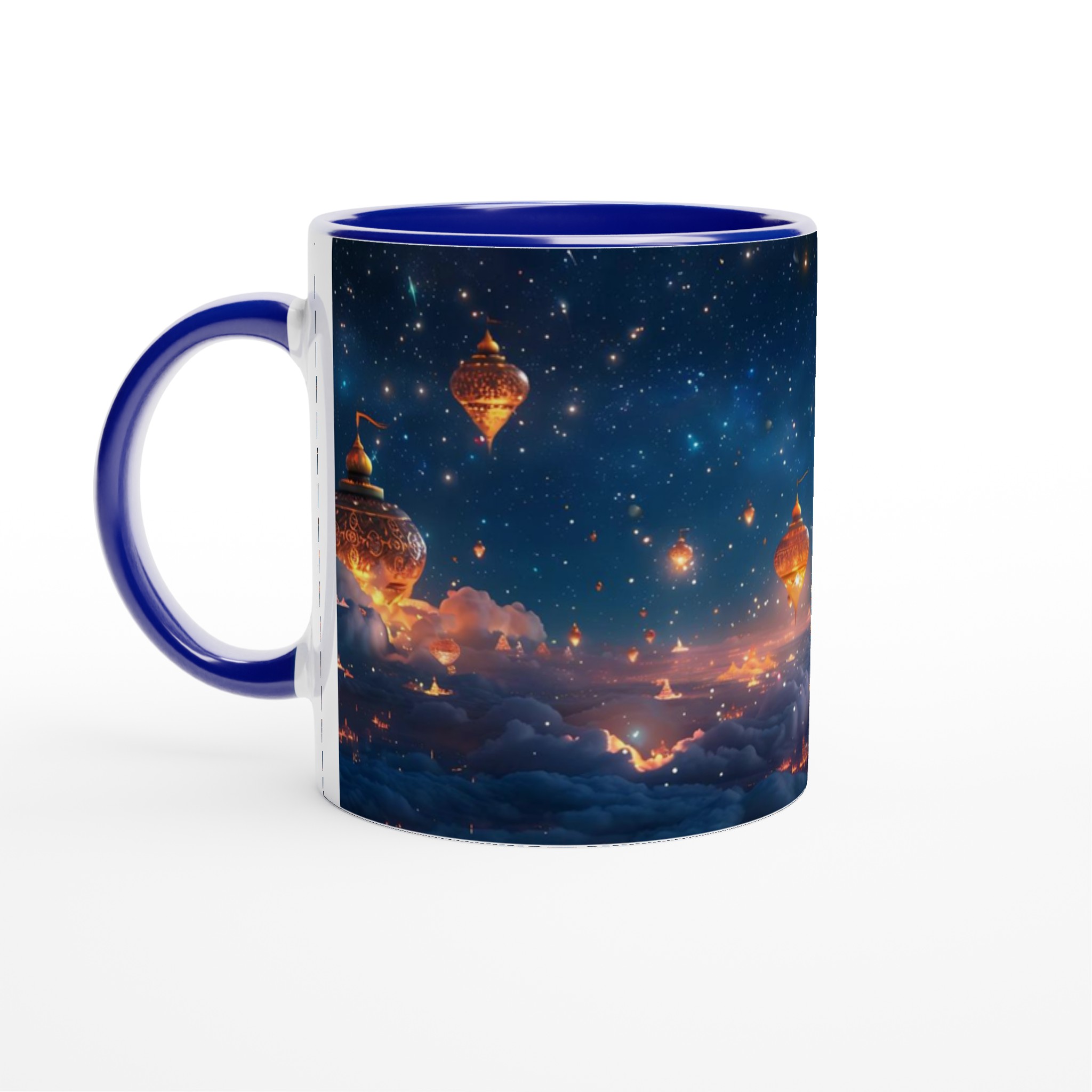 Föreställ dig att du svävar över en förtrollad stad, upplyst under en gnistrande stjärnhimmel. Denna keramiska mugg fångar den magiska känslan av en natt fylld av under och äventyr. Med sin drömska design är den mer än bara en mugg – det är en inbjudan att drömma dig bort med varje klunk, perfekt för att starta morgonen med inspiration eller avsluta kvällen med en lugn stund.