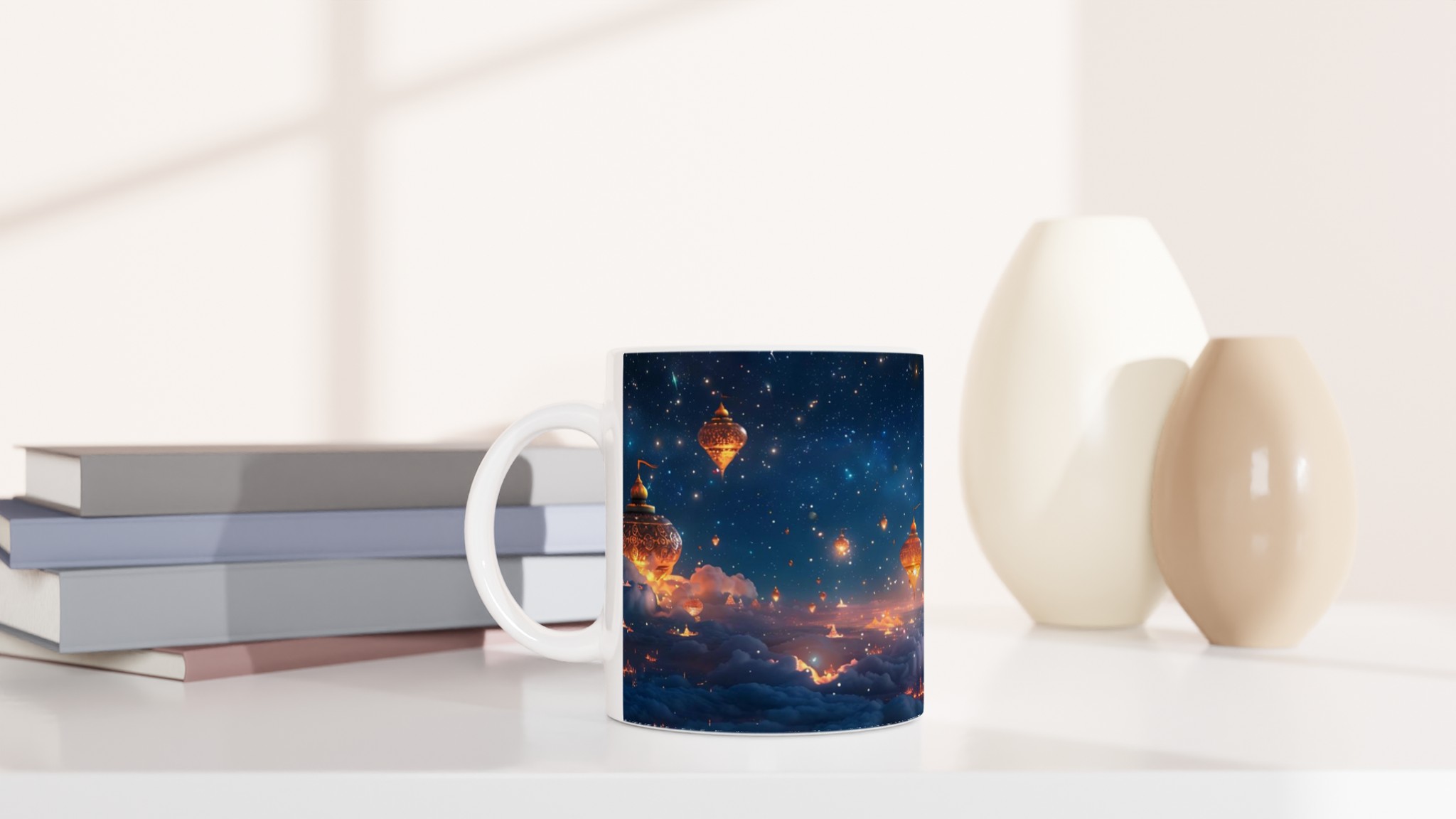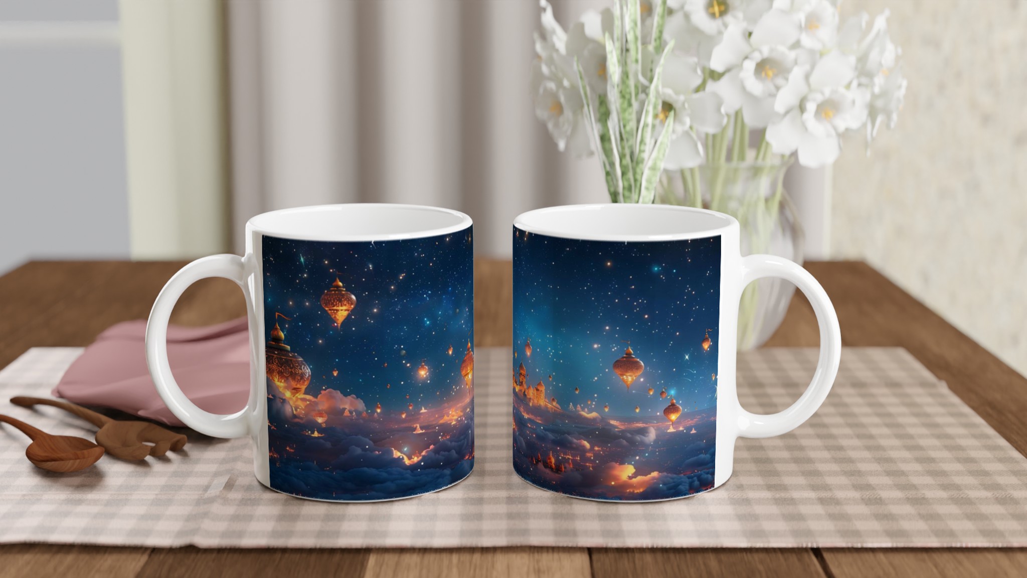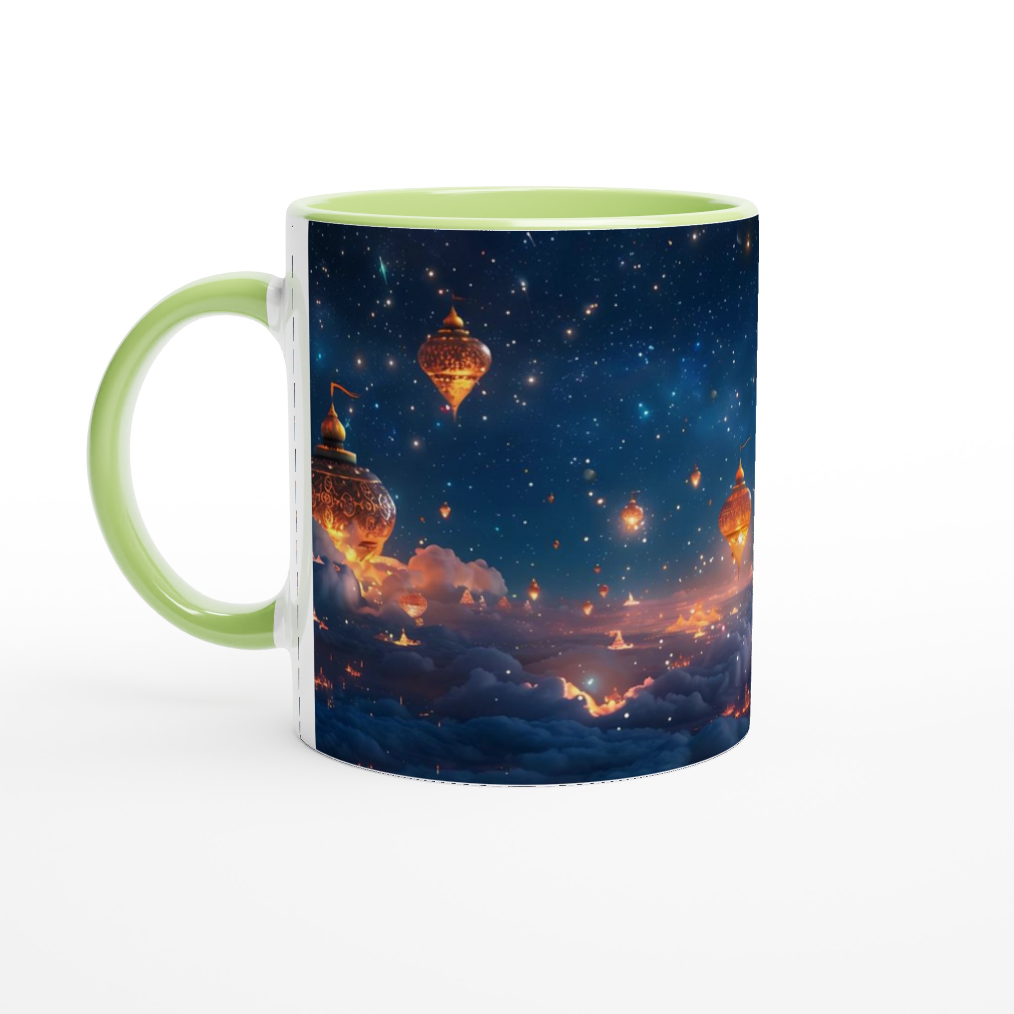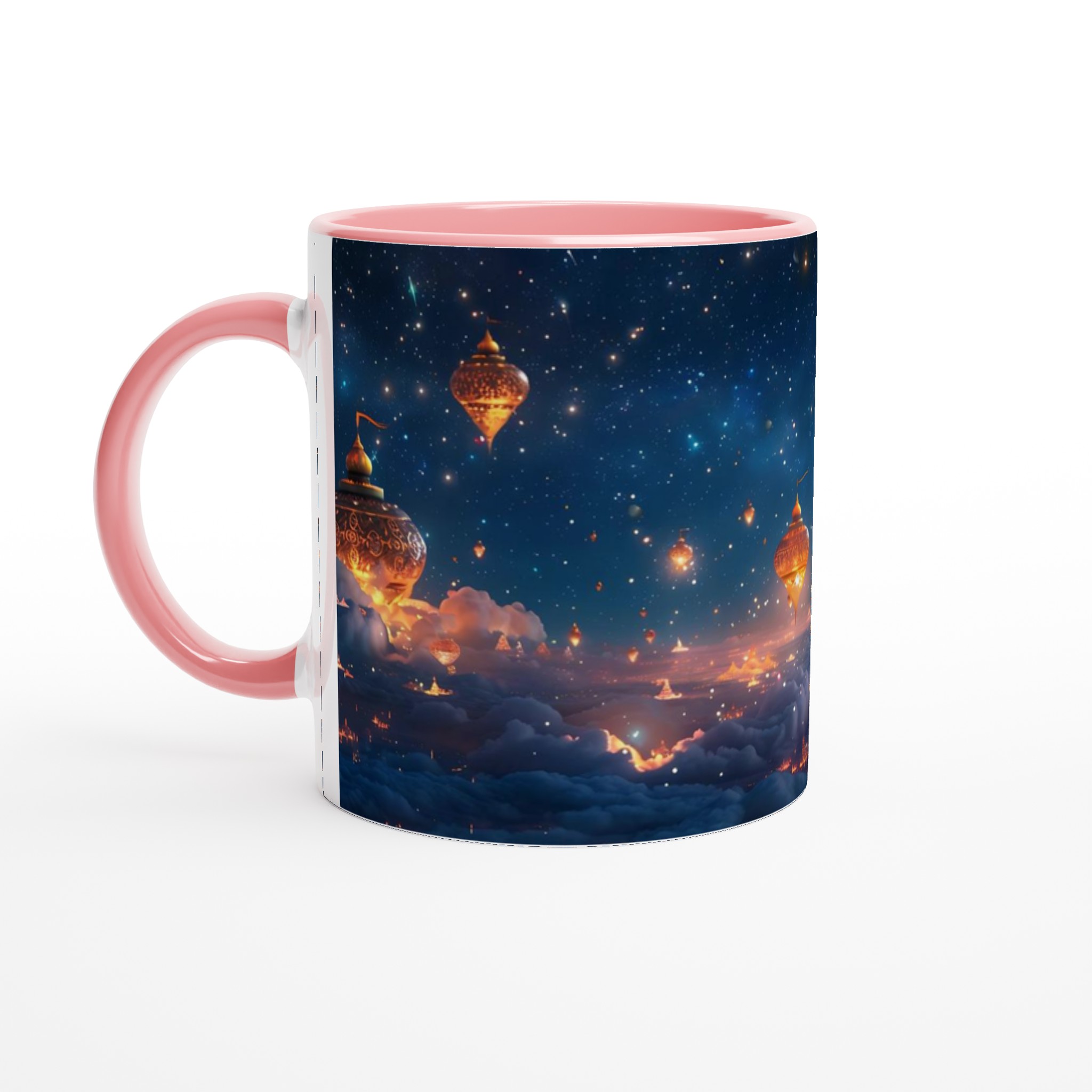 Föreställ dig att du svävar över en förtrollad stad, upplyst under en gnistrande stjärnhimmel. Denna keramiska mugg fångar den magiska känslan av en natt fylld av under och äventyr. Med sin drömska design är den mer än bara en mugg – det är en inbjudan att drömma dig bort med varje klunk, perfekt för att starta morgonen med inspiration eller avsluta kvällen med en lugn stund.