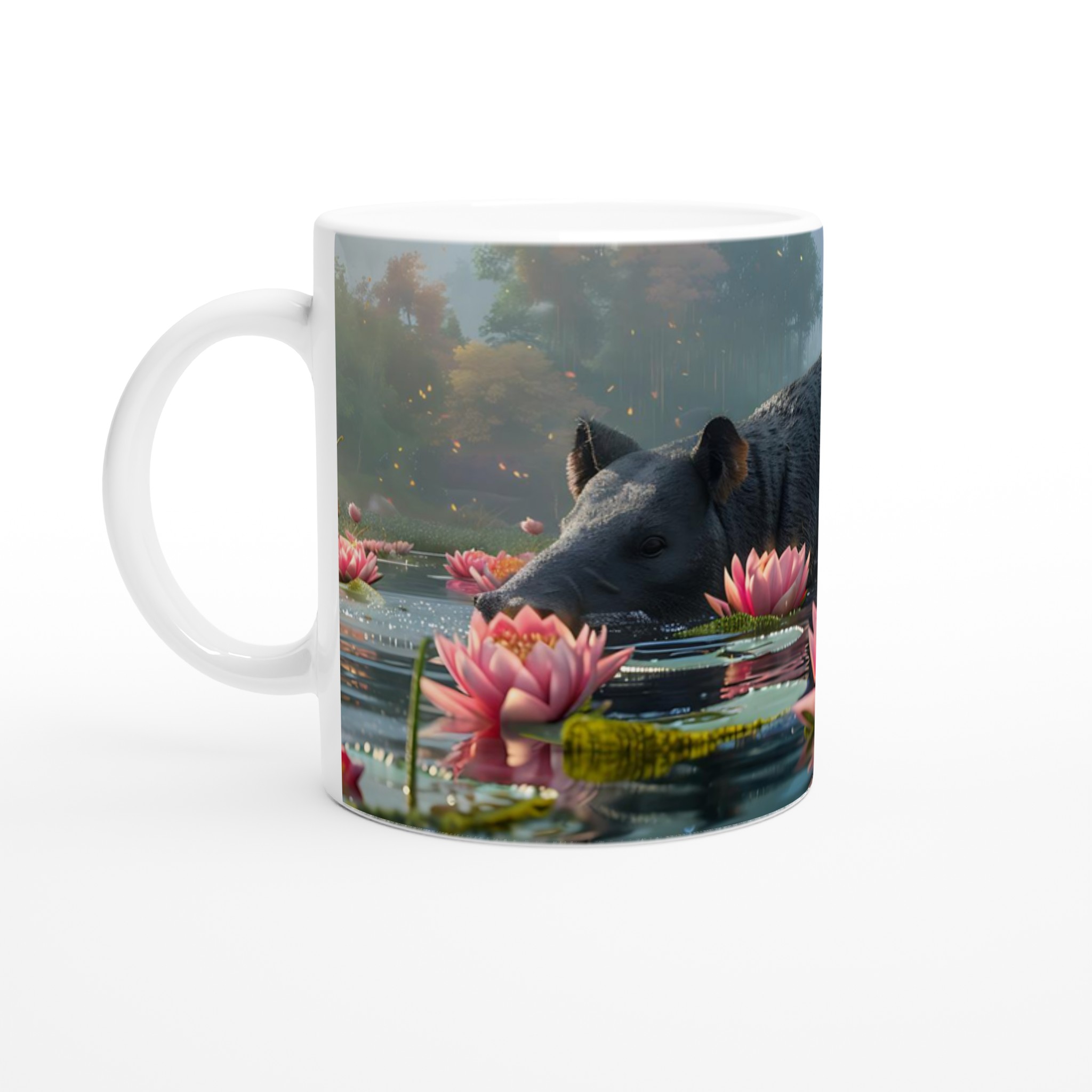 Lyft varje kaffestund med vår premium keramikmugg – stilren, hållbar och skapad för att låta ditt motiv glänsa. Denna förtrollande mugg fångar en magisk scen med ett vildsvin som utforskar en damm fylld av lysande rosa näckrosor, omgivet av en mystisk skog i dimman. En perfekt design för den som älskar natur, fantasi och en touch av lugn i vardagen.