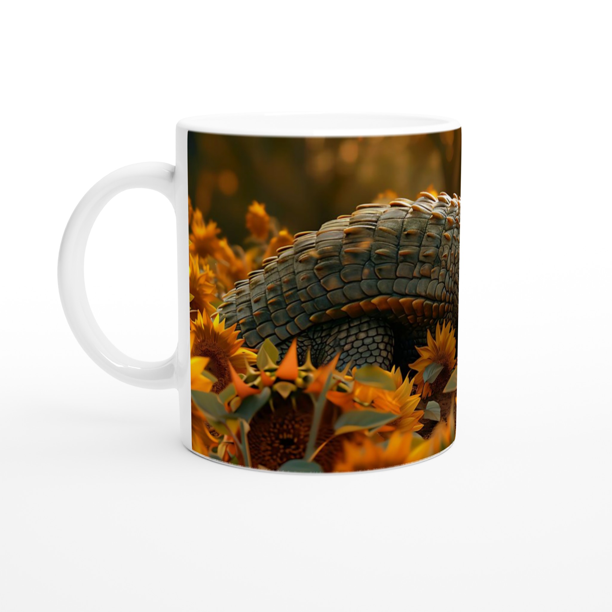 Föreställ dig en lugn stund, omgiven av gyllene solrosor vid gryning eller skymning, med en majestätisk sköldpadda som vilar fridfullt. Denna 11oz keramikmugg fångar den varma, drömska atmosfären perfekt och förvandlar din dryckesstund till en avkopplande flykt. Välj bland våra sju inspirerande keramiska färger – från klassiskt vitt till djupt midnattsblått, eller lekfullt gult, rosa, grönt, rött och svart – för att matcha din personliga stil eller din inredning. Varje färgval förstärker sköldpaddans lugn och solrosornas glöd, vilket gör varje klunk till en liten stund av magi.