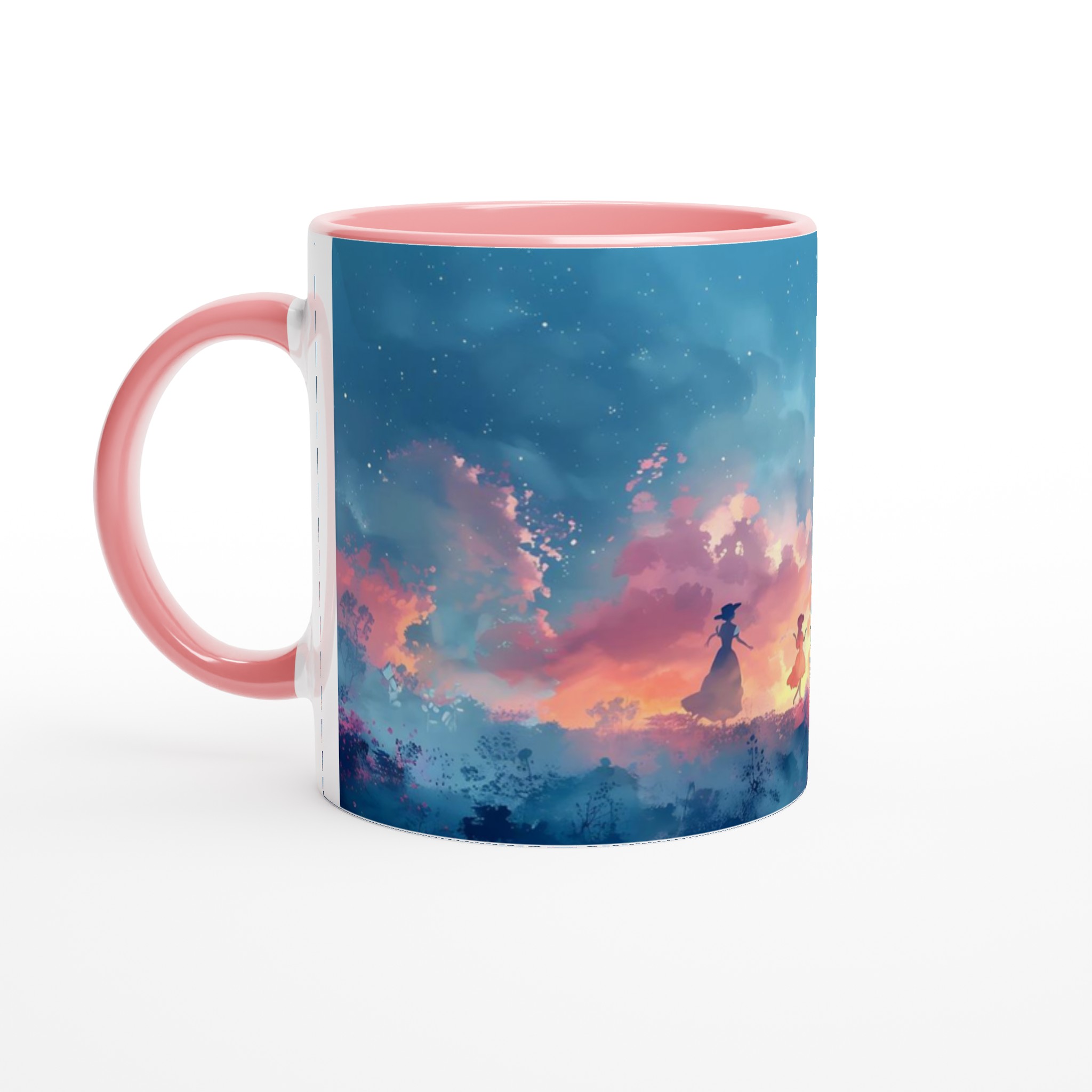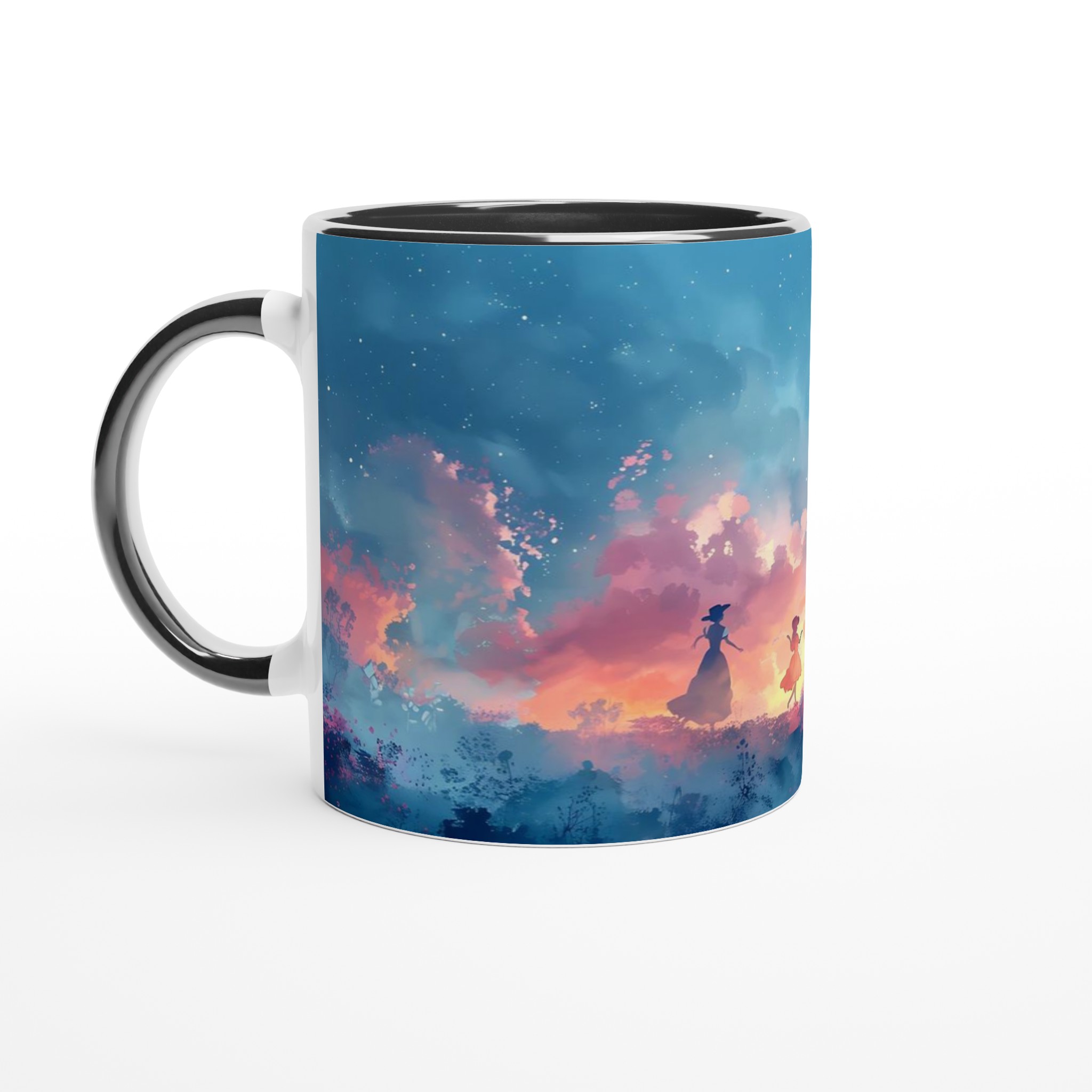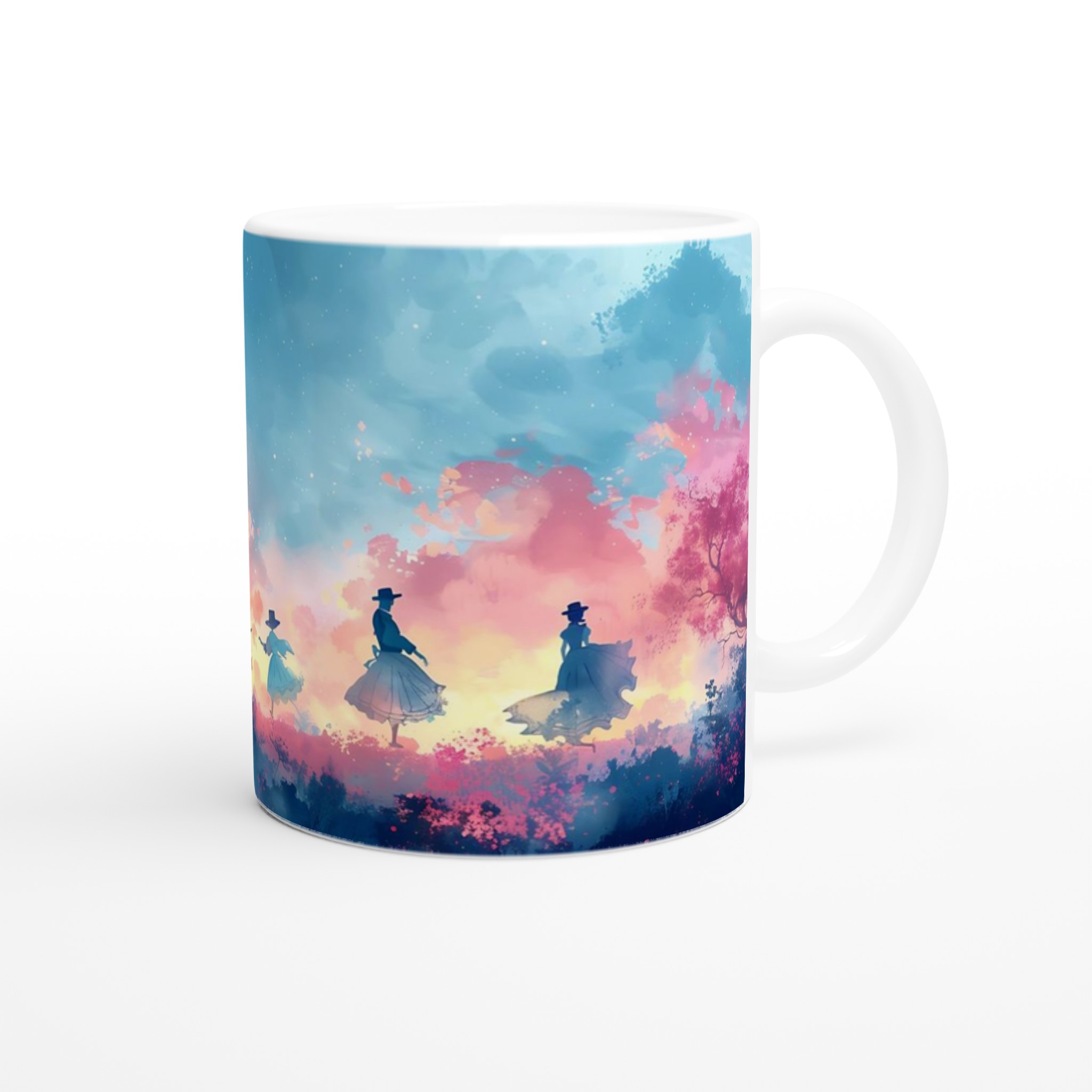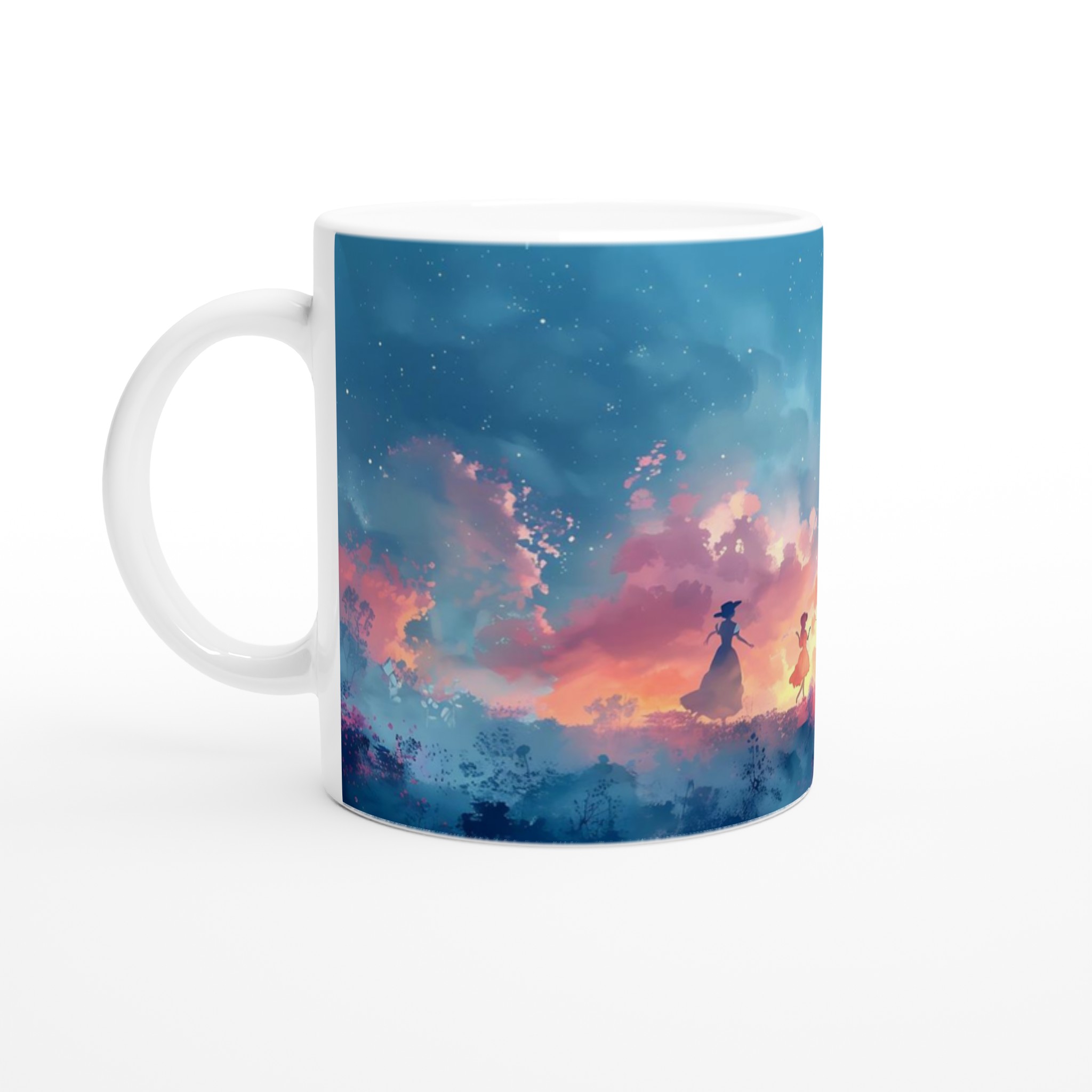Fånga den drömska skönheten hos en magisk skymningsdans med denna unika keramiska mugg. Perfekt för morgonkaffet, kvällens varma choklad eller när du bara vill njuta av en kopp te. Den blanka ytan framhäver trycket med klara och levande färger, som håller sig fina även efter många turer i mikron och diskmaskinen. Varje klunk blir en resa till en förtrollad värld, omgiven av mjuka pastelltoner och lekfulla silhuetter.