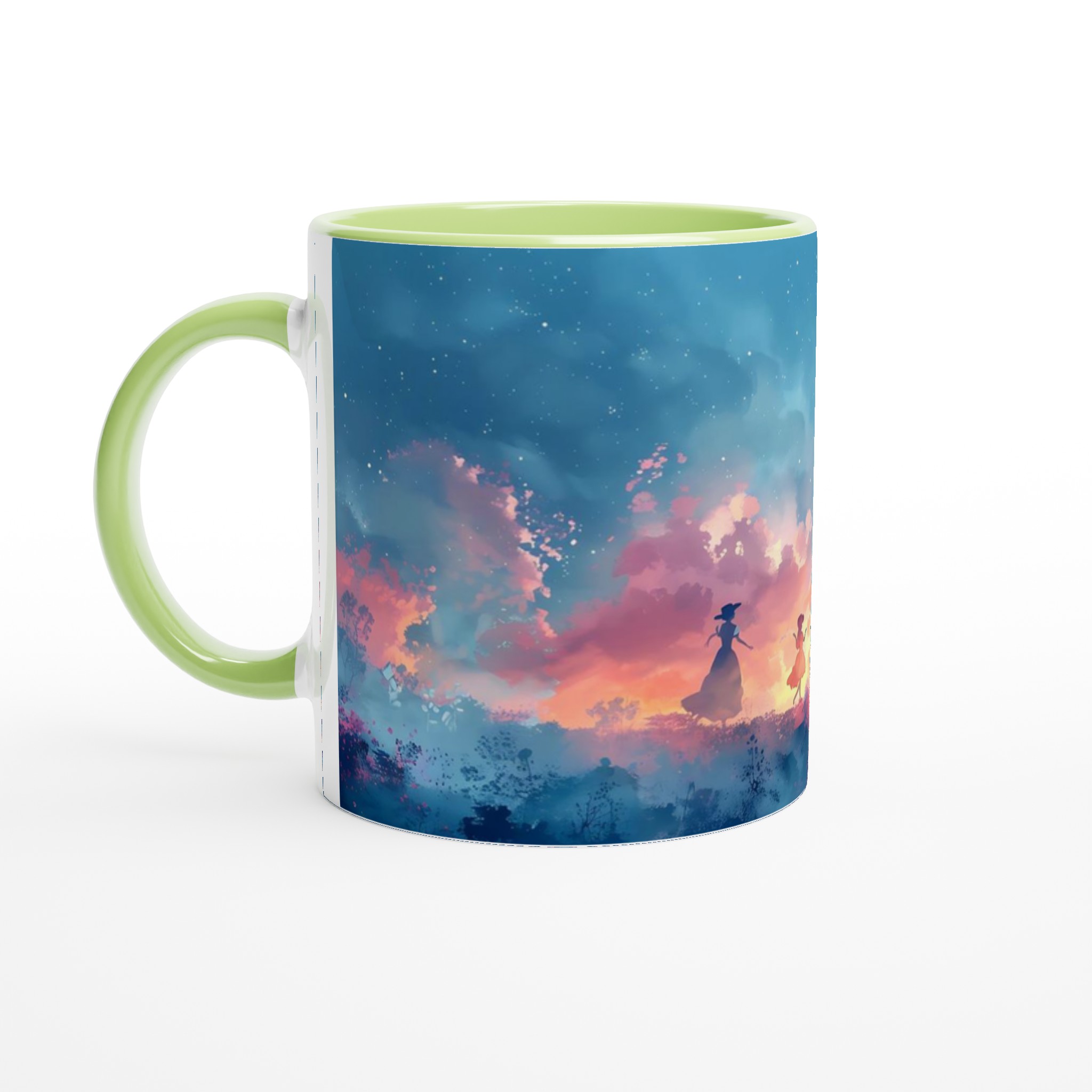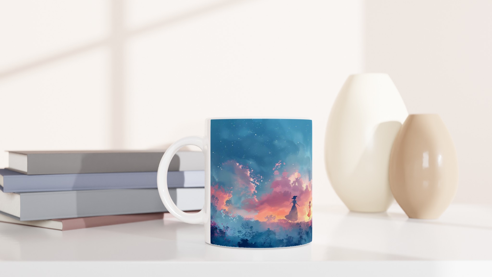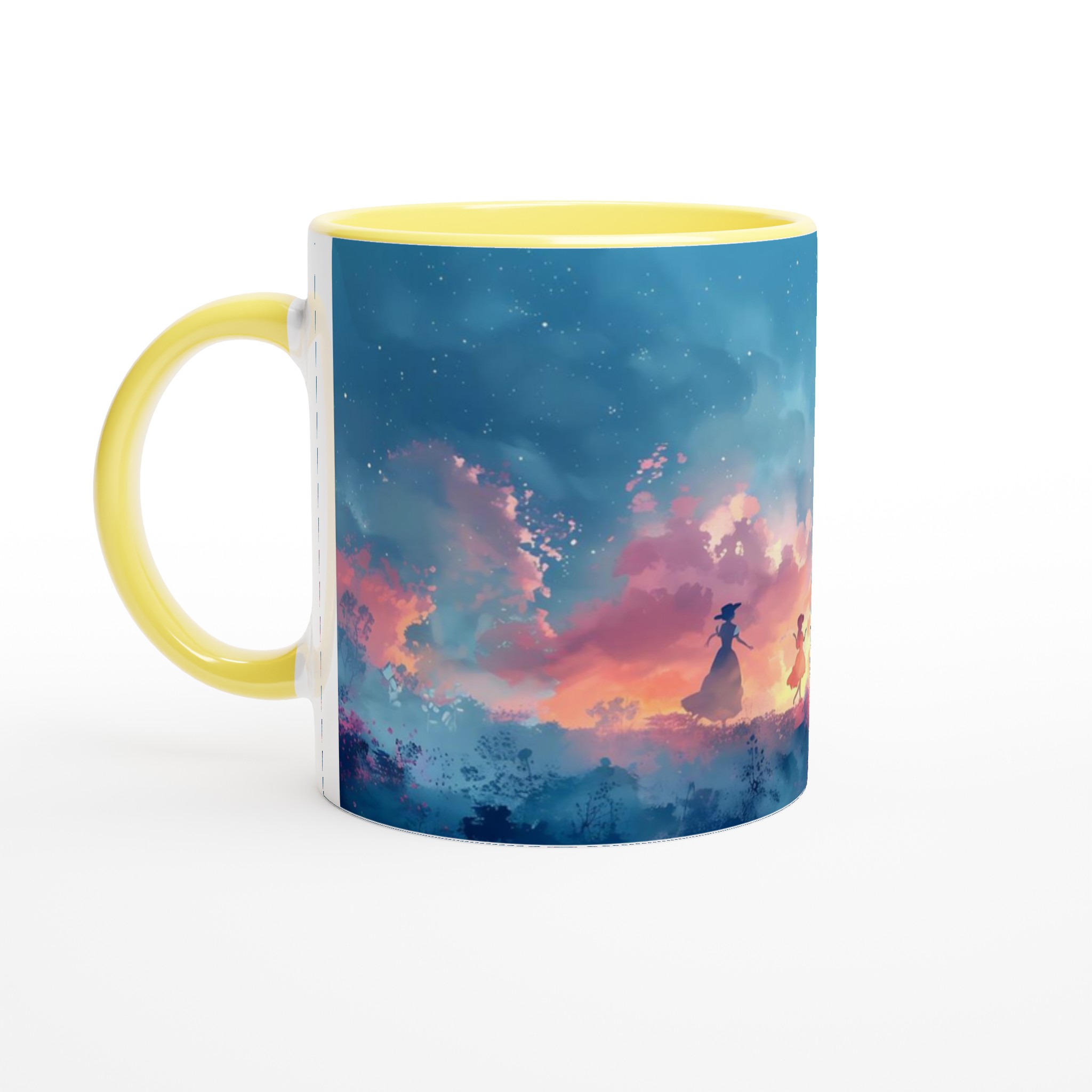 Fånga den drömska skönheten hos en magisk skymningsdans med denna unika keramiska mugg. Perfekt för morgonkaffet, kvällens varma choklad eller när du bara vill njuta av en kopp te. Den blanka ytan framhäver trycket med klara och levande färger, som håller sig fina även efter många turer i mikron och diskmaskinen. Varje klunk blir en resa till en förtrollad värld, omgiven av mjuka pastelltoner och lekfulla silhuetter.