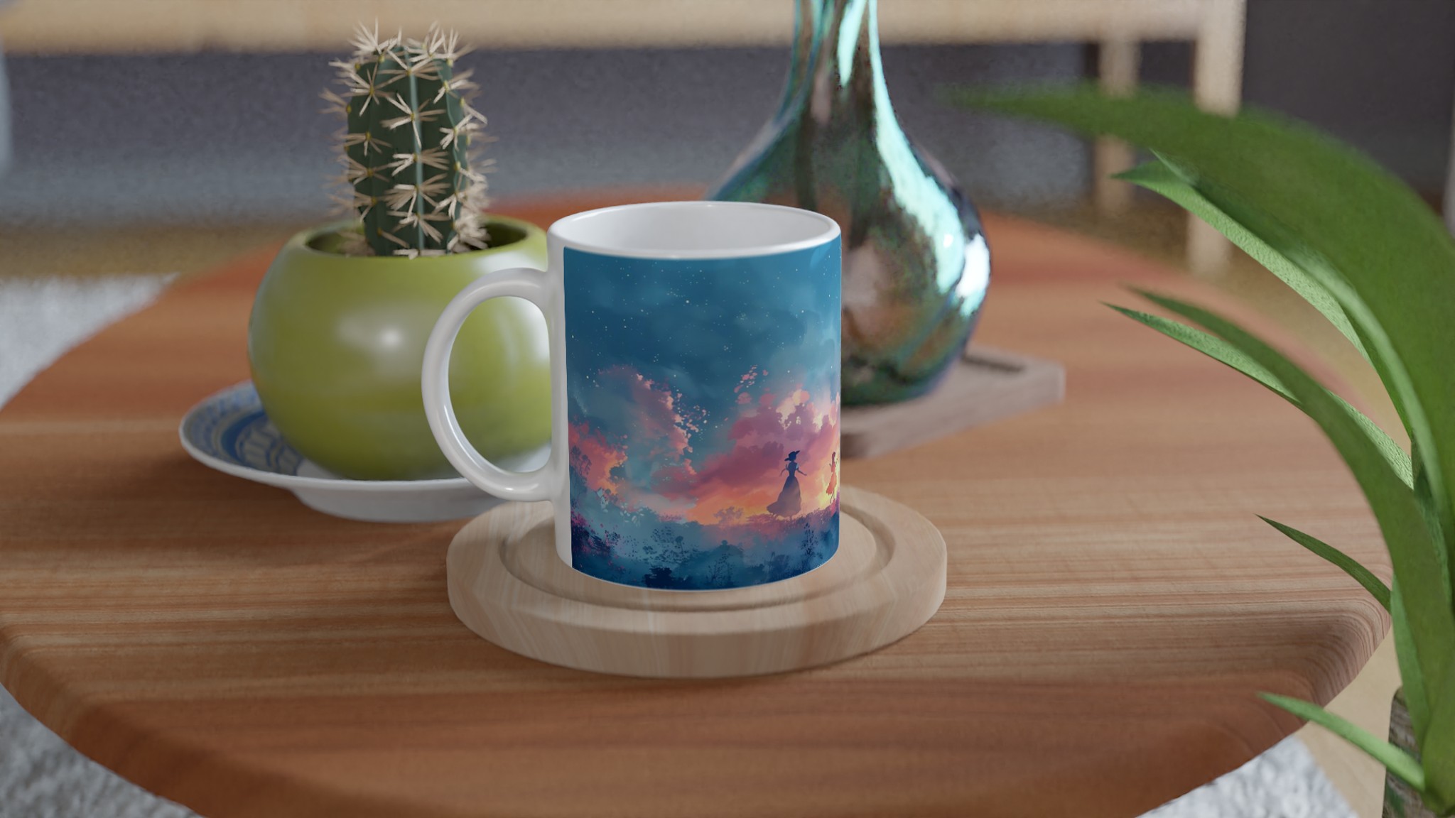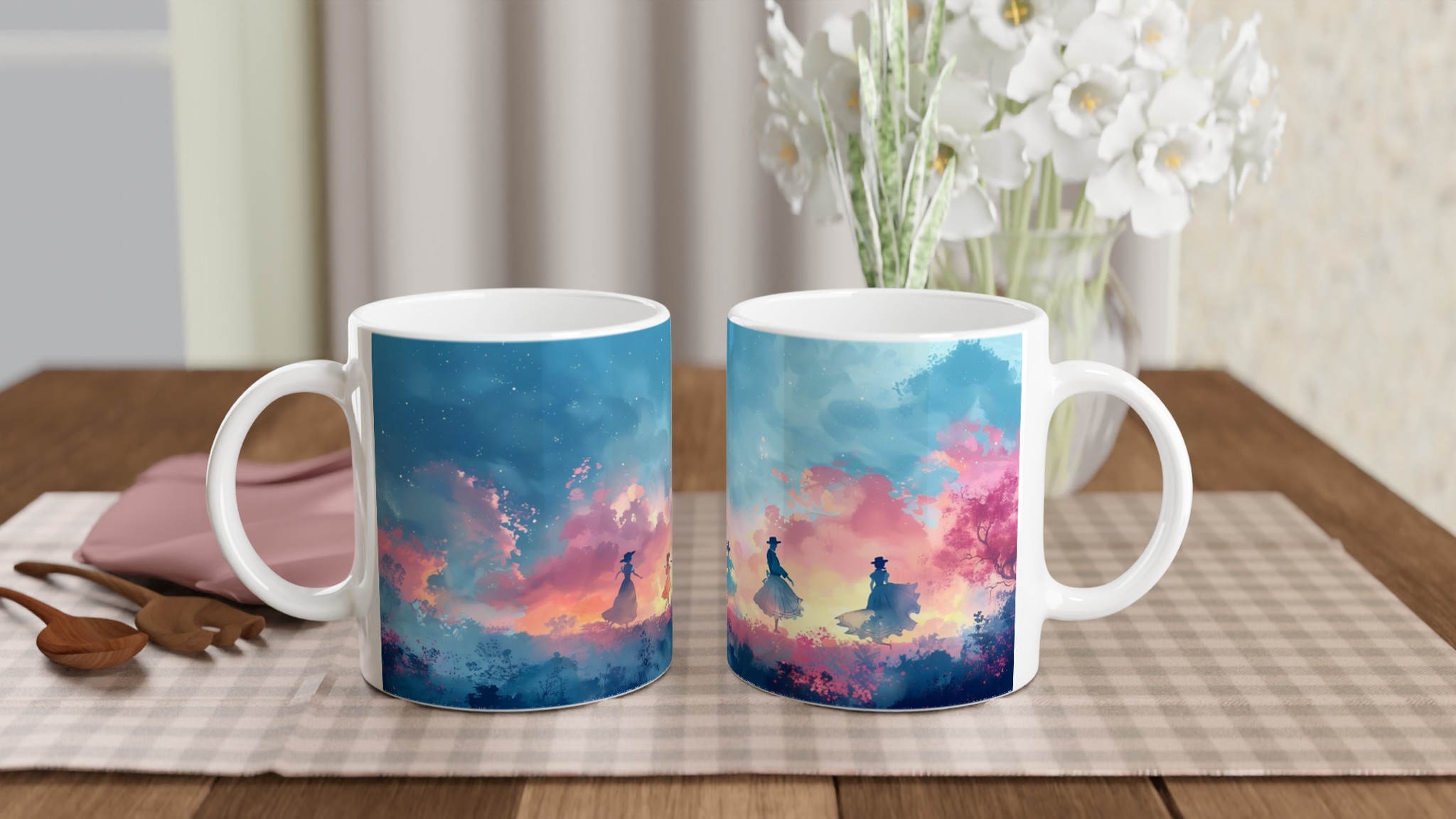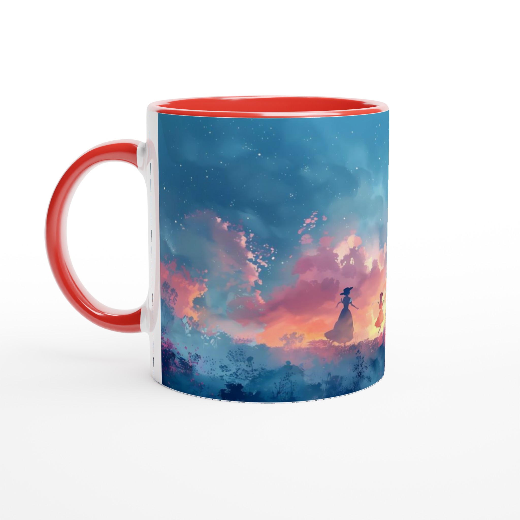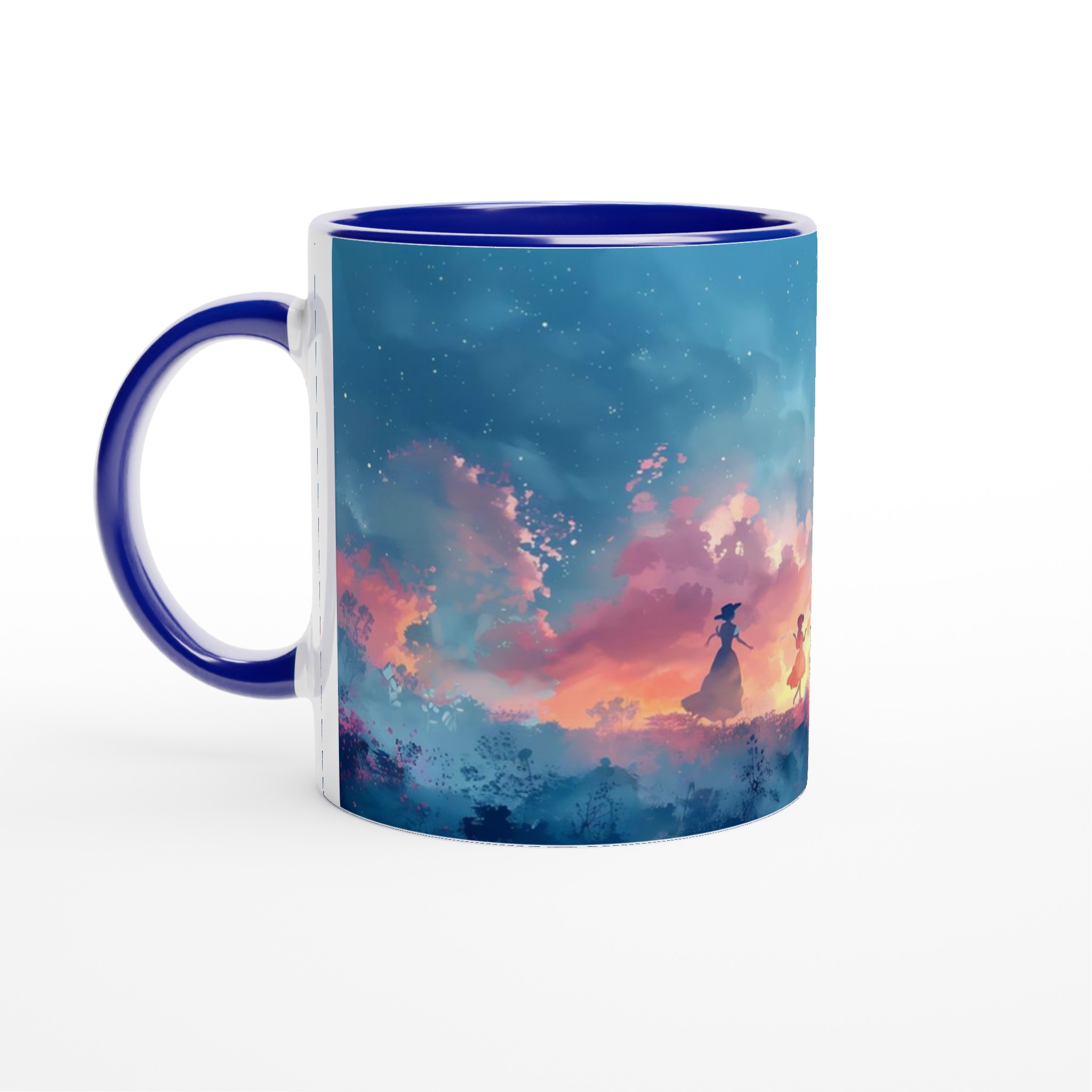 Fånga den drömska skönheten hos en magisk skymningsdans med denna unika keramiska mugg. Perfekt för morgonkaffet, kvällens varma choklad eller när du bara vill njuta av en kopp te. Den blanka ytan framhäver trycket med klara och levande färger, som håller sig fina även efter många turer i mikron och diskmaskinen. Varje klunk blir en resa till en förtrollad värld, omgiven av mjuka pastelltoner och lekfulla silhuetter.