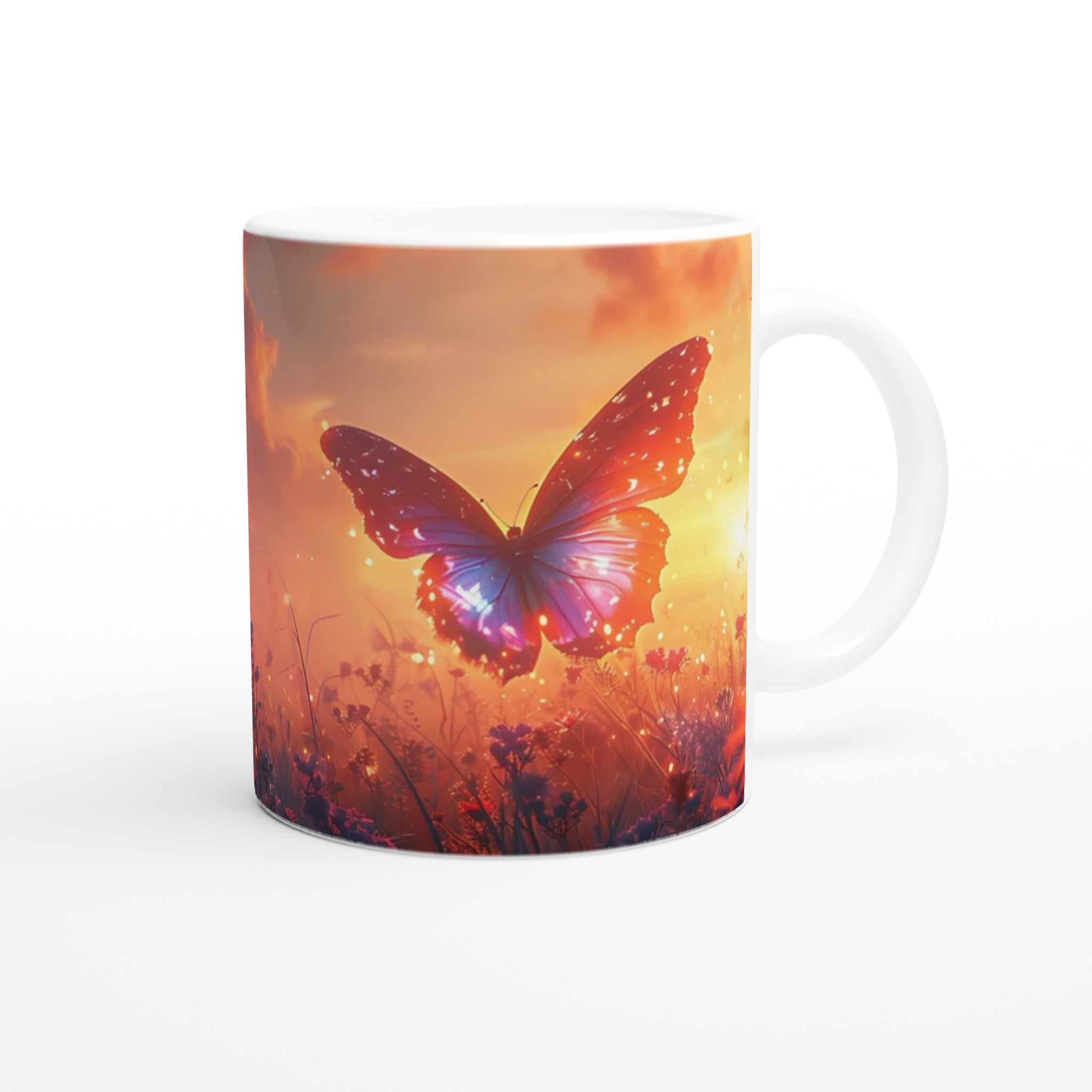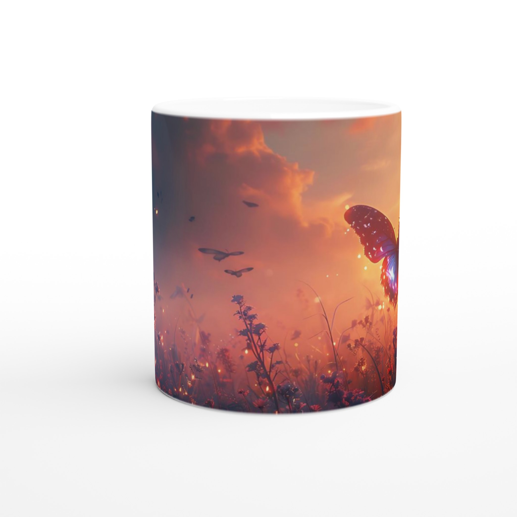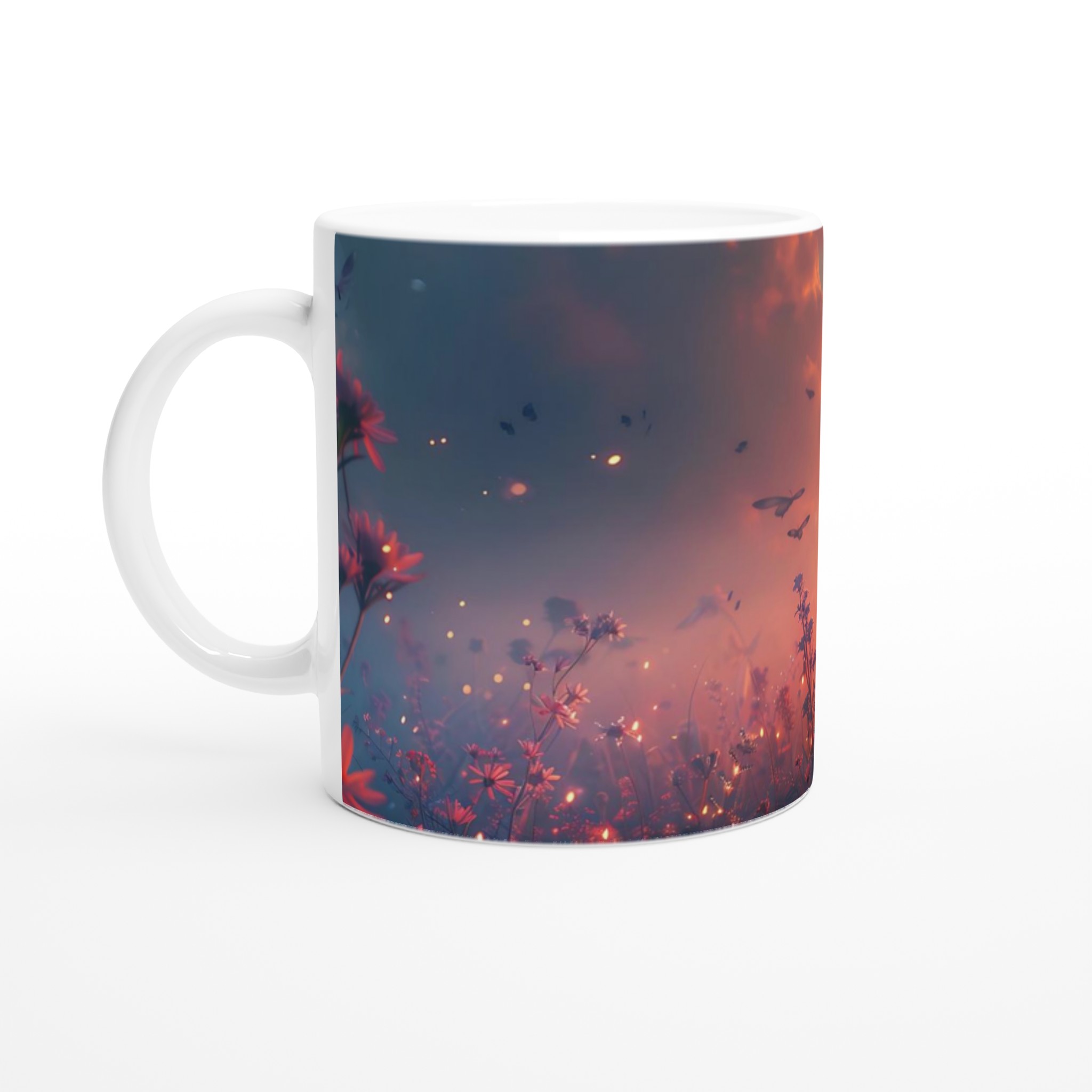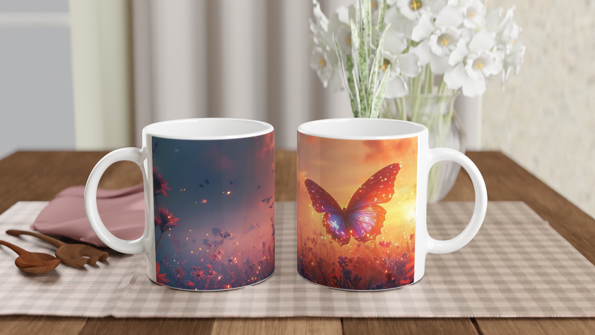 Fånga den magiska känslan av en solnedgång över en äng med vår nya keramiska mugg. Varje klunk blir en resa till en drömlik värld, där fjärilar dansar i ett skimmer av varma färger. Denna stilrena keramiska mugg blir snabbt en vardagsfavorit. Perfekt för morgonkaffet, kvällens varma choklad eller när du bara vill njuta av en kopp te. Den blanka vita ytan gör att trycken framhävs med klara och levande färger, som håller sig fina även efter många turer i mikron och diskmaskinen.