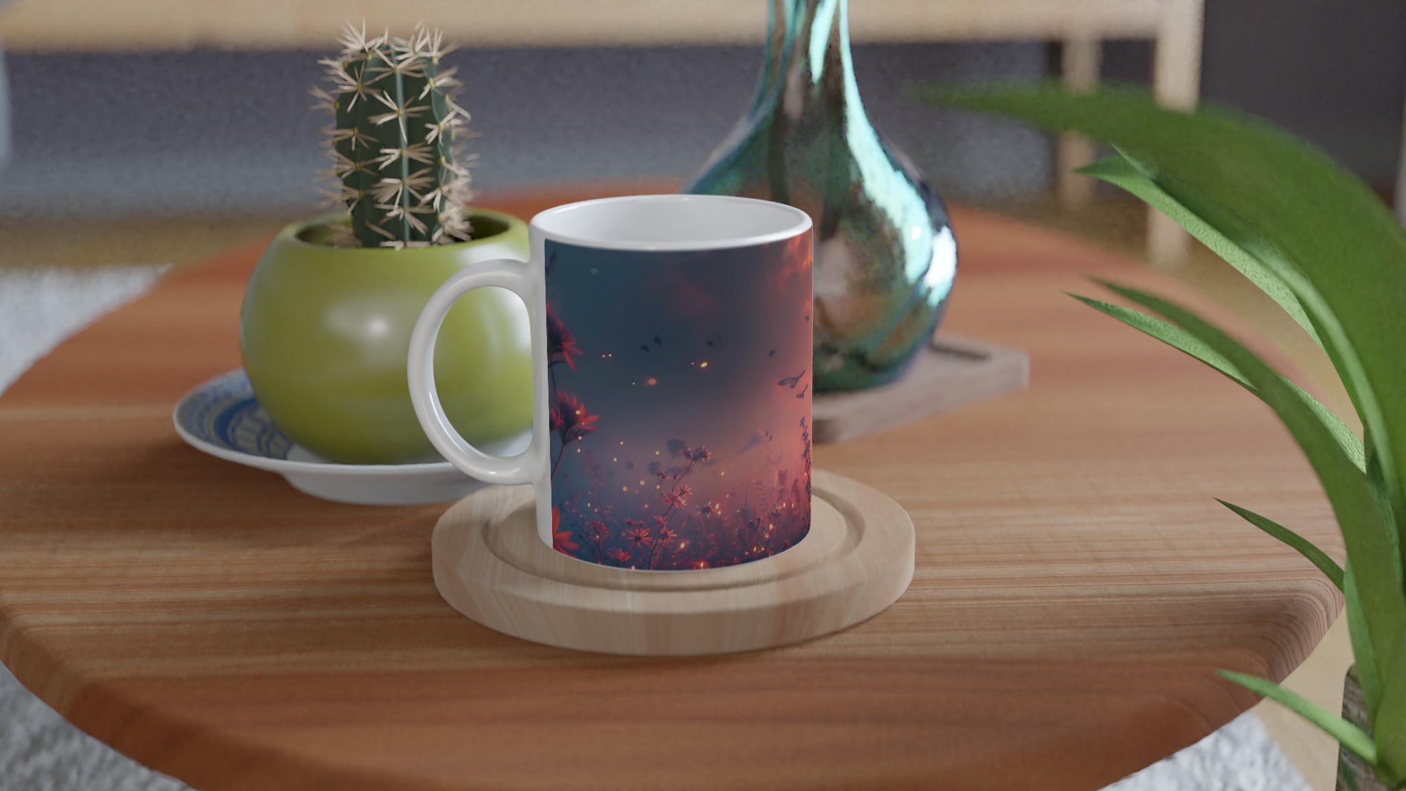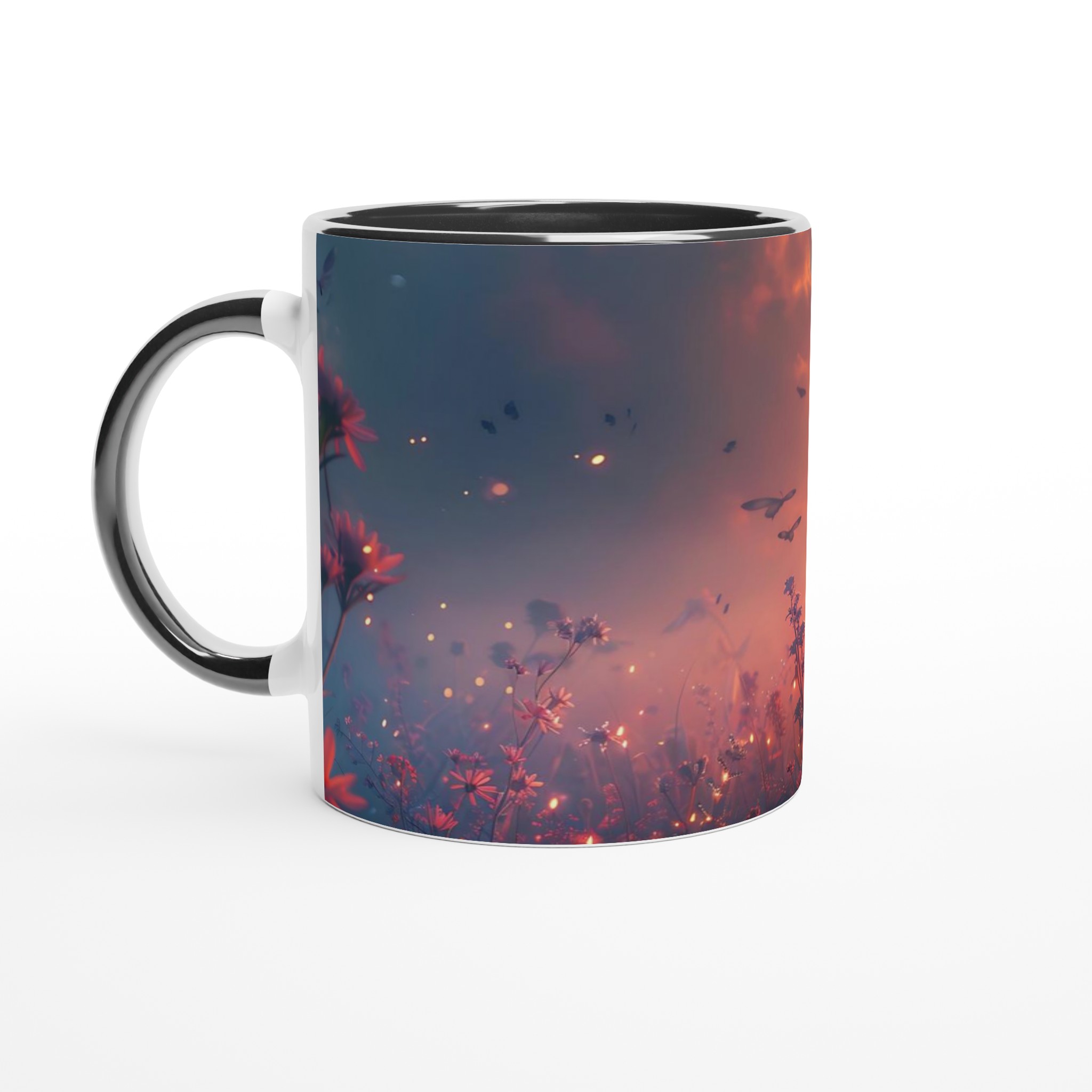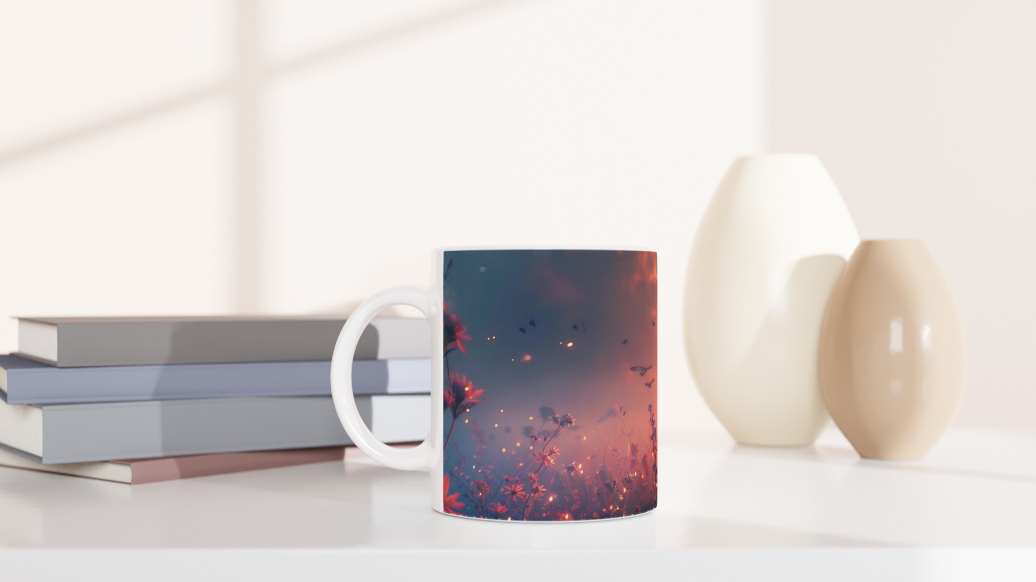 Fånga den magiska känslan av en solnedgång över en äng med vår nya keramiska mugg. Varje klunk blir en resa till en drömlik värld, där fjärilar dansar i ett skimmer av varma färger. Denna stilrena keramiska mugg blir snabbt en vardagsfavorit. Perfekt för morgonkaffet, kvällens varma choklad eller när du bara vill njuta av en kopp te. Den blanka vita ytan gör att trycken framhävs med klara och levande färger, som håller sig fina även efter många turer i mikron och diskmaskinen.