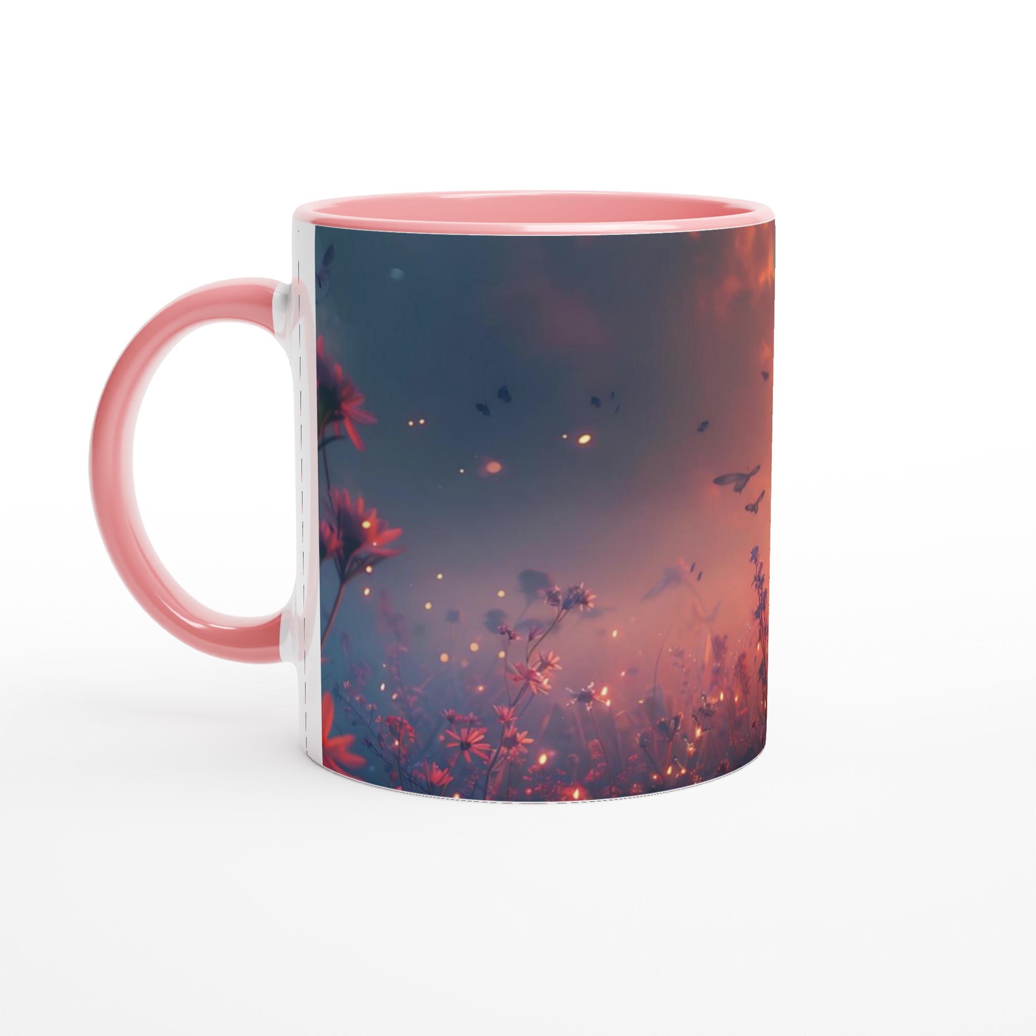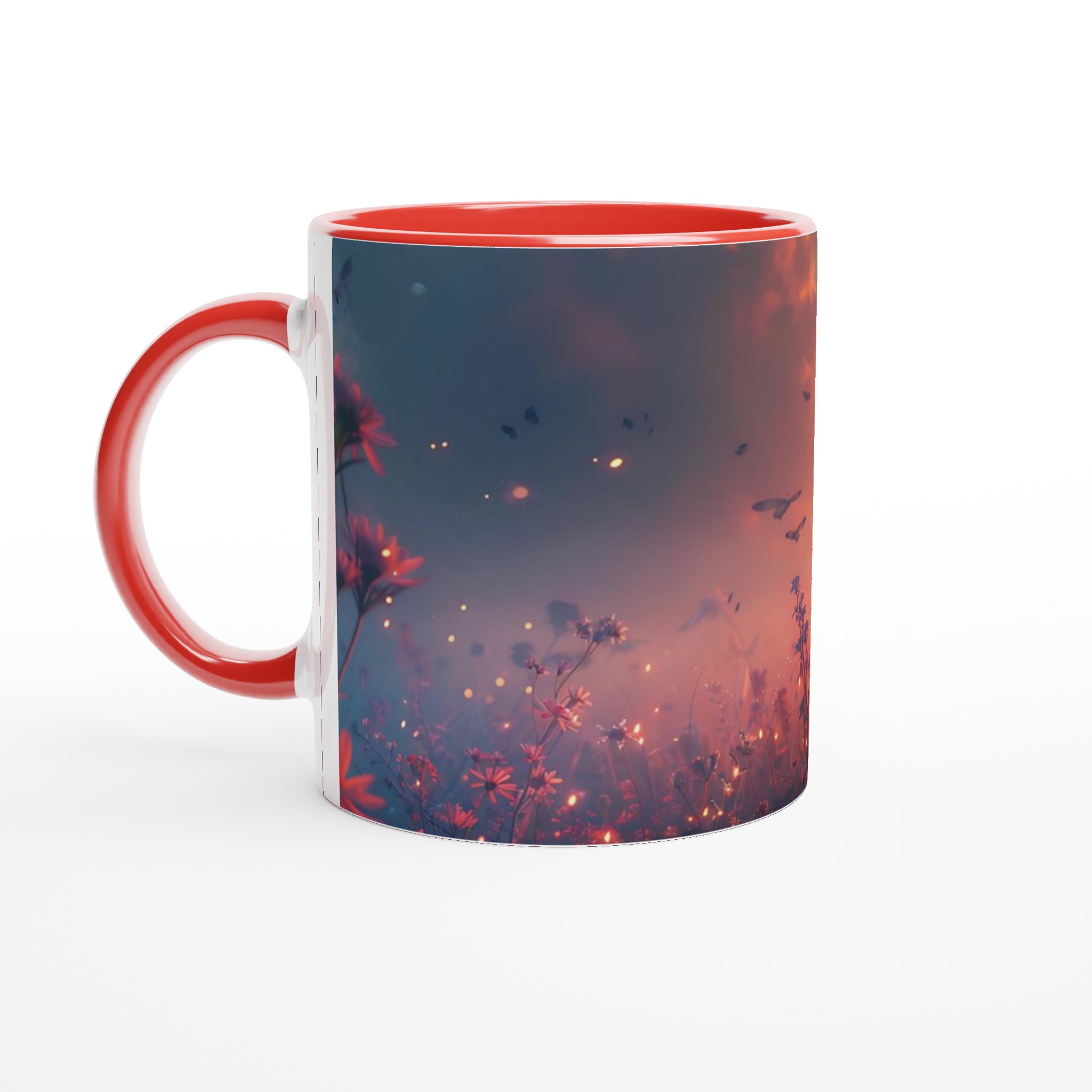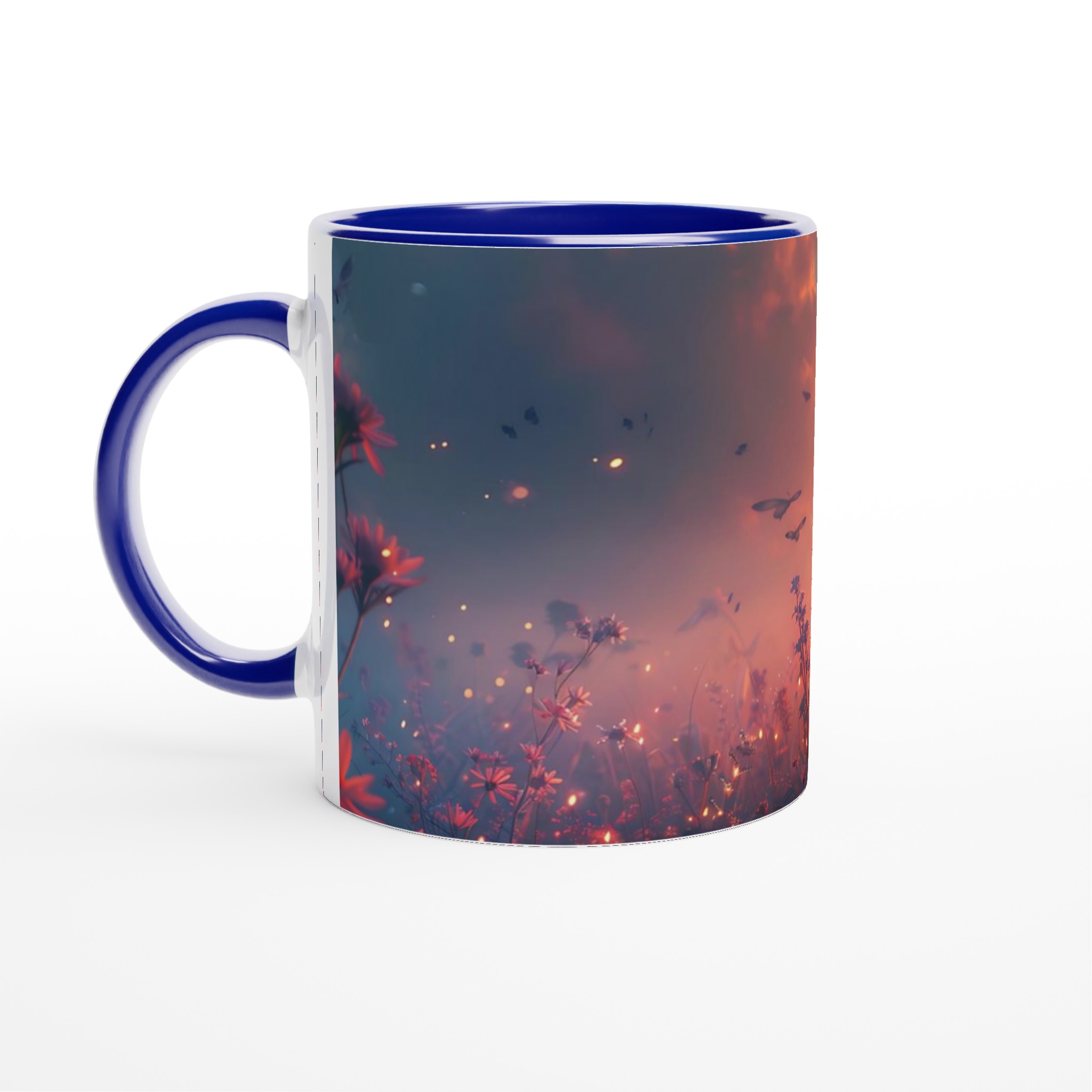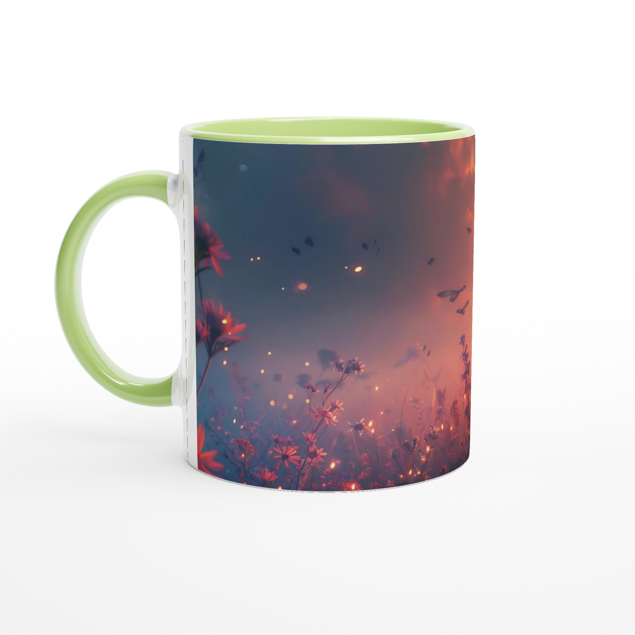 Fånga den magiska känslan av en solnedgång över en äng med vår nya keramiska mugg. Varje klunk blir en resa till en drömlik värld, där fjärilar dansar i ett skimmer av varma färger. Denna stilrena keramiska mugg blir snabbt en vardagsfavorit. Perfekt för morgonkaffet, kvällens varma choklad eller när du bara vill njuta av en kopp te. Den blanka vita ytan gör att trycken framhävs med klara och levande färger, som håller sig fina även efter många turer i mikron och diskmaskinen.
