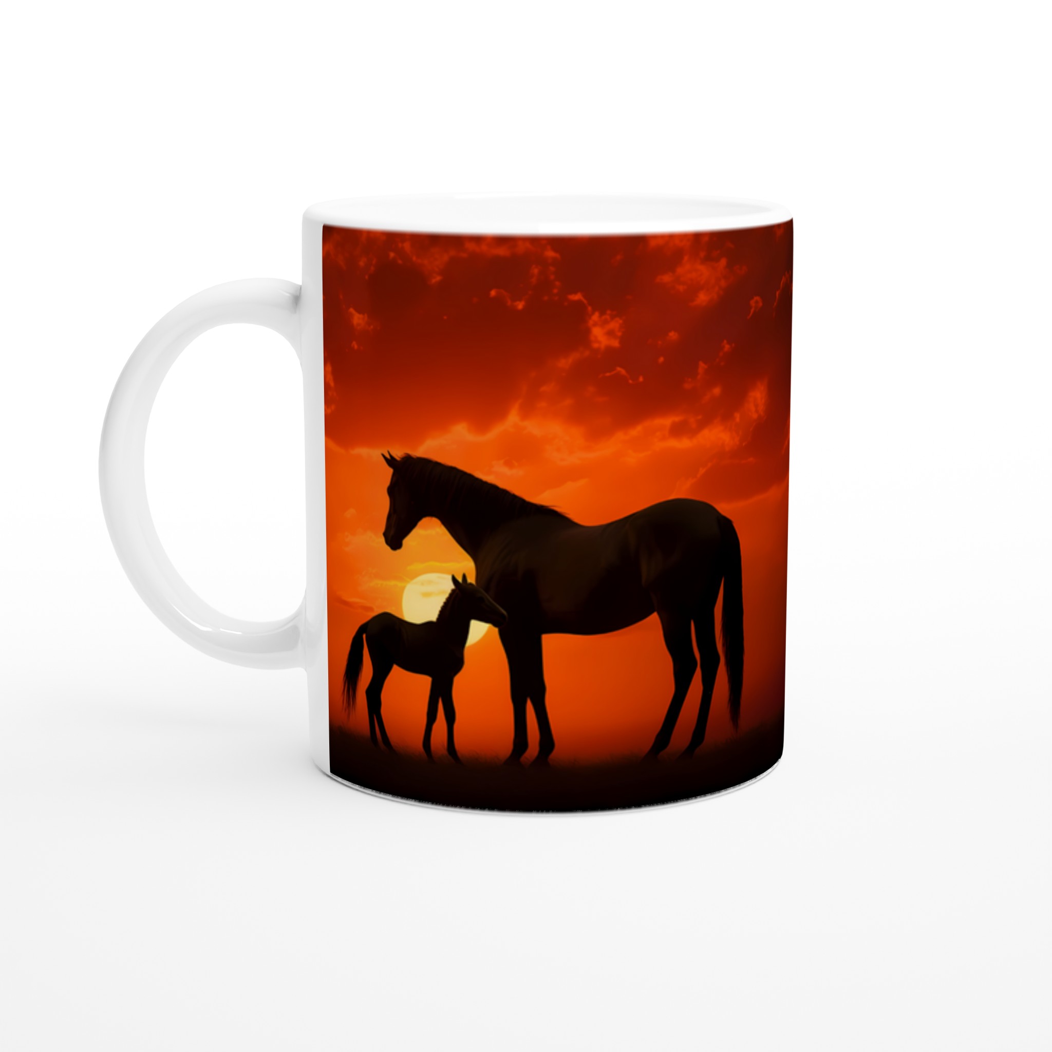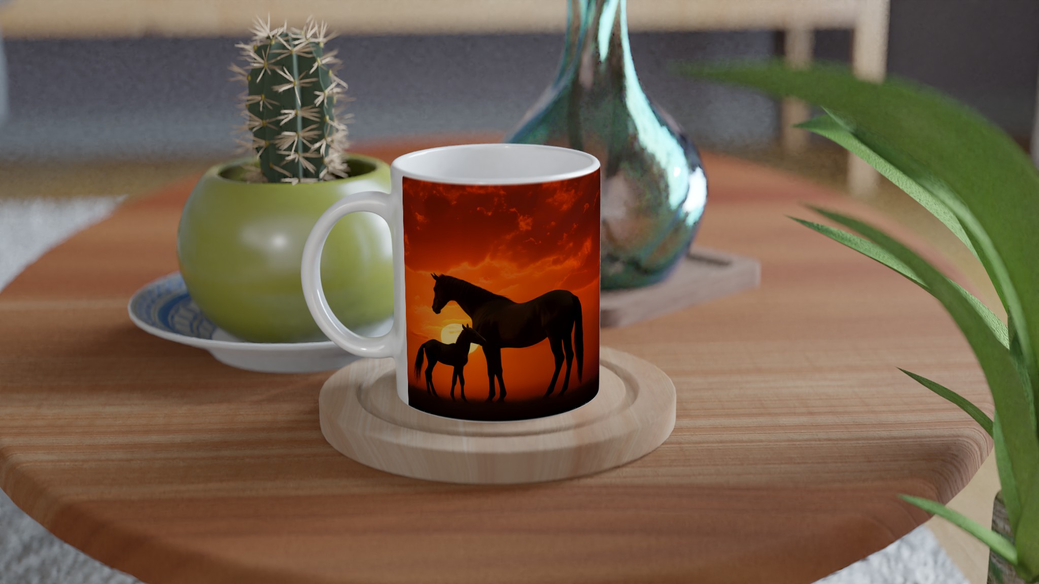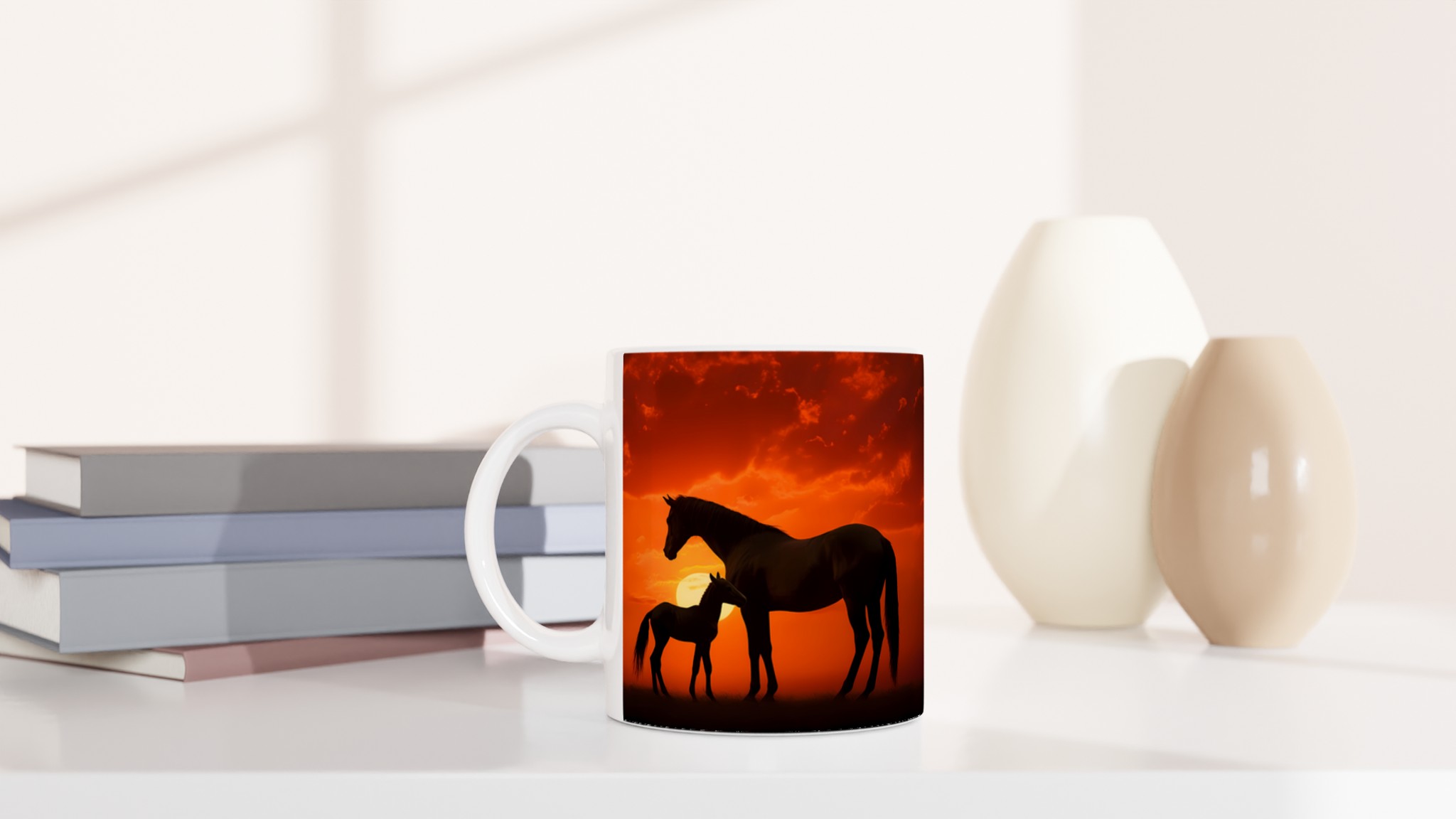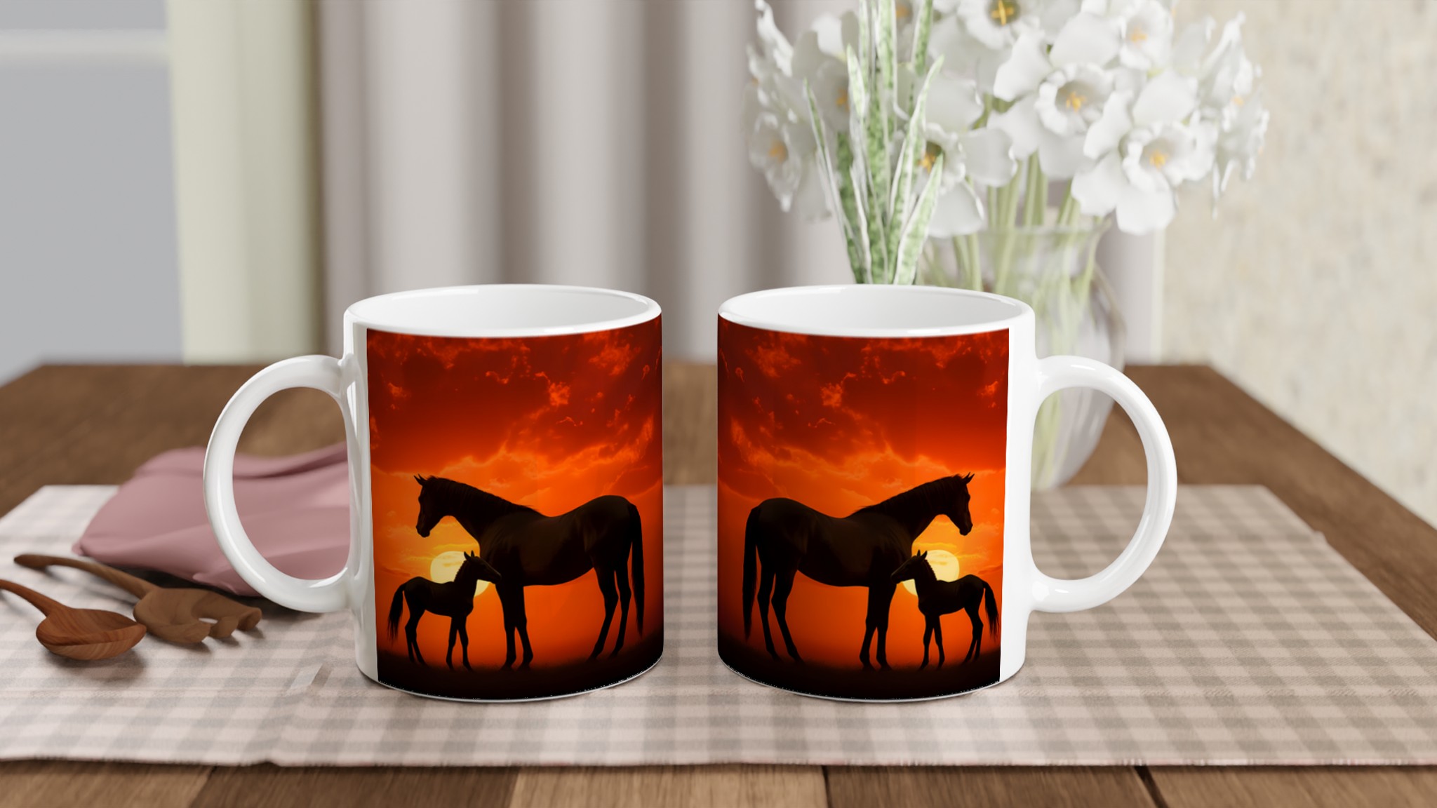 Föreställ dig den lugna skönheten av en solnedgång över prärien, med silhuetter av hästar som står majestätiskt mot en eldig himmel. Denna Keramisk Mugg fångar den känslan perfekt, och blir en vardagsfavorit som förgyller varje stund. Perfekt för morgonkaffet, kvällens varma choklad eller när du bara vill njuta av en kopp te. Den blanka ytan gör att trycken framhävs med klara och levande färger, som håller sig fina även efter många turer i mikron och diskmaskinen.