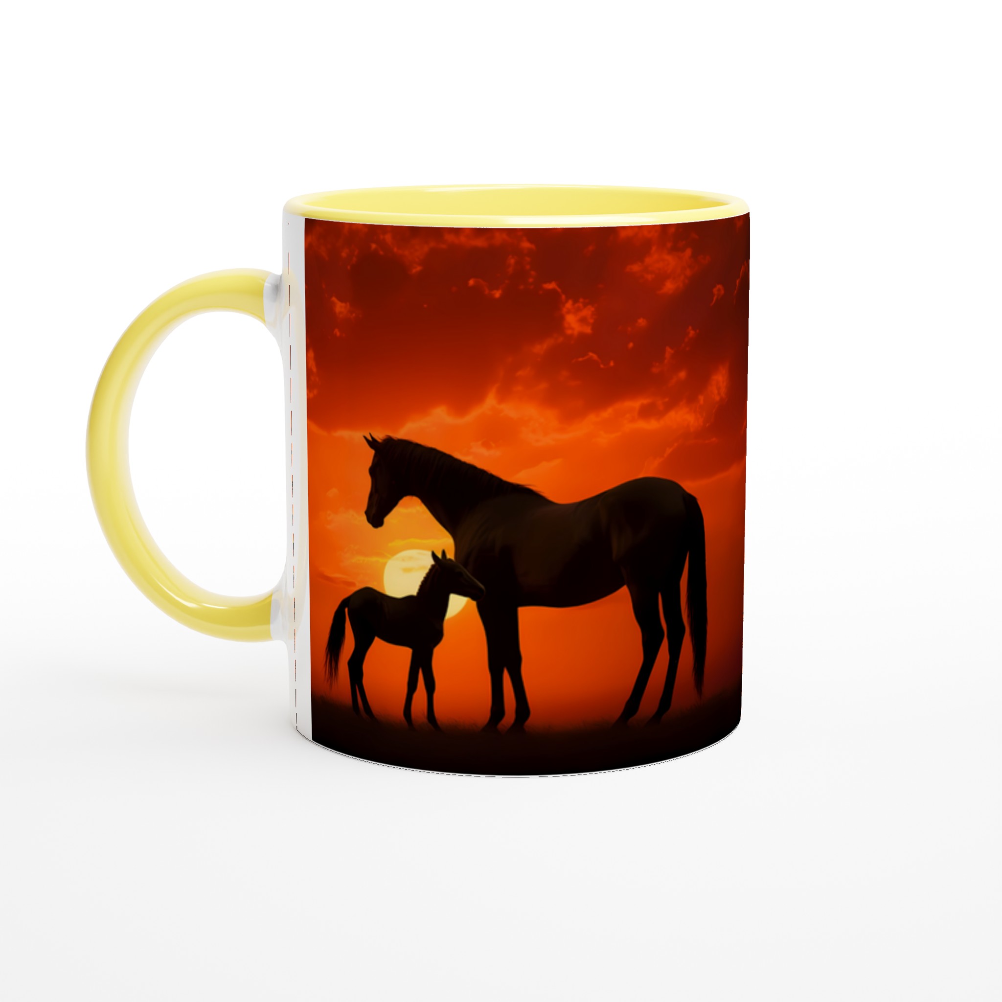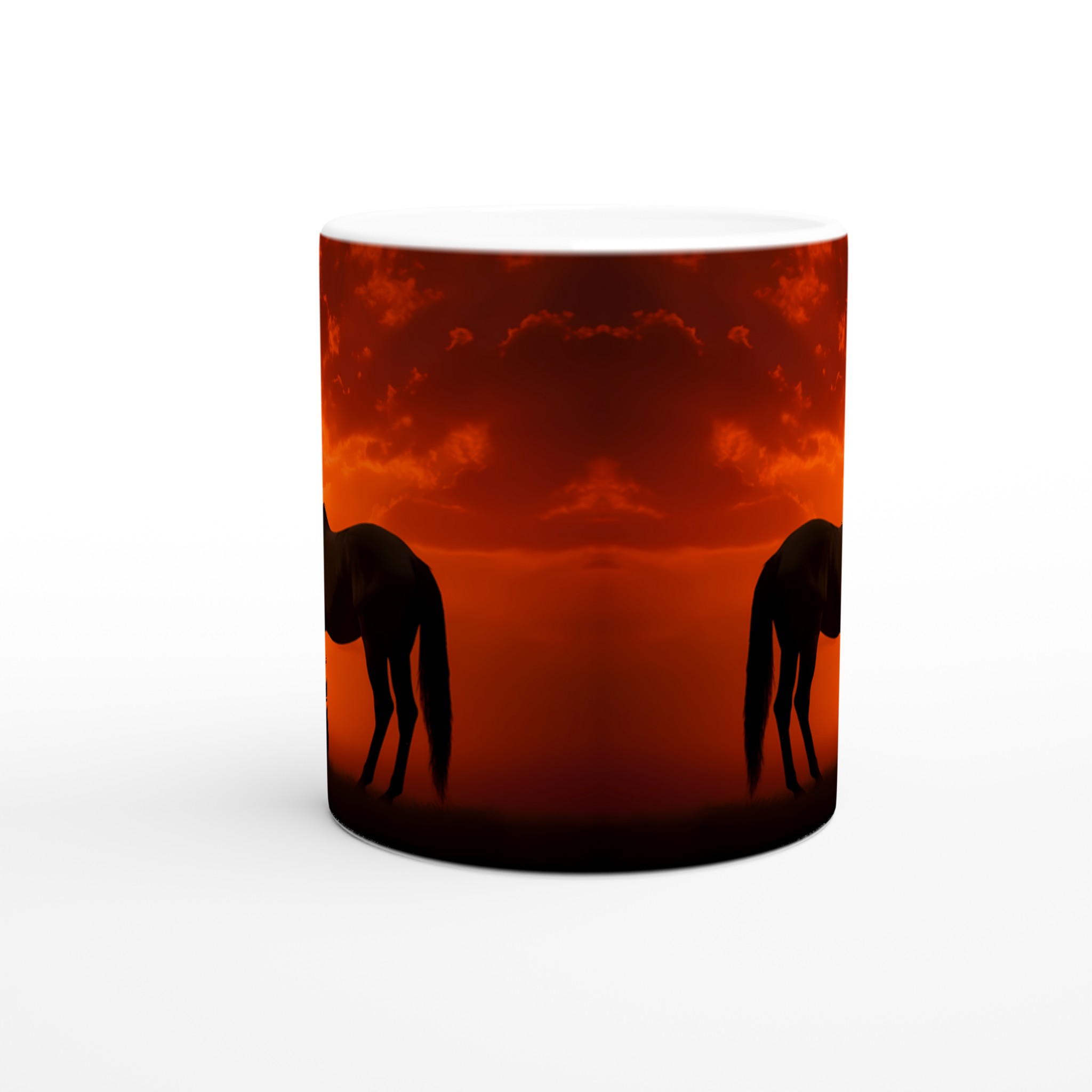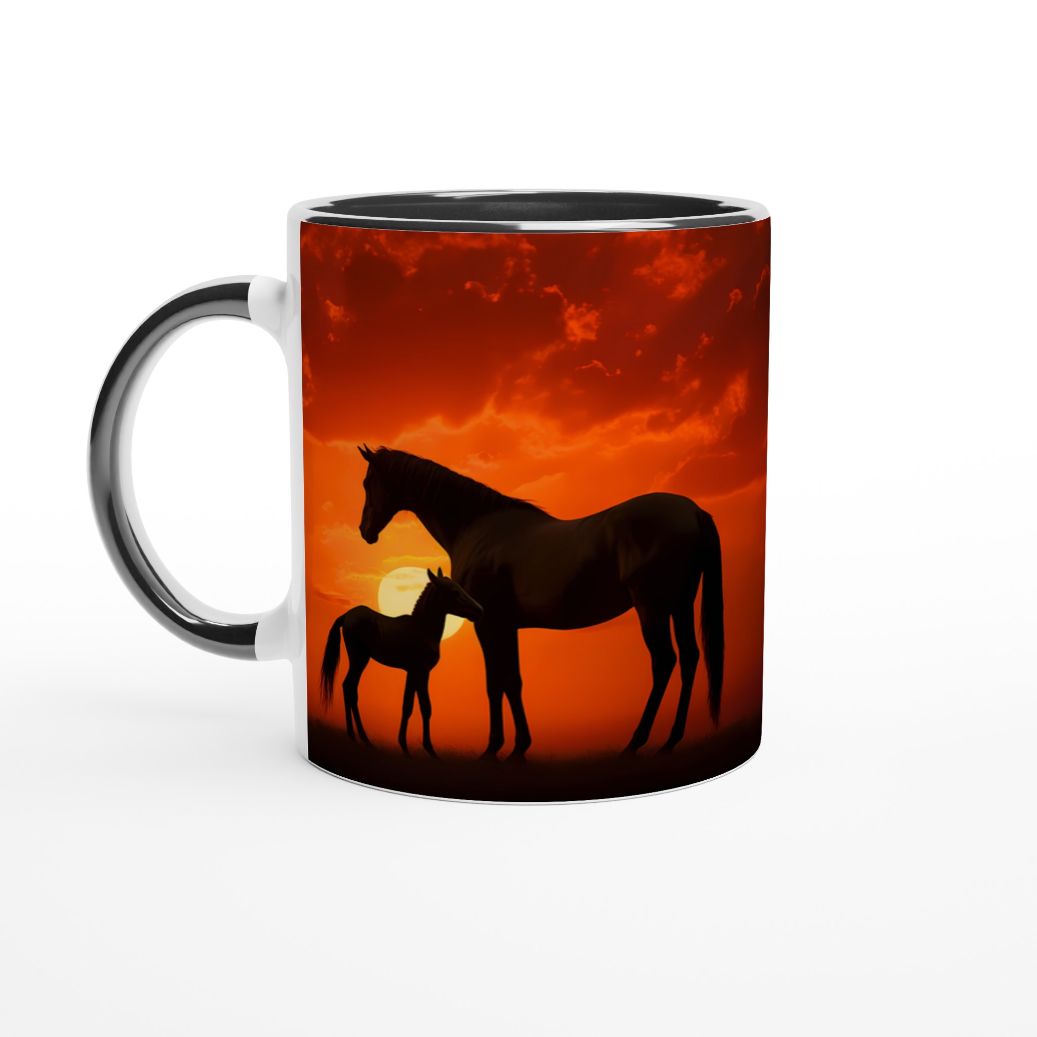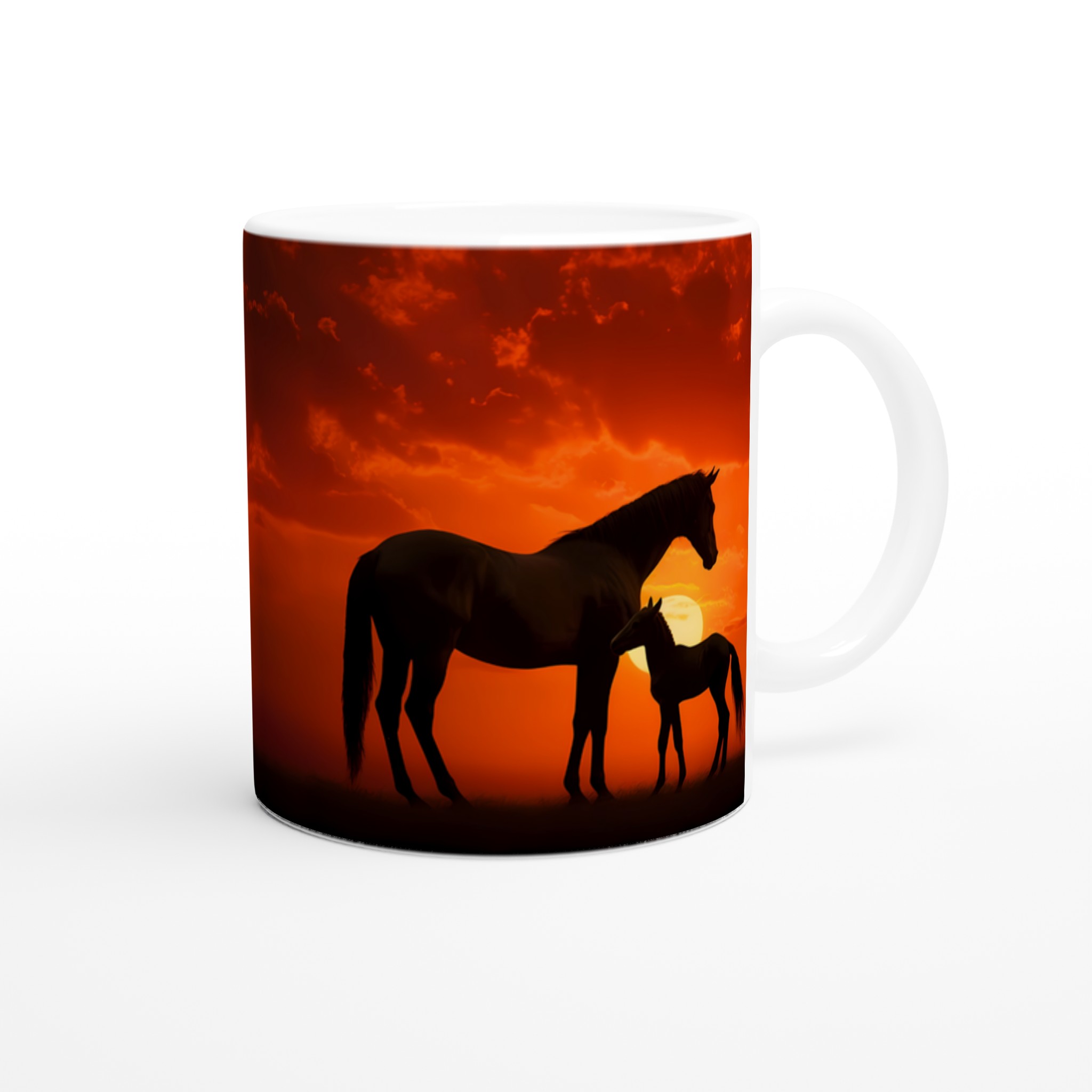 Föreställ dig den lugna skönheten av en solnedgång över prärien, med silhuetter av hästar som står majestätiskt mot en eldig himmel. Denna Keramisk Mugg fångar den känslan perfekt, och blir en vardagsfavorit som förgyller varje stund. Perfekt för morgonkaffet, kvällens varma choklad eller när du bara vill njuta av en kopp te. Den blanka ytan gör att trycken framhävs med klara och levande färger, som håller sig fina även efter många turer i mikron och diskmaskinen.