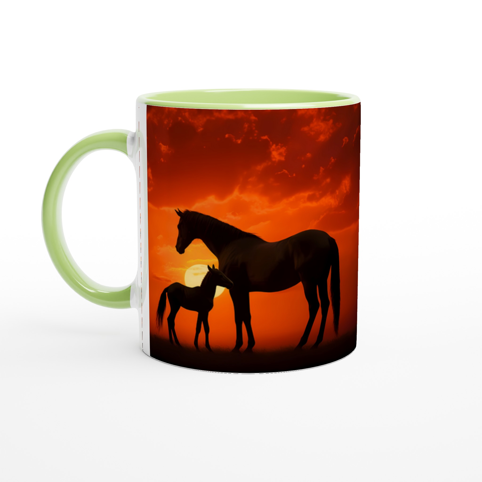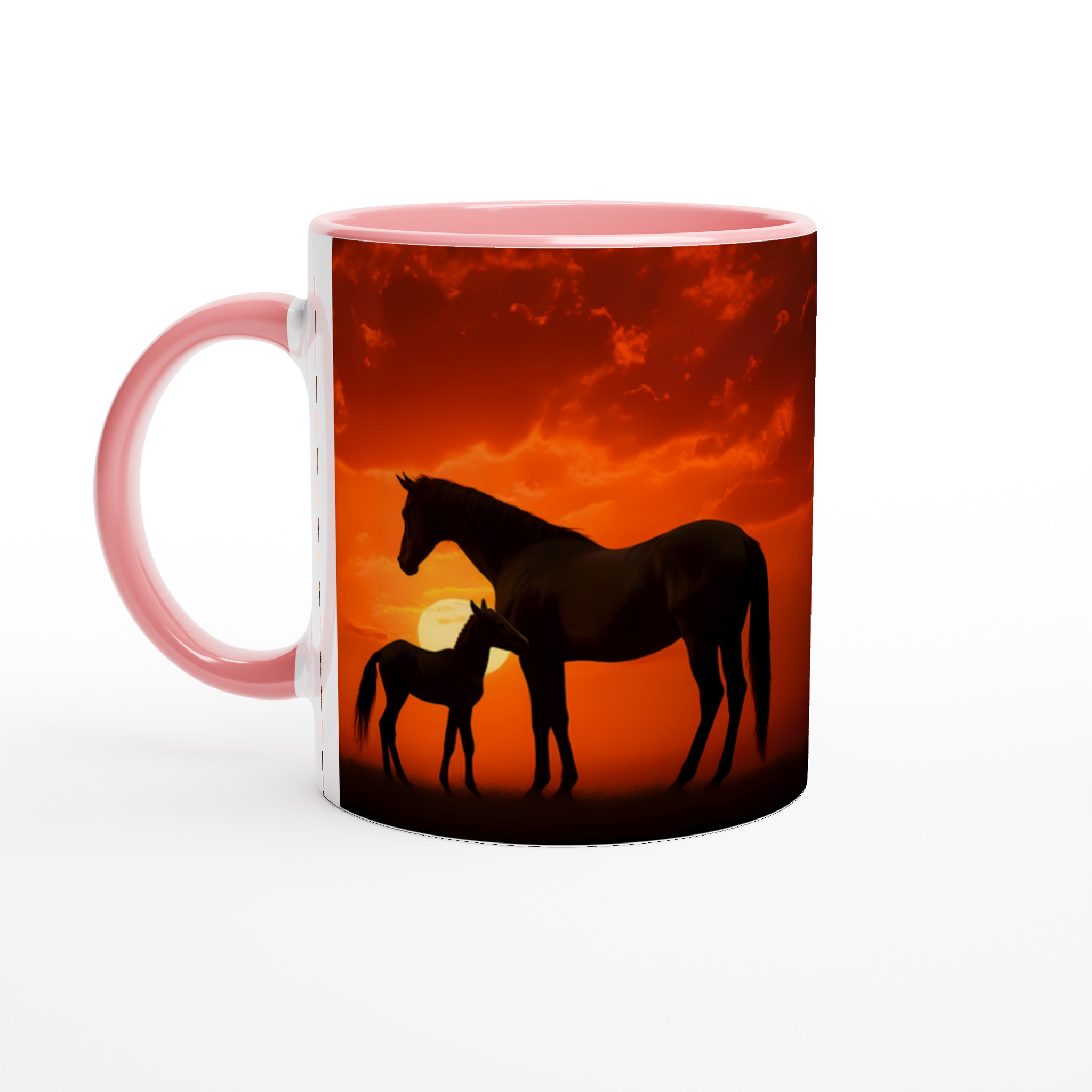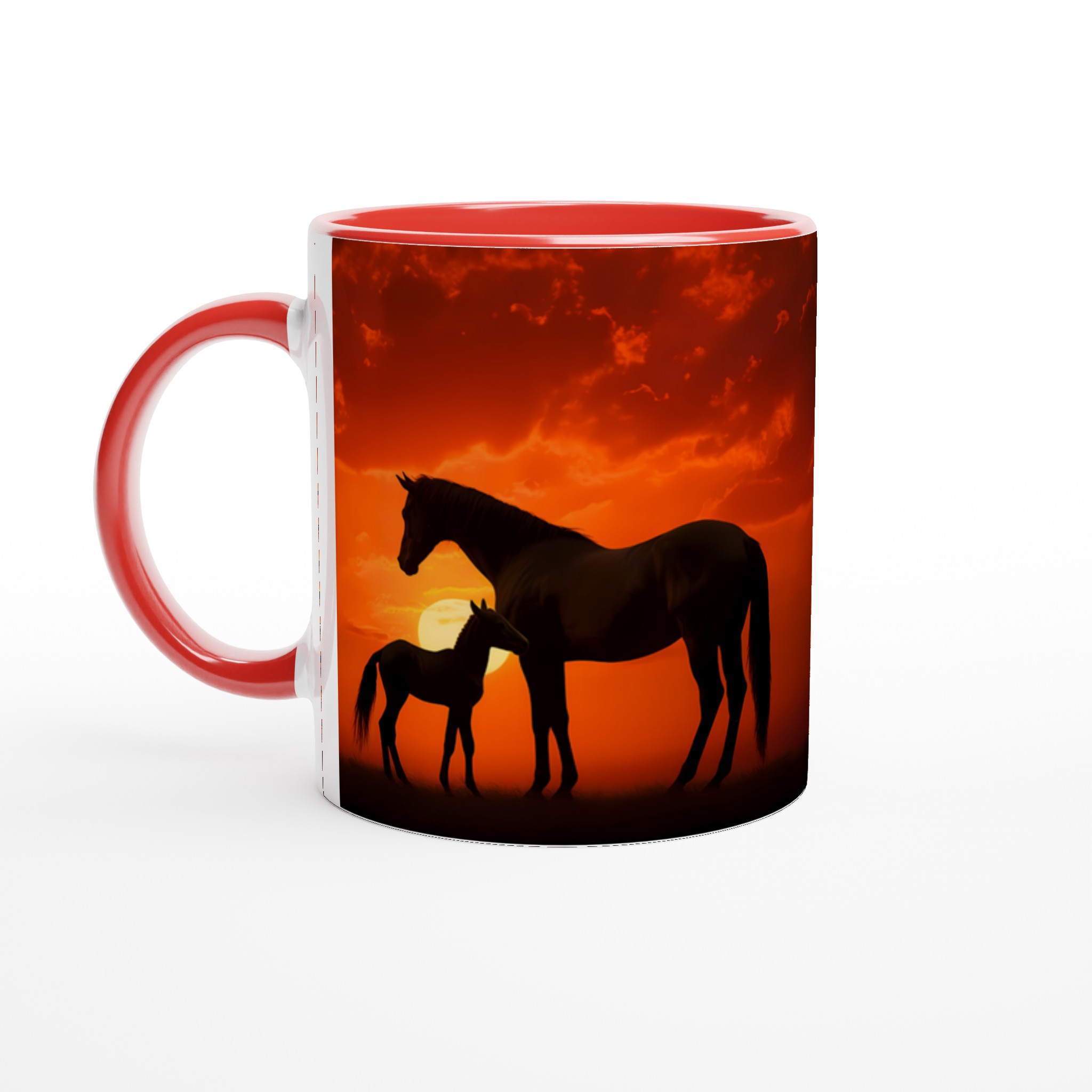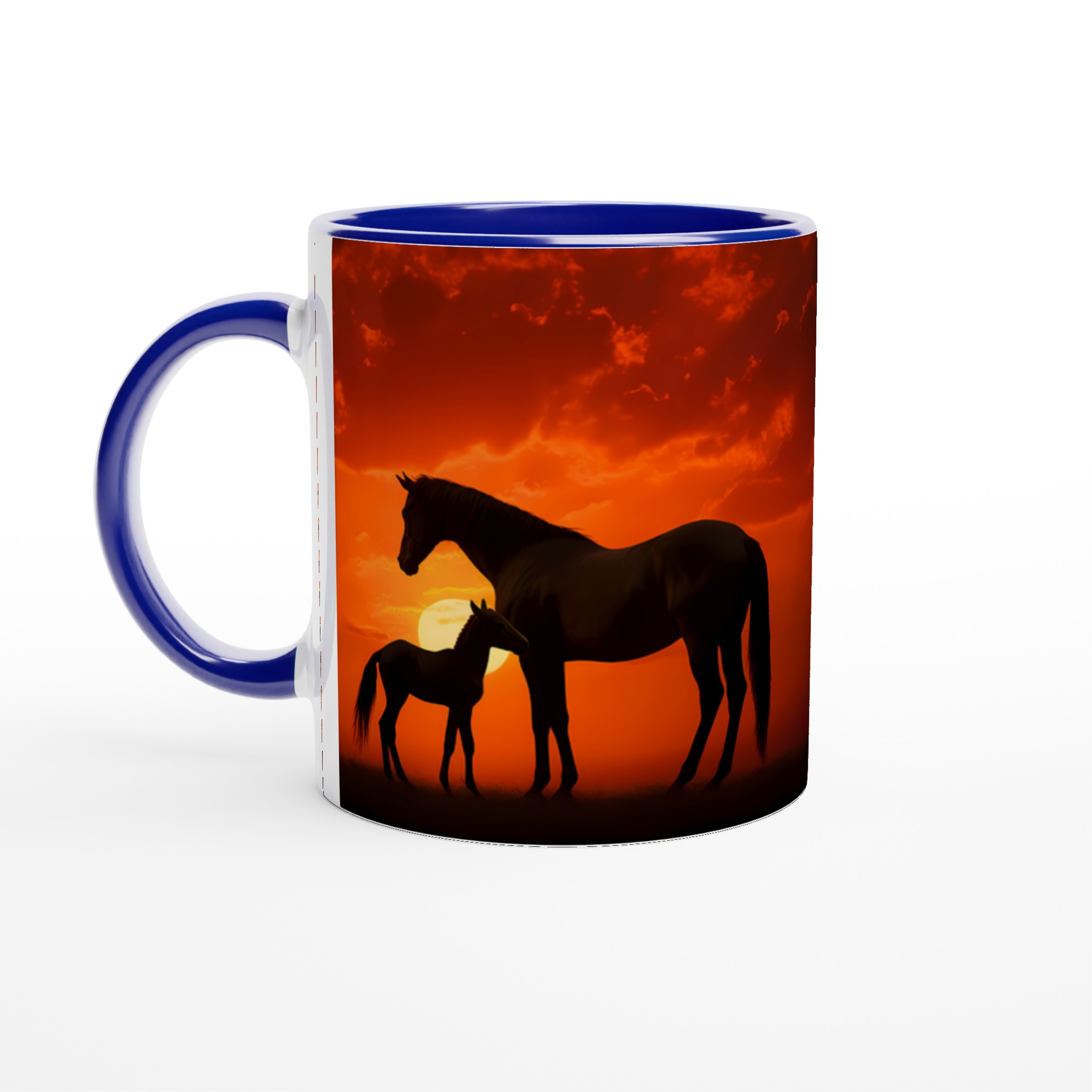 Föreställ dig den lugna skönheten av en solnedgång över prärien, med silhuetter av hästar som står majestätiskt mot en eldig himmel. Denna Keramisk Mugg fångar den känslan perfekt, och blir en vardagsfavorit som förgyller varje stund. Perfekt för morgonkaffet, kvällens varma choklad eller när du bara vill njuta av en kopp te. Den blanka ytan gör att trycken framhävs med klara och levande färger, som håller sig fina även efter många turer i mikron och diskmaskinen.