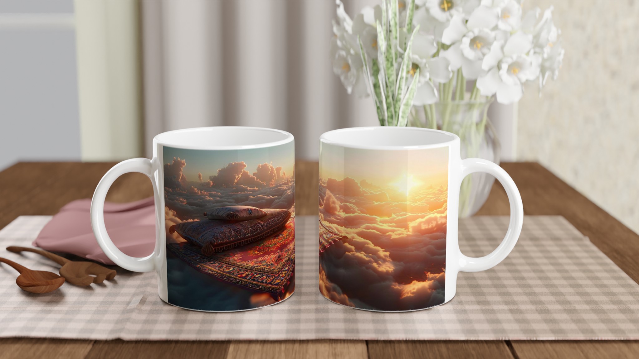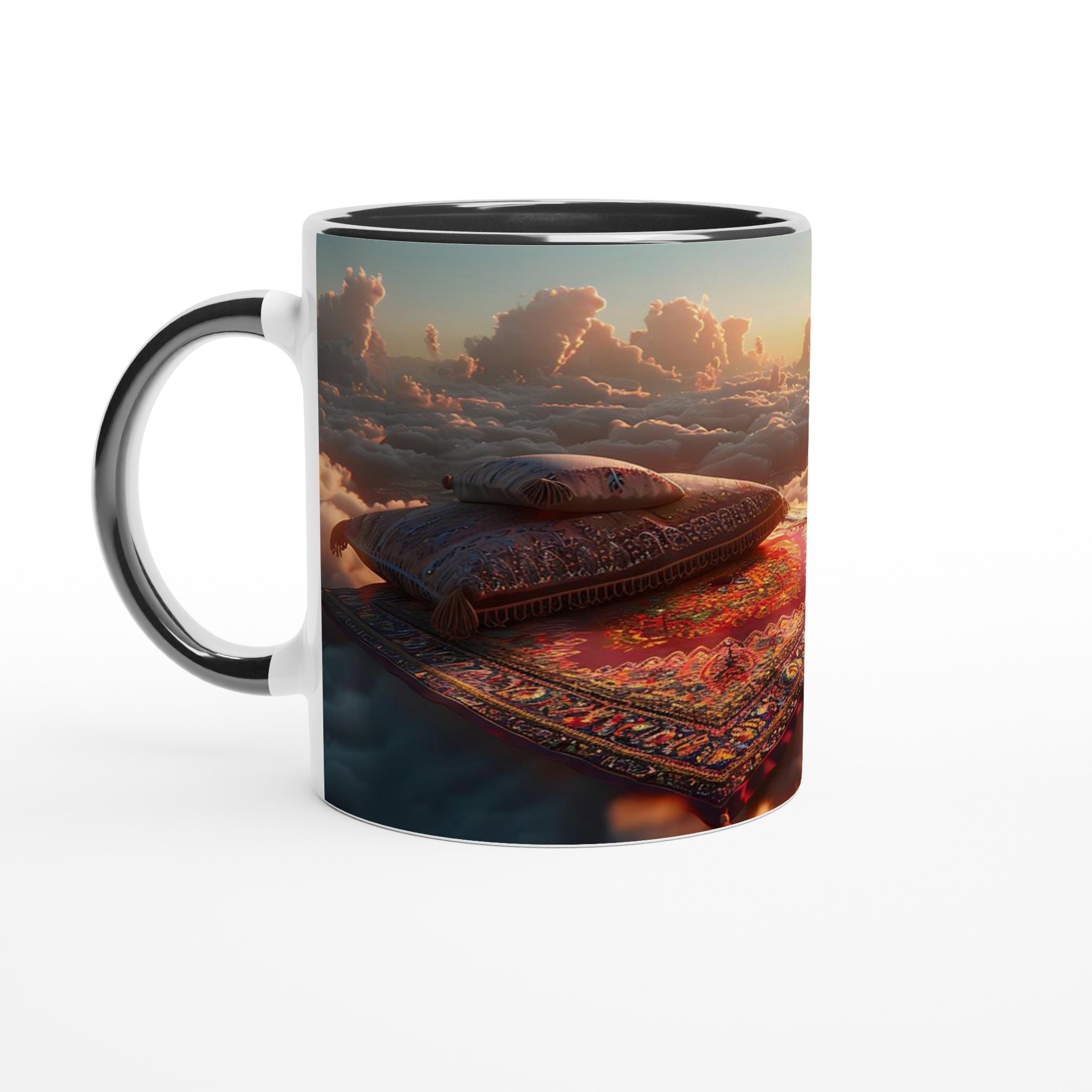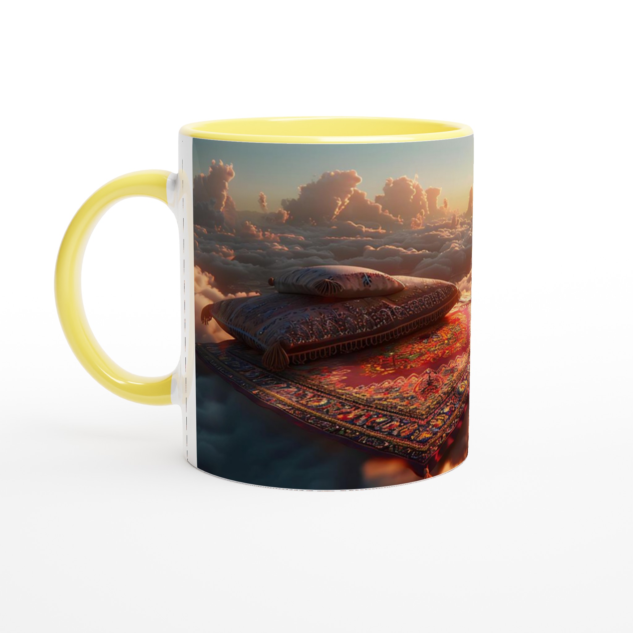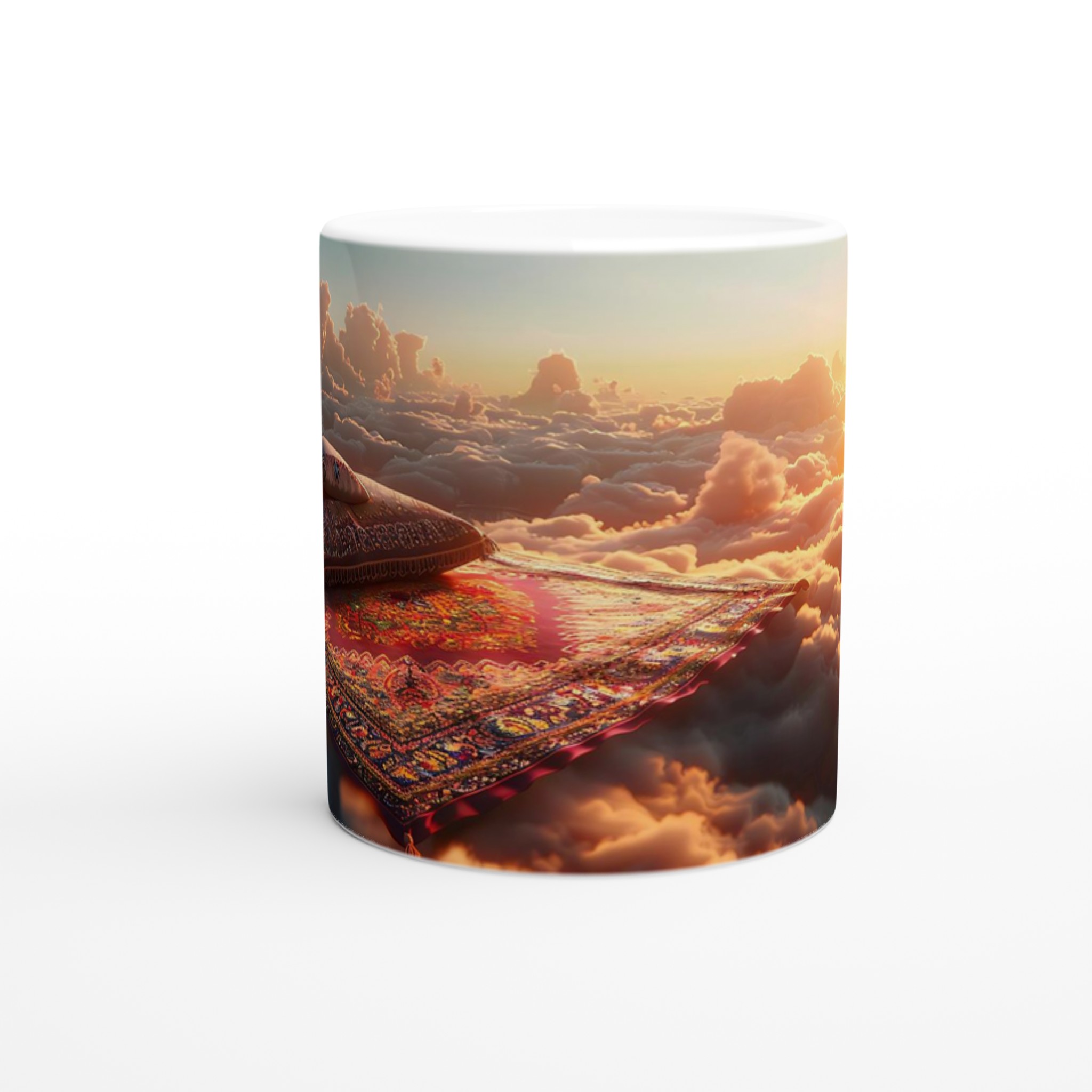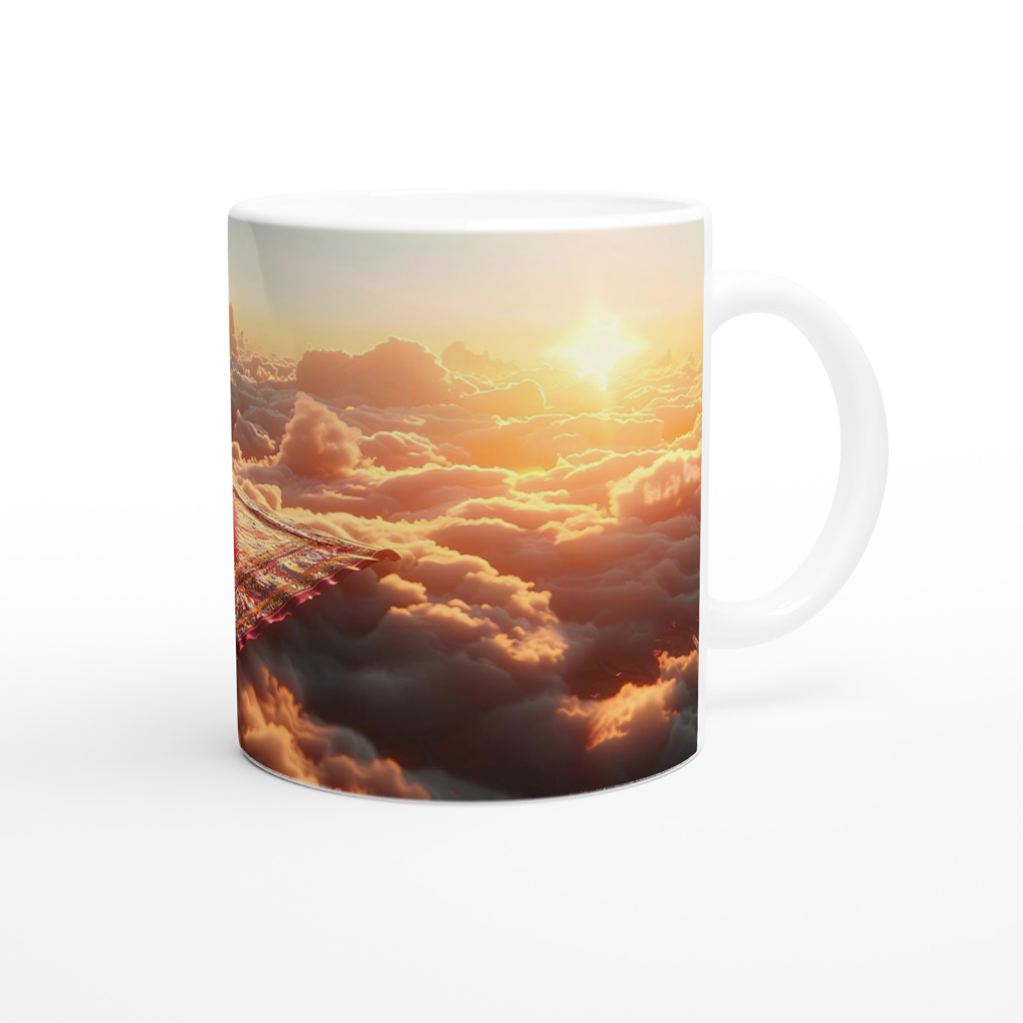 Lyft din vardag till nya höjder med vår ”Magisk Soluppgång” keramiska mugg. Föreställ dig att sväva över molnen vid gryningen, omgiven av gyllene strålar och mjuka pastellfärger – den känslan fångar denna design perfekt. Den här stilrena keramiska muggen blir snabbt en vardagsfavorit, idealisk för ditt morgonkaffe, kvällens varma choklad eller när du bara vill njuta av en kopp te. Den blanka vita ytan ser till att trycken framhävs med klara och levande färger, som håller sig fina även efter många turer i mikron och diskmaskinen.