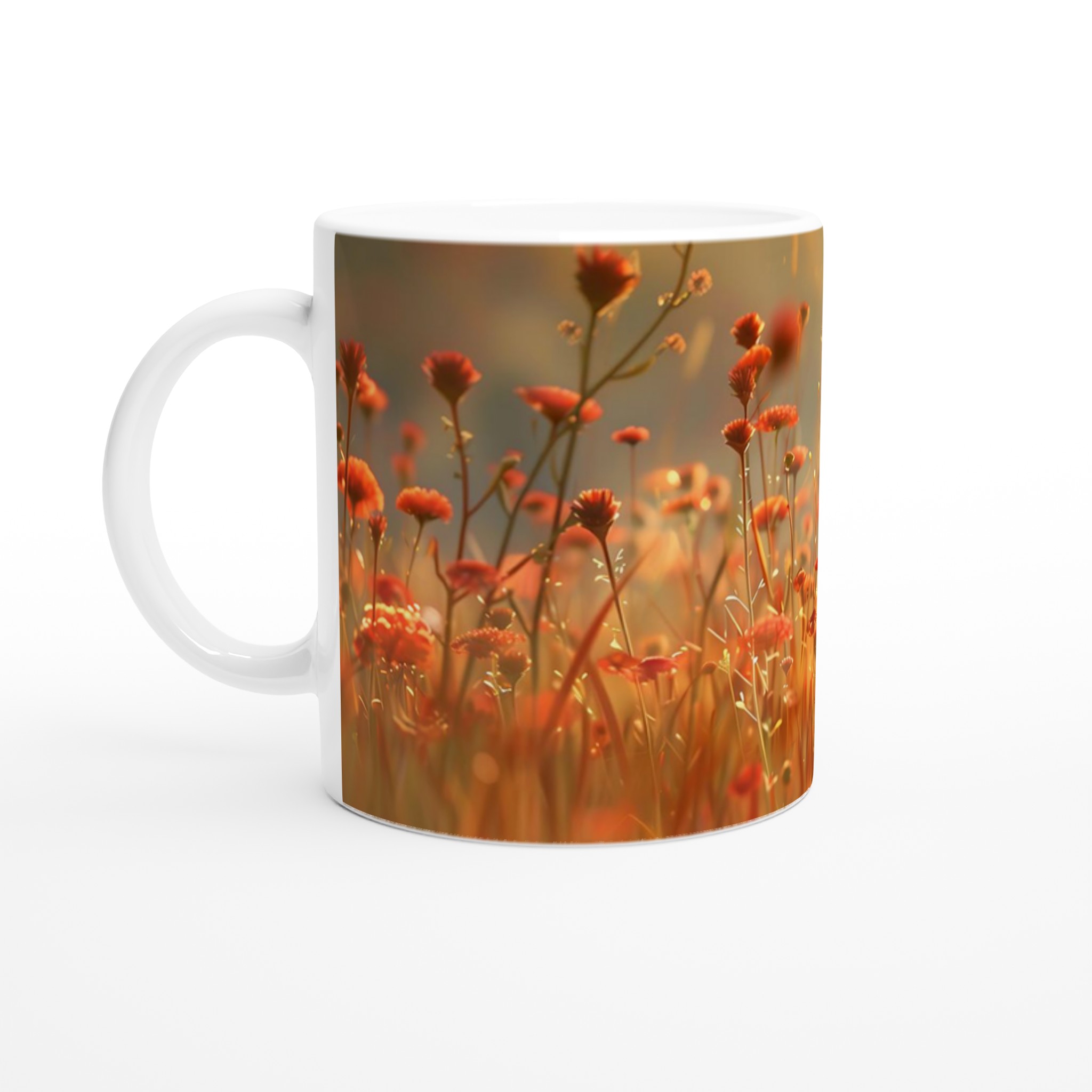 Inspirerad av den fridfulla skönheten i en soluppgång över en äng, där vita fåglar vakar bland daggfriska blommor, inbjuder denna mugg dig att börja varje dag med ett ögonblick av lugn och inspiration. Den blanka vita ytan ger ett skarpt och levande tryck som verkligen sticker ut, oavsett om det är en personlig design, ett roligt citat eller en present till någon du tycker om.