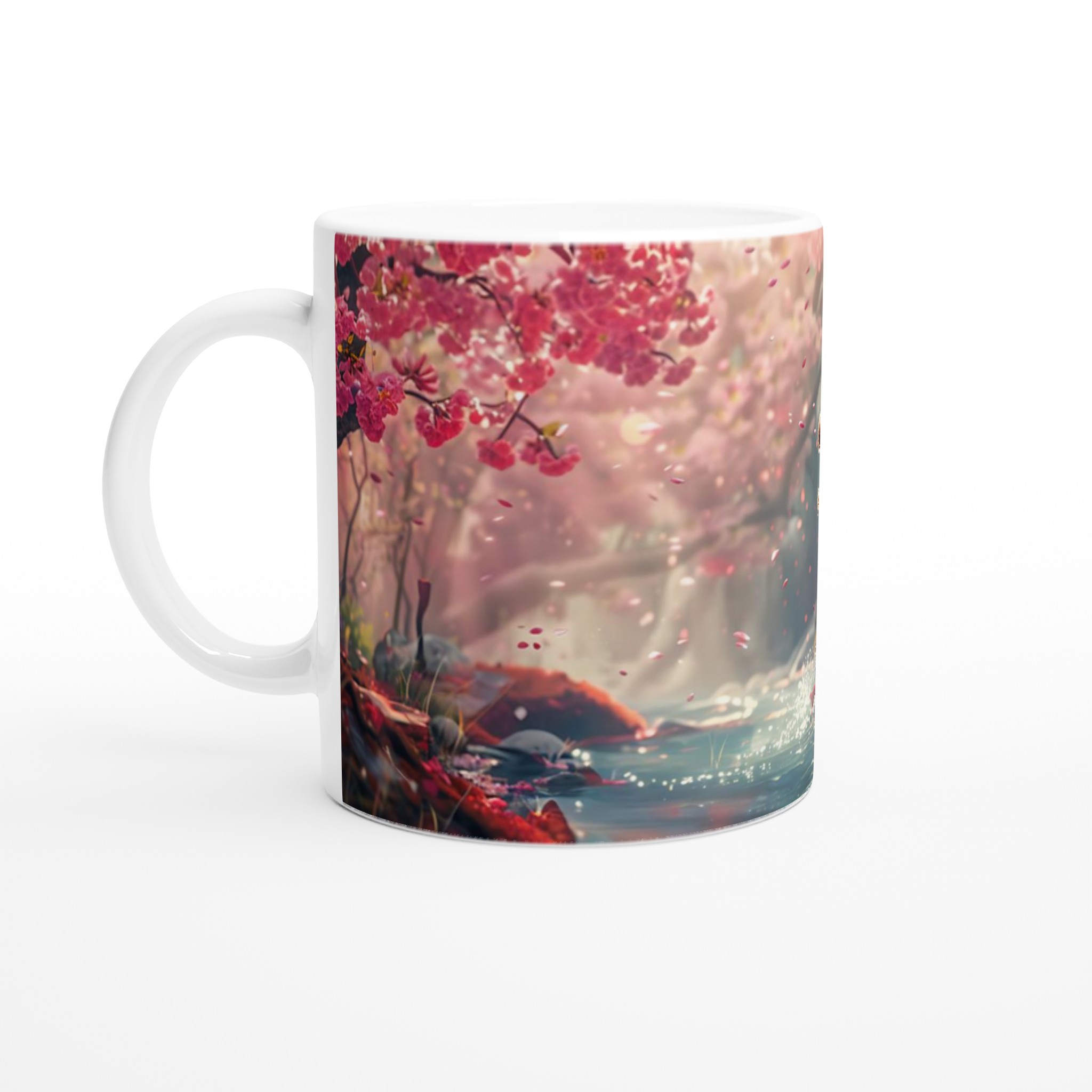 Föreställ dig en lugn stund vid floden, omgiven av blommande körsbärsträd och en majestätisk björn som fångar ögonblicket. Denna mugg fångar en drömlik våratmosfär med sin förtrollande illustration, perfekt för naturälskare och de som uppskattar en touch av magi i vardagen. Den blanka vita ytan ger ett skarpt och levande tryck som verkligen sticker ut, oavsett om det är en personlig design, ett roligt citat eller en present till någon du tycker om.