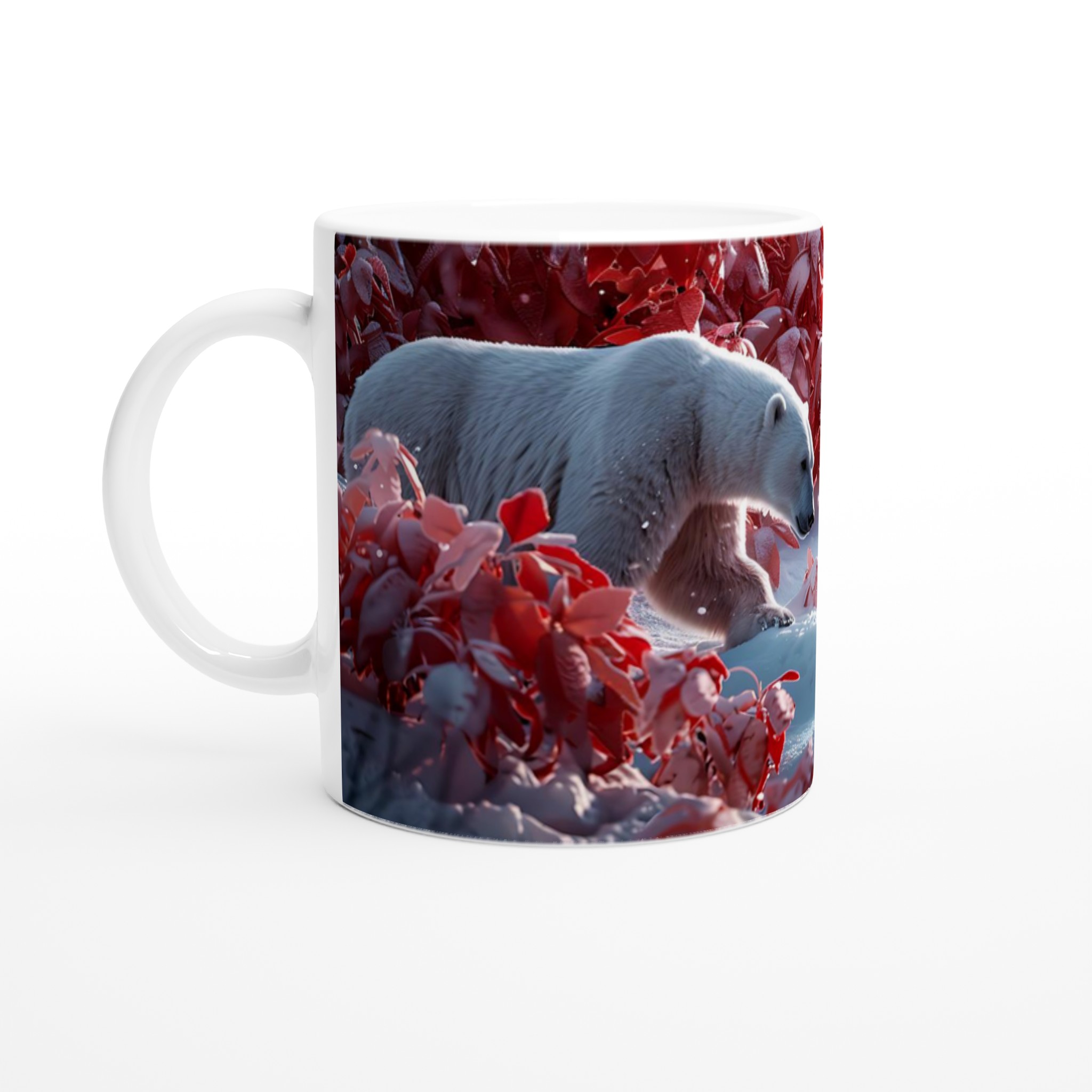 Förvandla varje fikapaus till en förtrollande stund med vår premium keramikmugg – inspirerad av ett magiskt vinterlandskap där en ståtlig isbjörn vandrar bland snötäckta, rosenröda buskar.