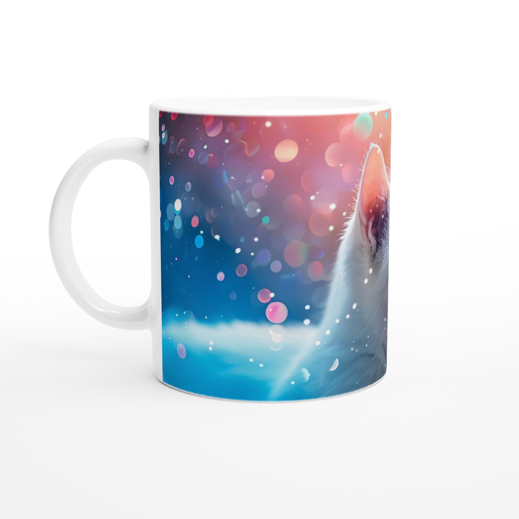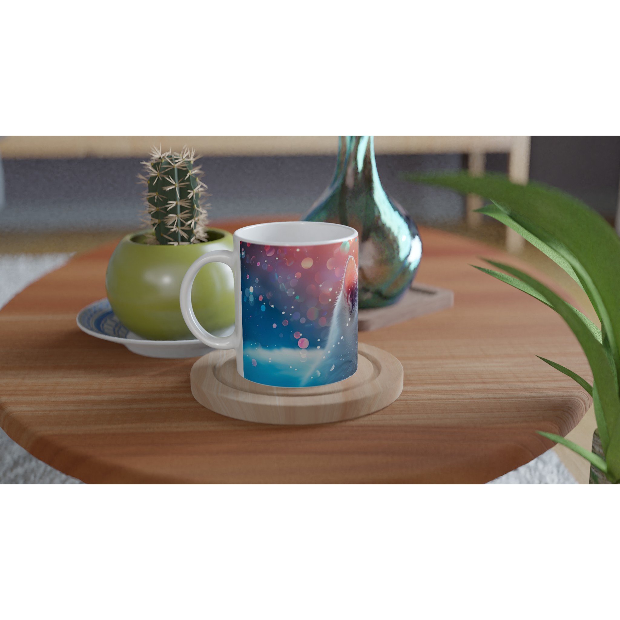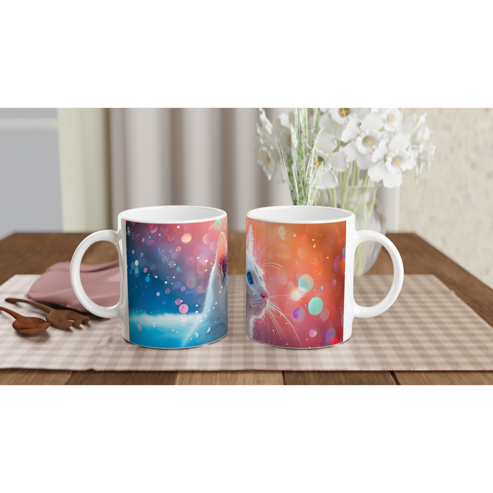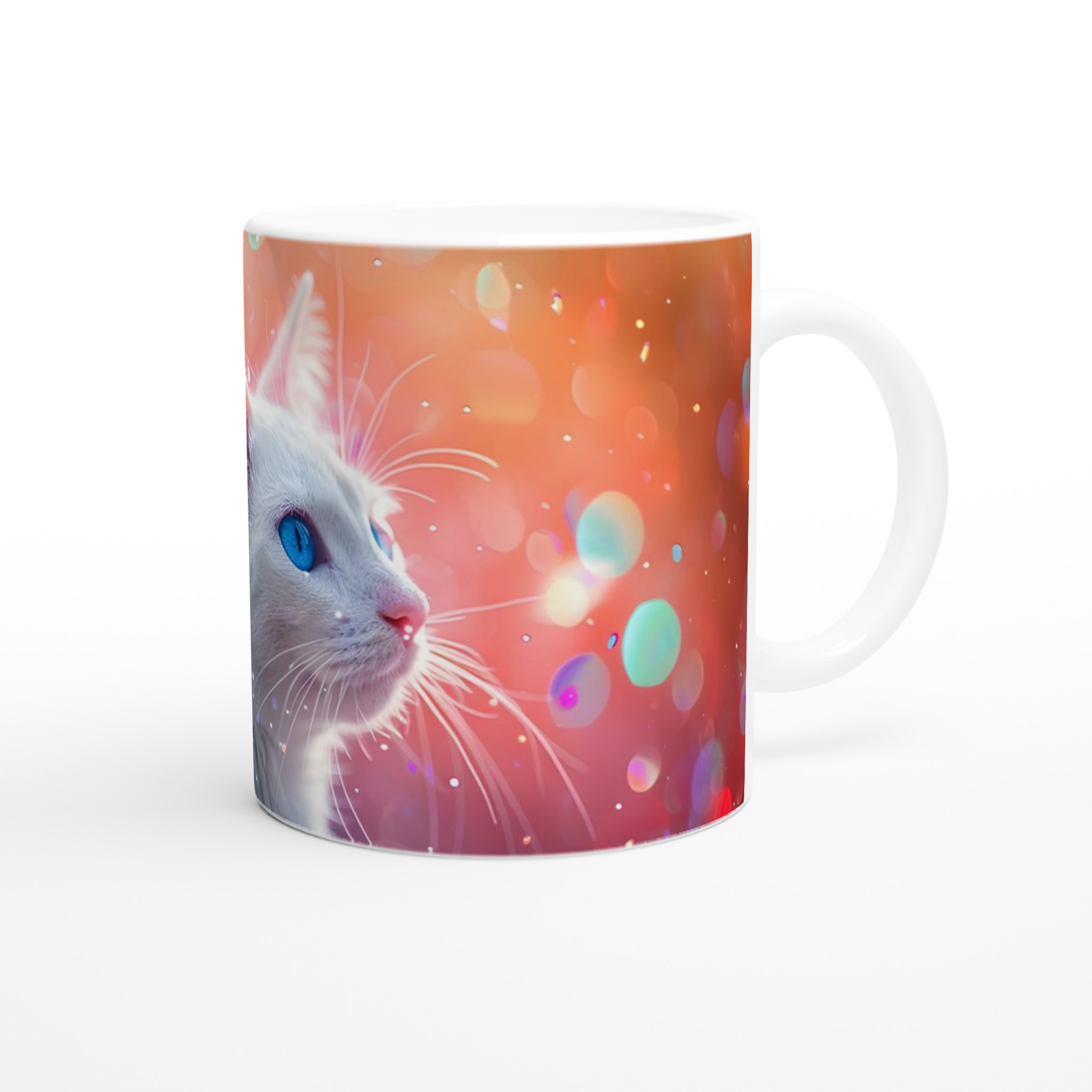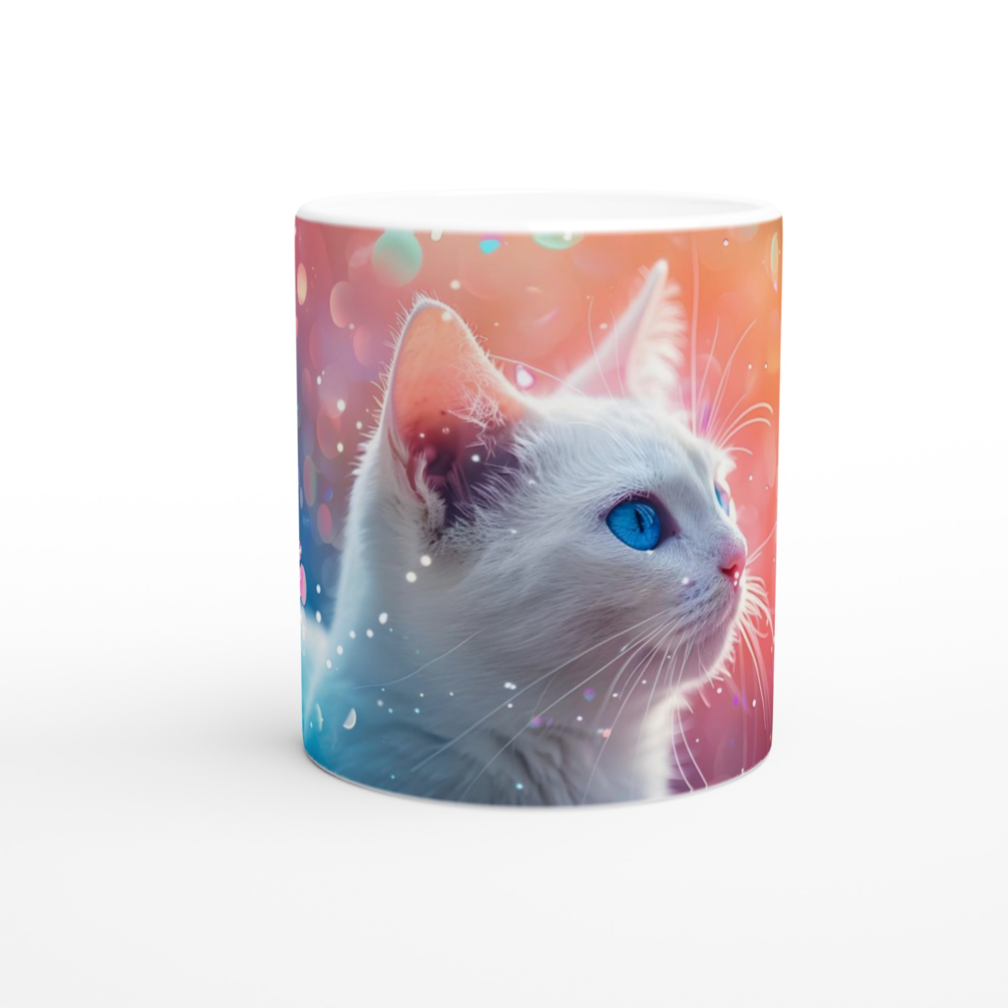 Fånga magin varje dag med denna förtrollande keramikmugg som pryds av en bedårande vit katt med piercingblå ögon, omgiven av ett drömskt skimmer av rosa, blått och orange. Denna mugg är perfekt för alla dagens stunder – morgonkaffet, en värmande kopp te eller en härlig varm choklad. Låt den glittrande designen och den lugna kattens blick transportera dig till en värld av fantasi och värme varje gång du tar en klunk.