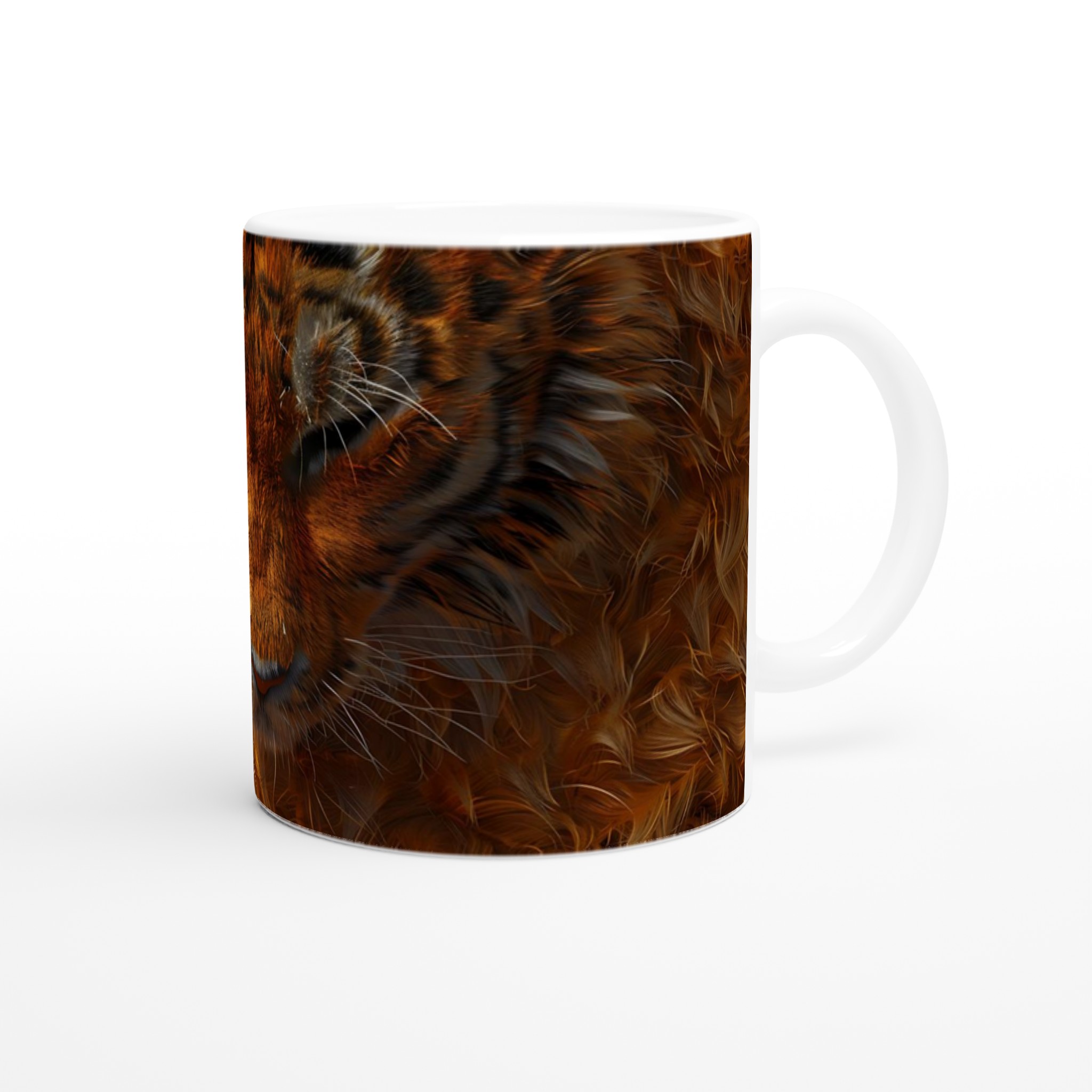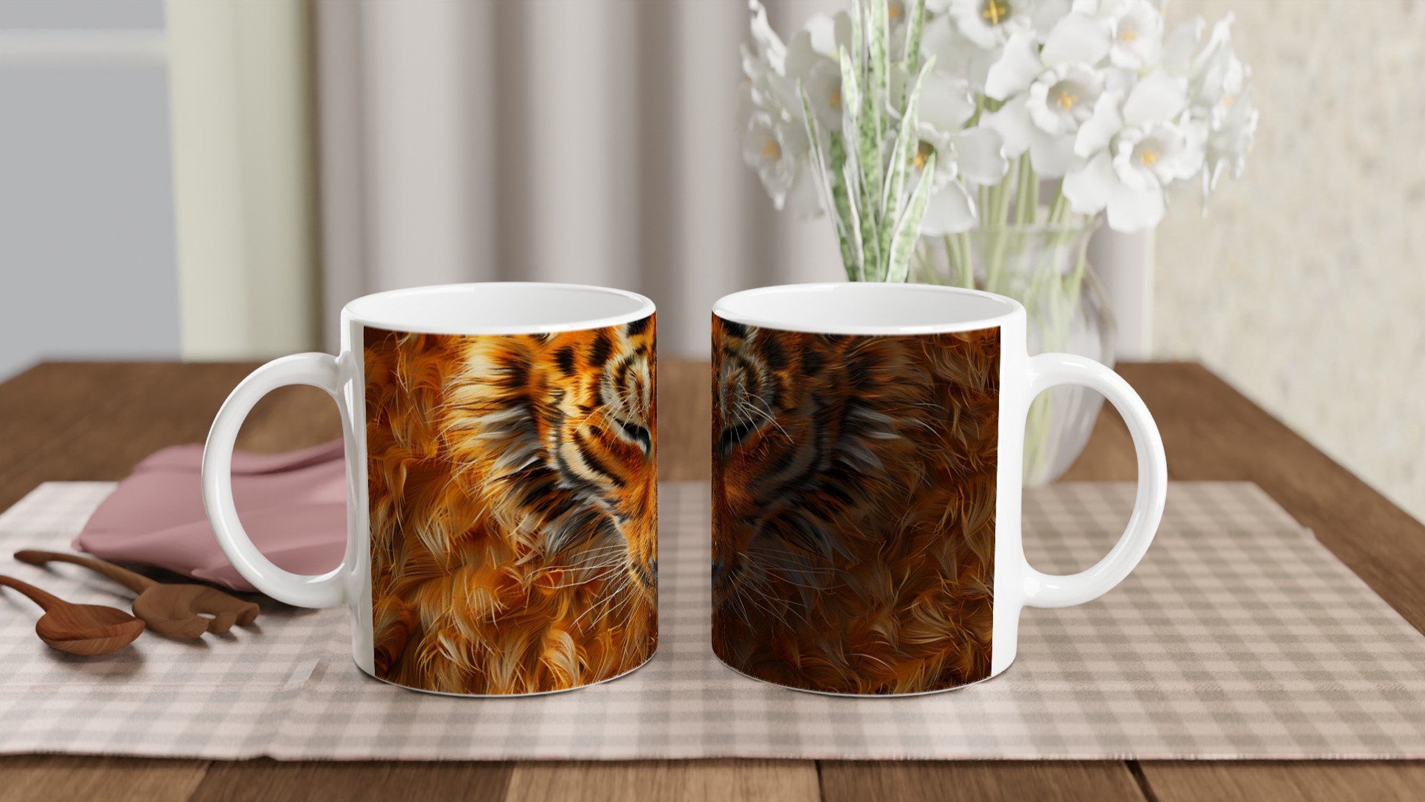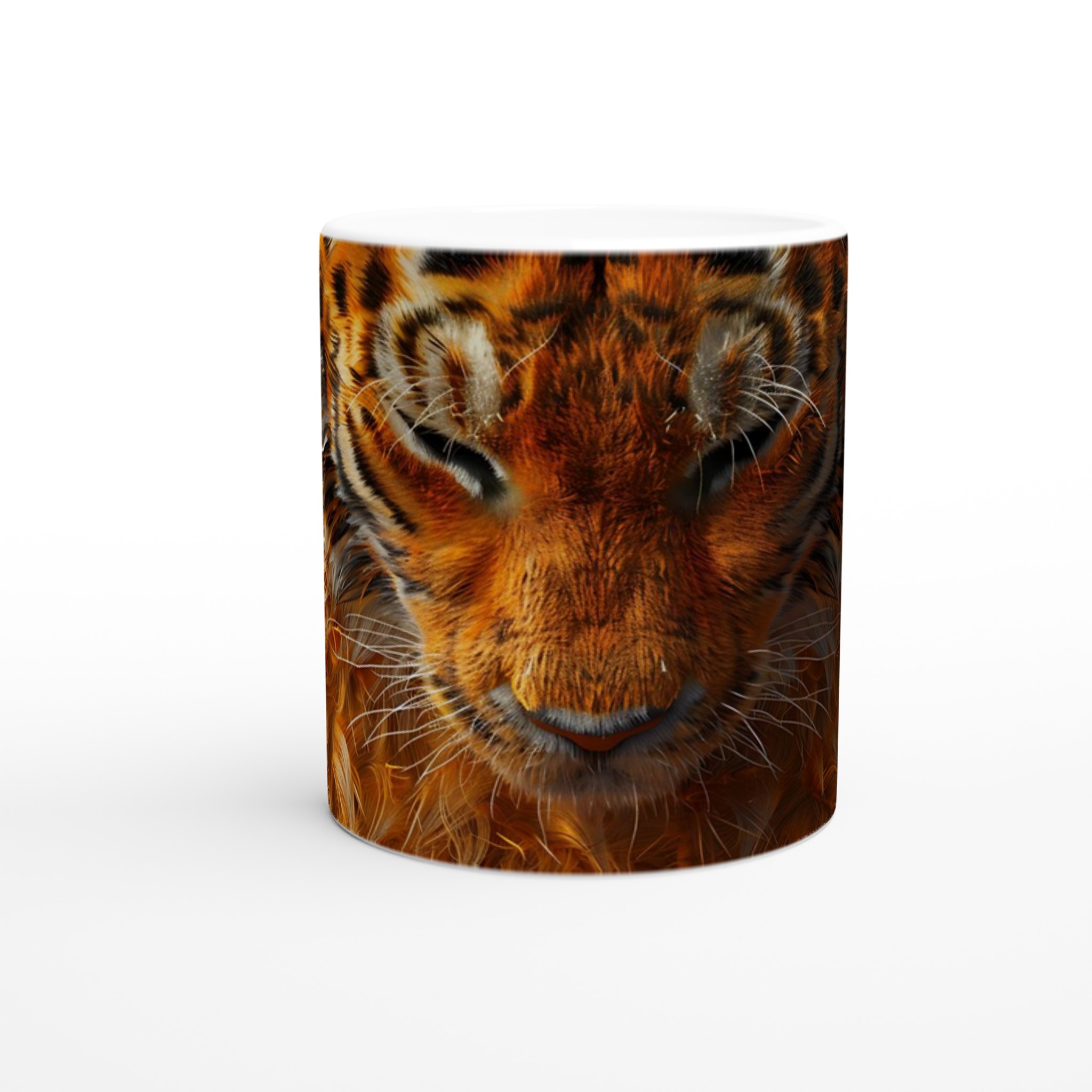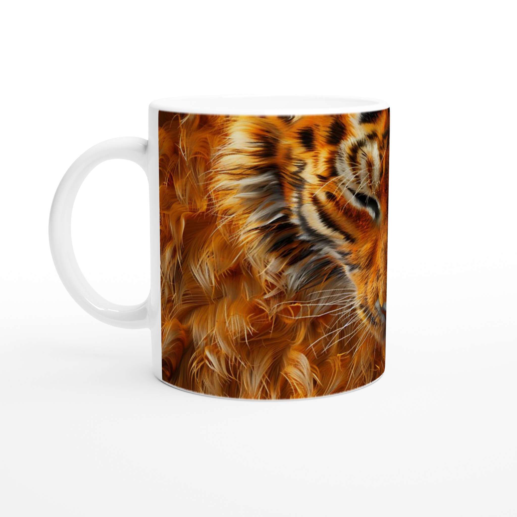 Upplev djungelns storslagenhet varje gång du tar en klunk med denna majestätiska keramiska mugg. Dess design fångar den vilda skönheten hos en tiger, med en rik palett av guldiga, orangea och jordnära toner som skapar en känsla av lyx och styrka. Den blanka ytan låter trycket framhävas med otrolig detaljrikedom och livfulla färger, vilket gör den till en sann blickfångare i ditt hem eller på kontoret.