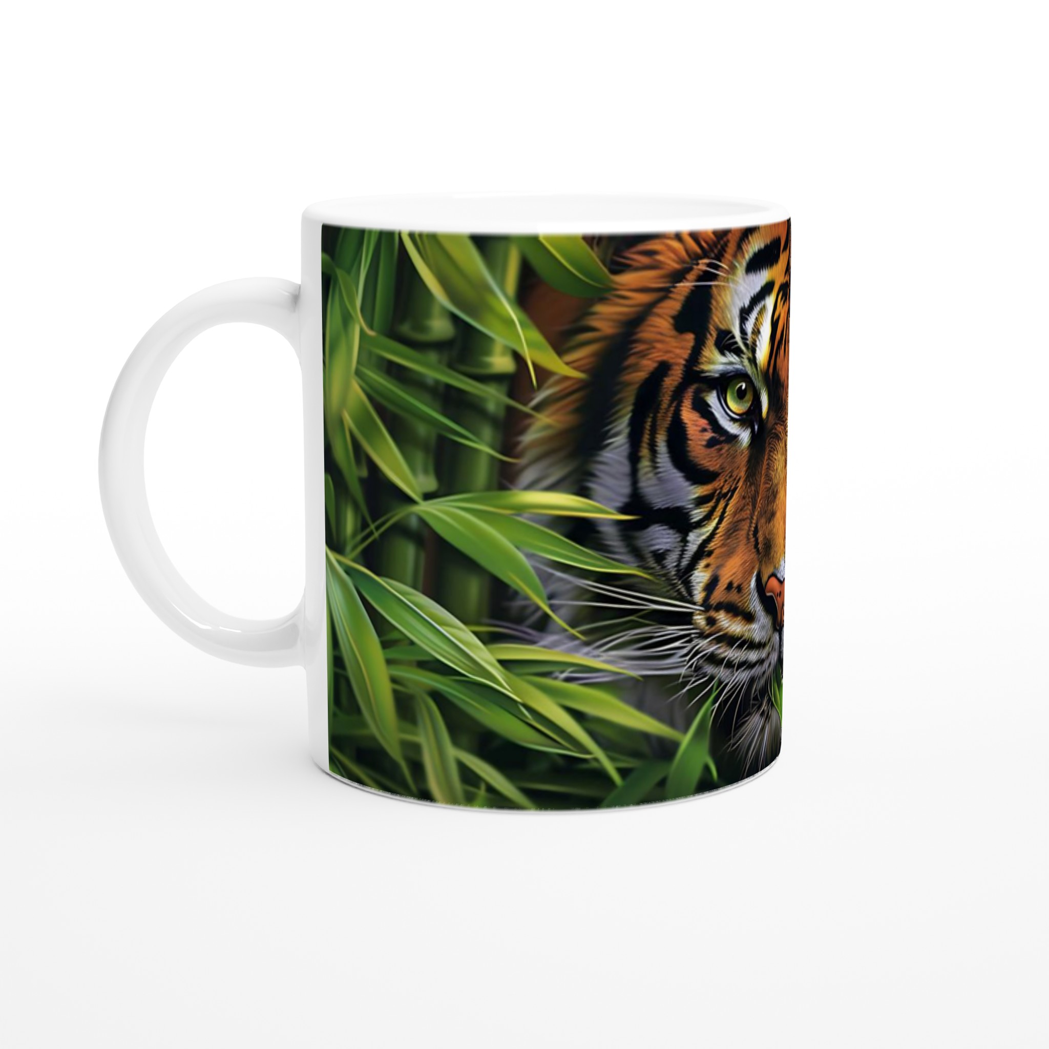 Fånga den orädda andan av djungeln med denna majestätiska tigermugg. Den detaljerade bilden av tigern som blickar fram genom frodiga bambublad, med sina genomträngande gröna ögon, skapar en känsla av mystik och styrka som kommer att inspirera varje gång du tar en klunk. En perfekt present för naturälskaren eller den som uppskattar konstnärliga motiv. Välj din favoritmugg från ett spektrum av färger, inklusive klassiskt vitt, lekfullt gult, mjukt rosa, lugnande grönt, passionerat rött, elegant svart eller djupt blått, för att matcha din stil eller sprida glädje.