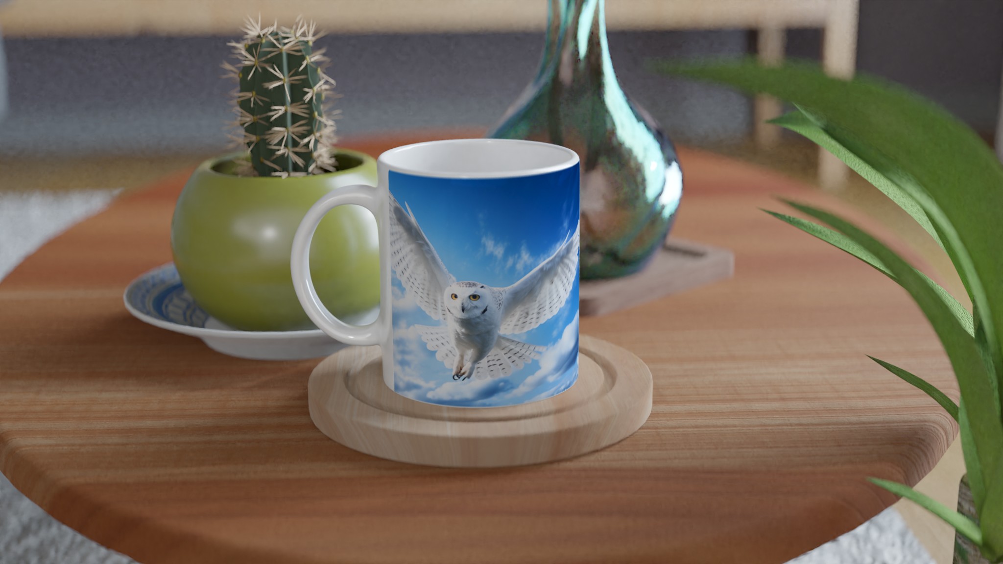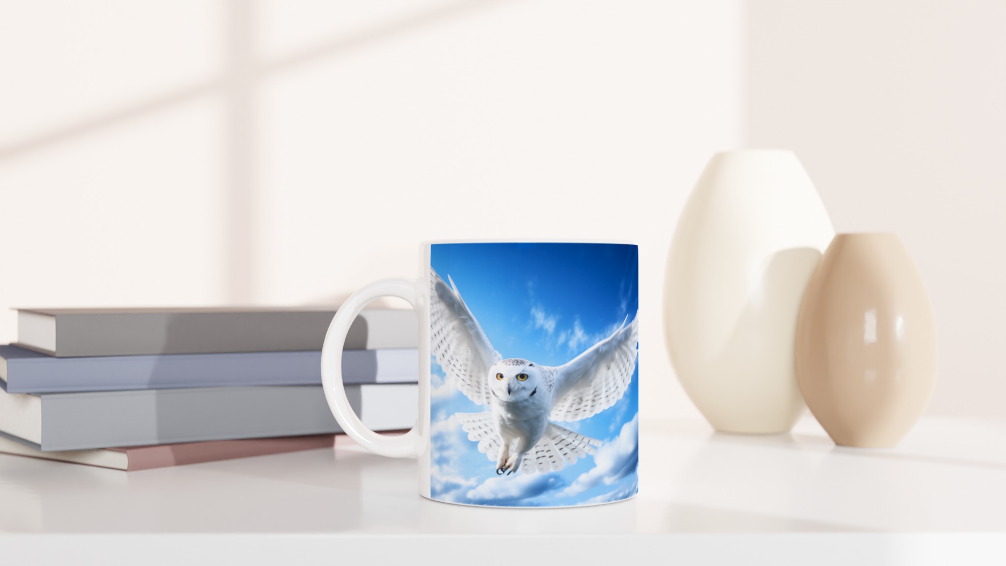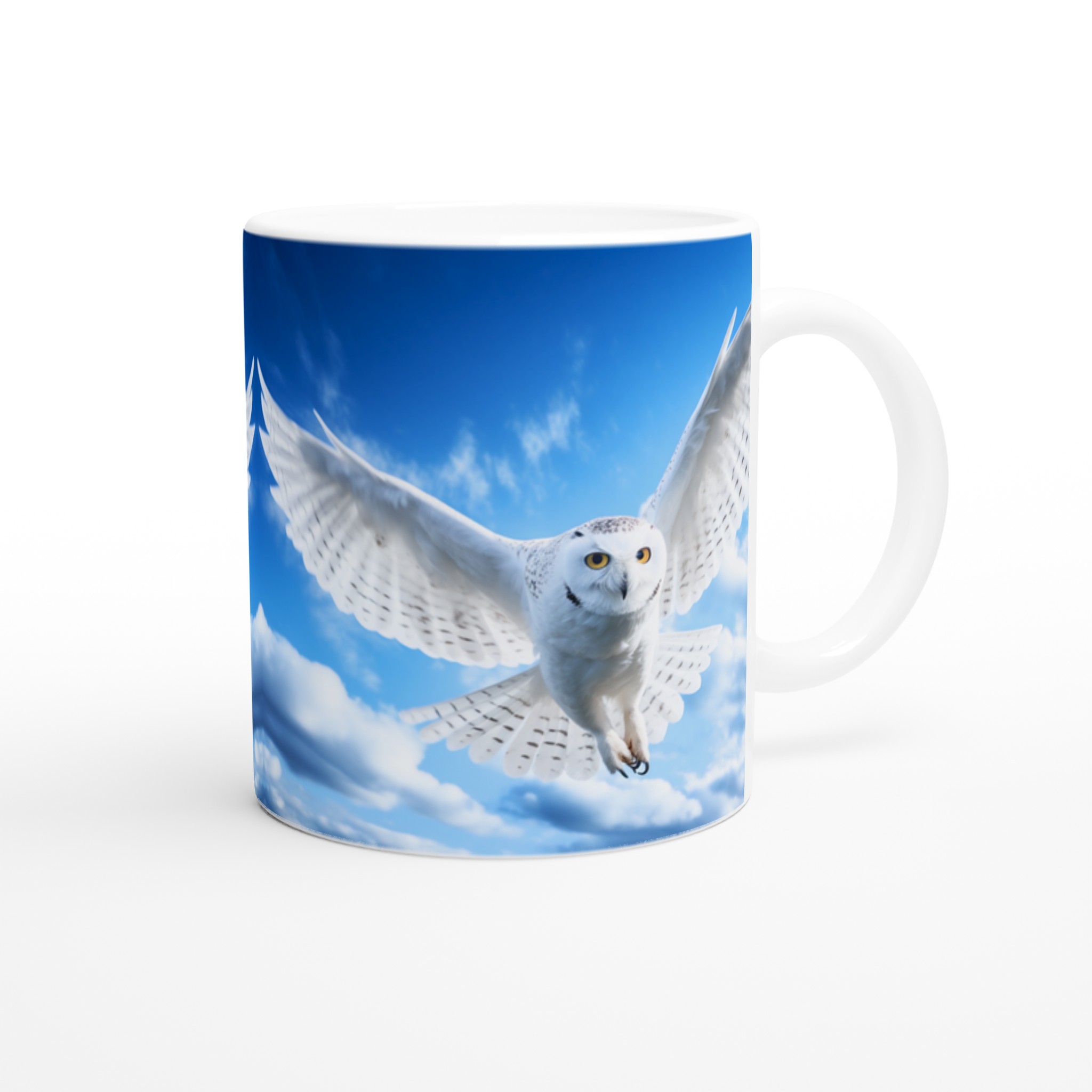 Låt dig inspireras varje dag med vår majestätiska keramiska mugg, som fångar den lugna skönheten hos en snöuggla i flykt under en klarblå himmel. Denna mugg blir snabbt en vardagsfavorit, perfekt för ditt morgonkaffe, kvällens varma choklad eller när du bara vill njuta av en kopp te.