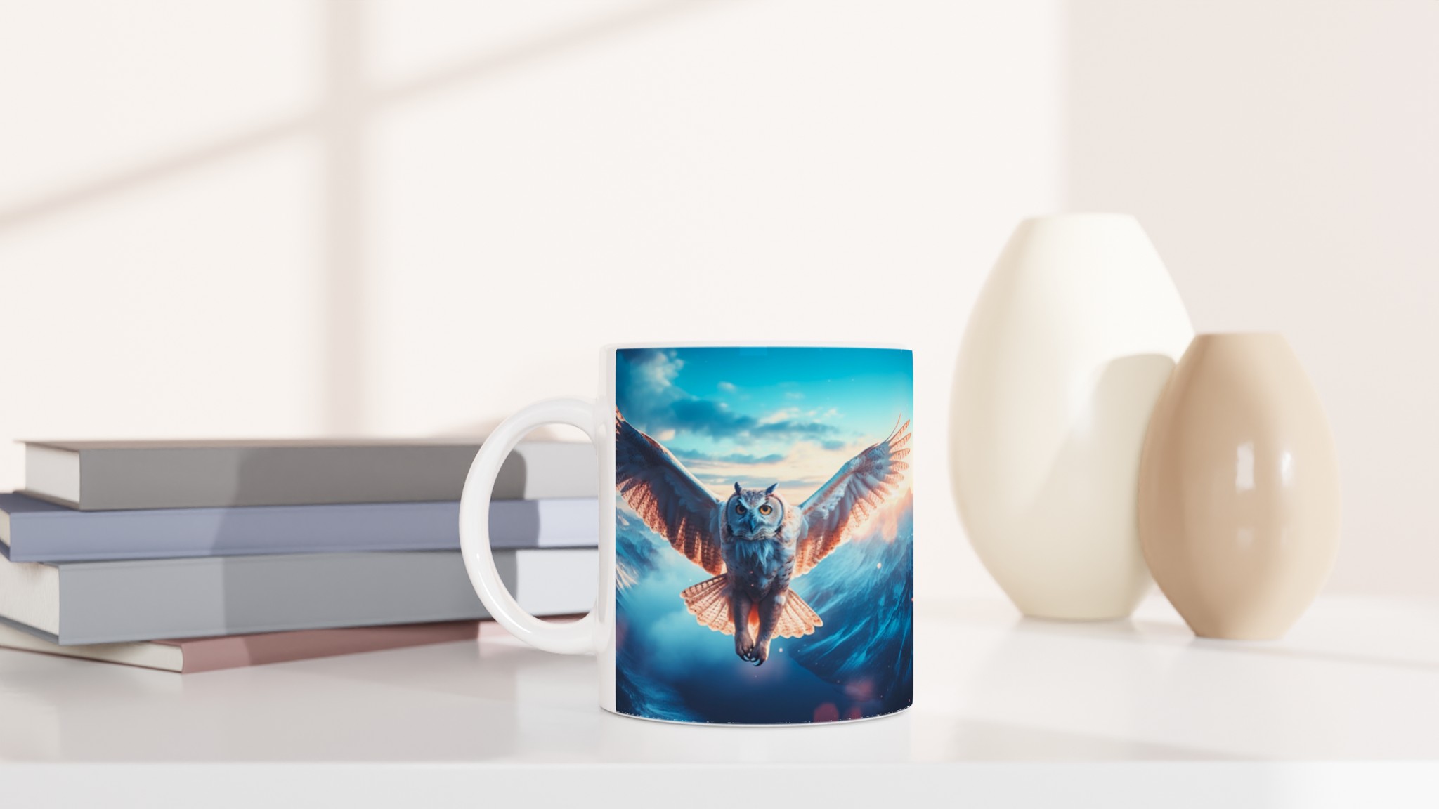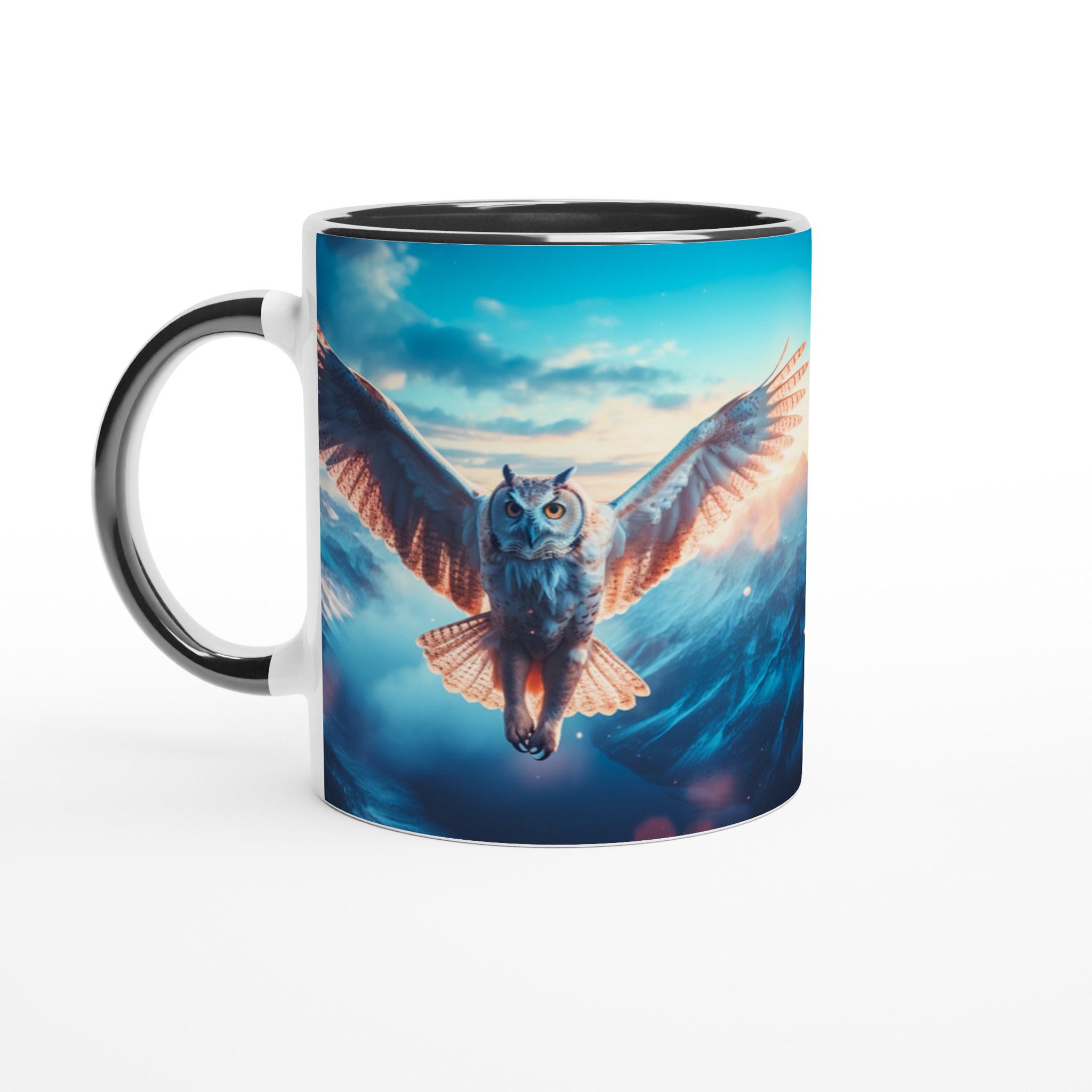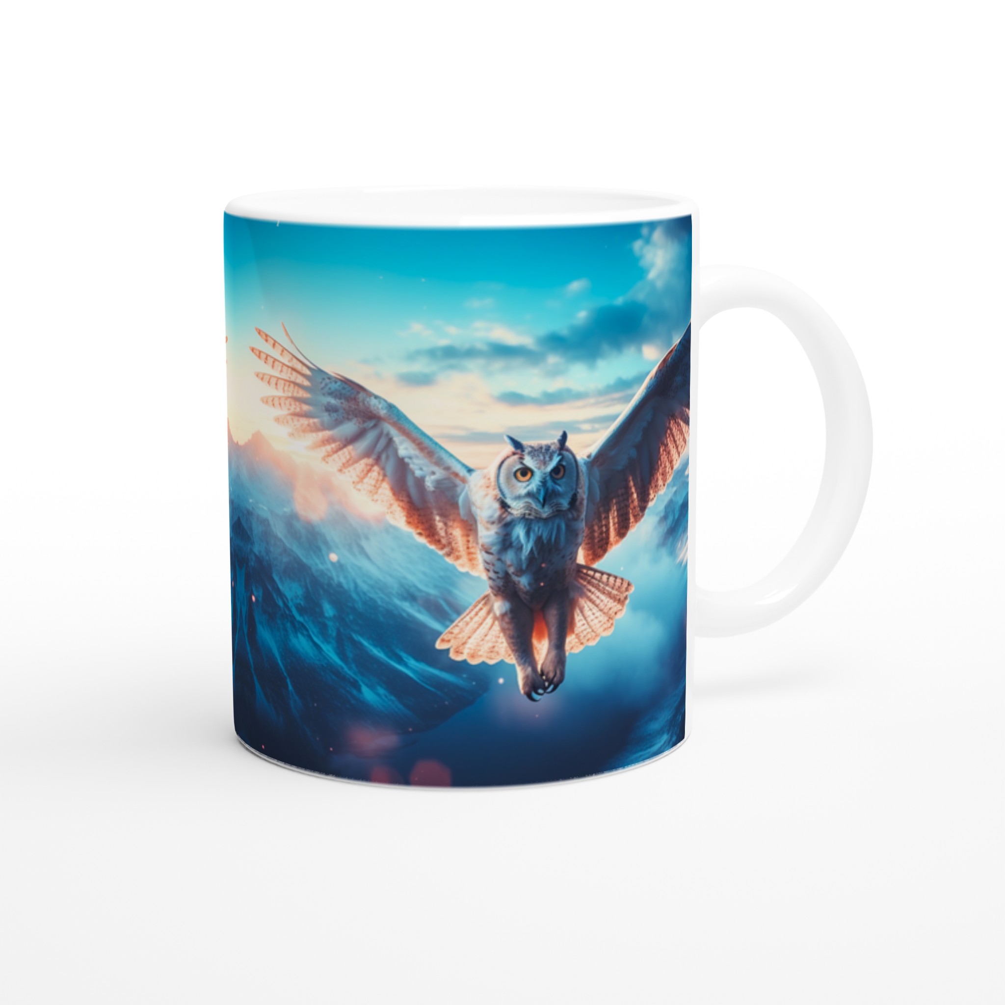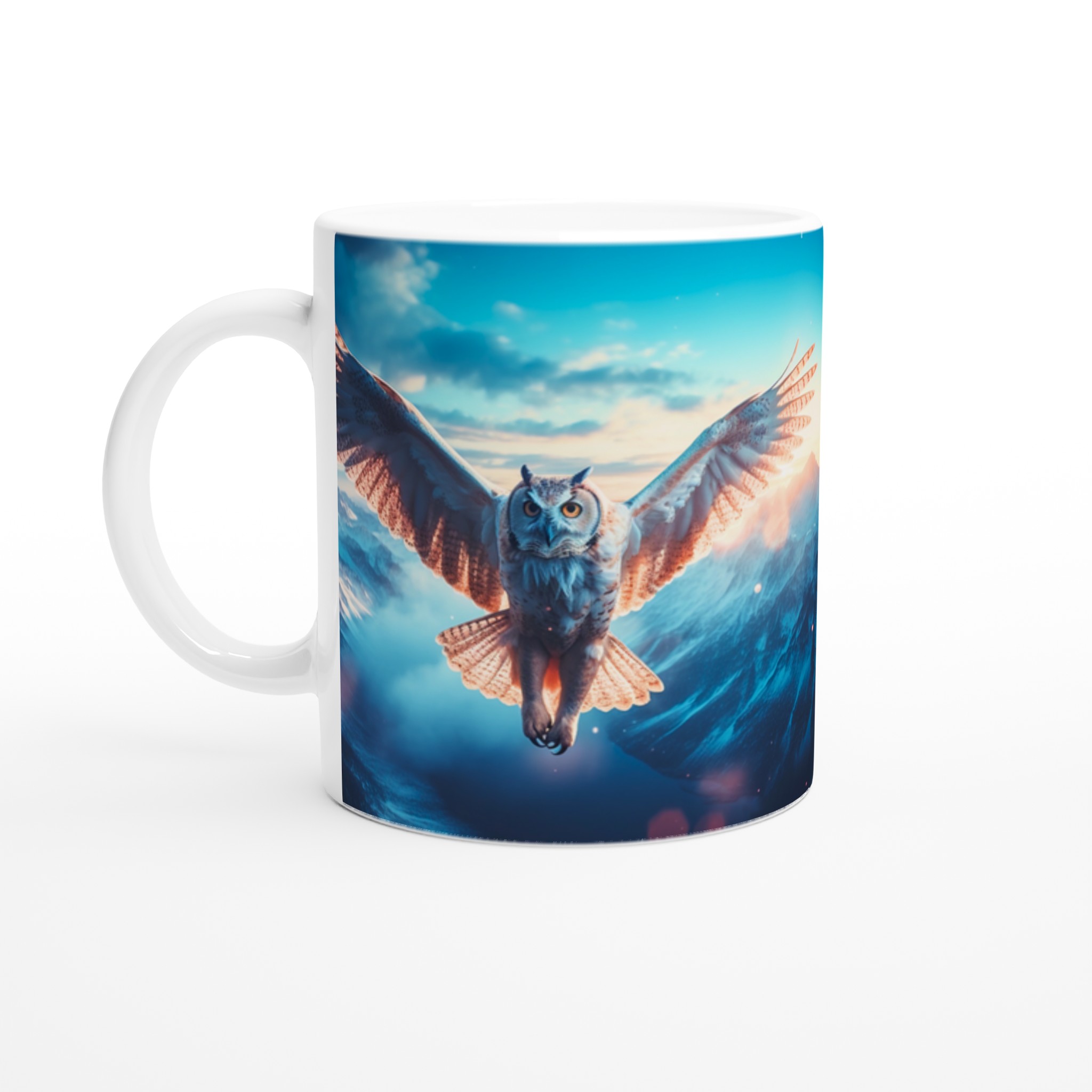 Fånga den magiska känslan av frihet med vår keramiska mugg med motiv av majestätiska ugglor i solnedgången över snöklädda berg. Denna mugg är mer än bara en dryckesbehållare; den är en inbjudan att drömma dig bort till höga höjder och vidsträckta vyer, perfekt för att starta din morgon med inspiration eller för att koppla av med en varm dryck på kvällen.