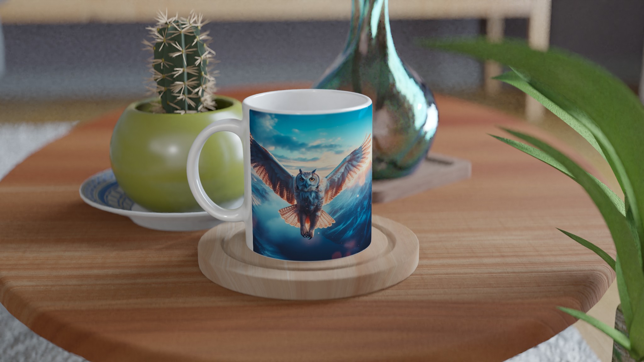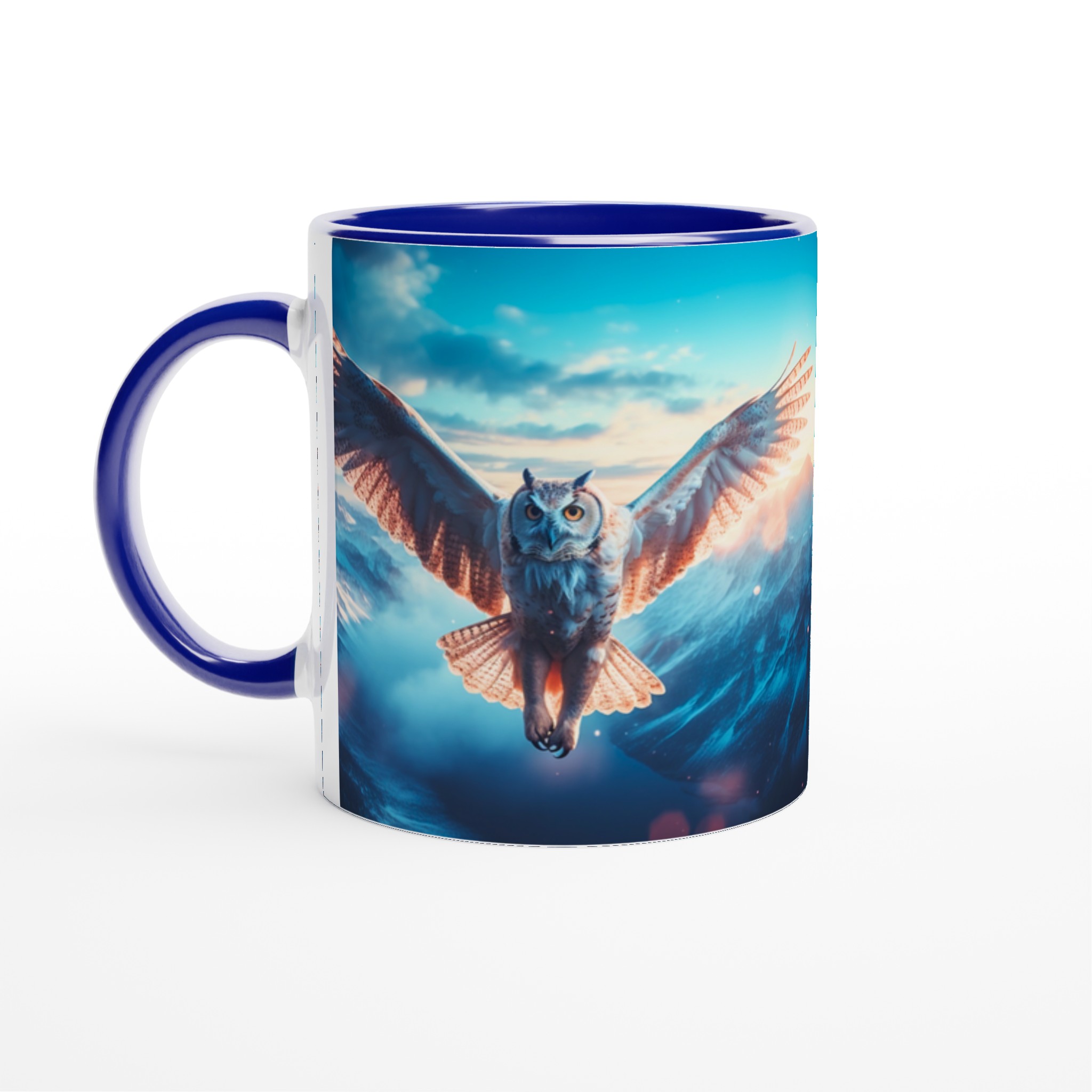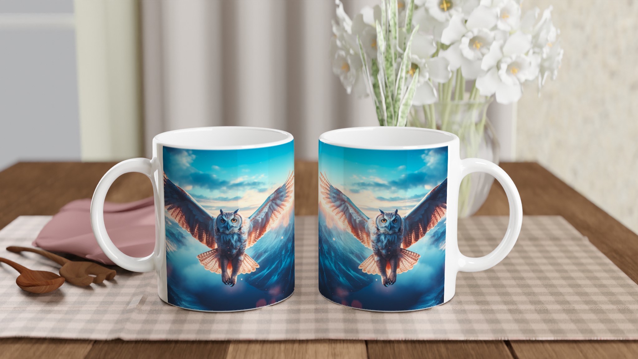 Fånga den magiska känslan av frihet med vår keramiska mugg med motiv av majestätiska ugglor i solnedgången över snöklädda berg. Denna mugg är mer än bara en dryckesbehållare; den är en inbjudan att drömma dig bort till höga höjder och vidsträckta vyer, perfekt för att starta din morgon med inspiration eller för att koppla av med en varm dryck på kvällen.