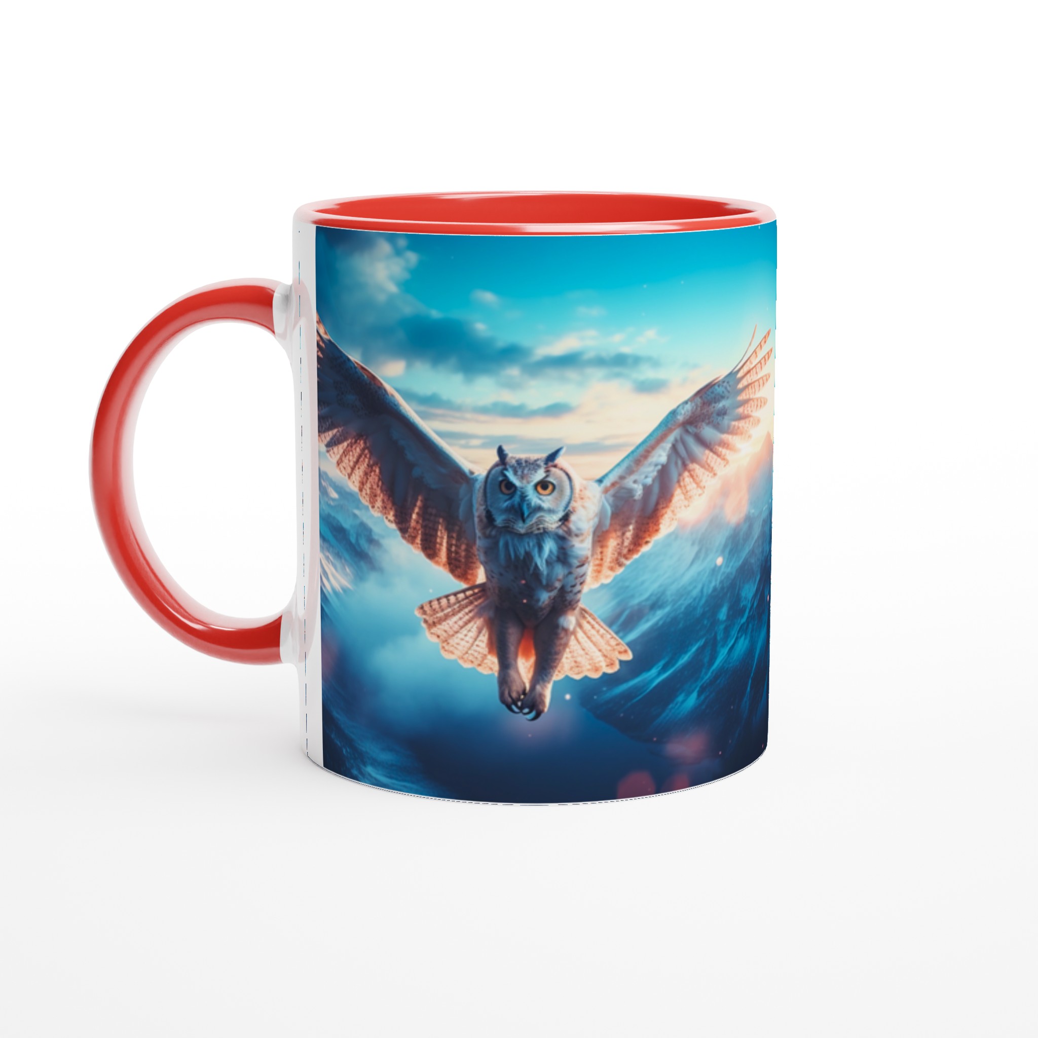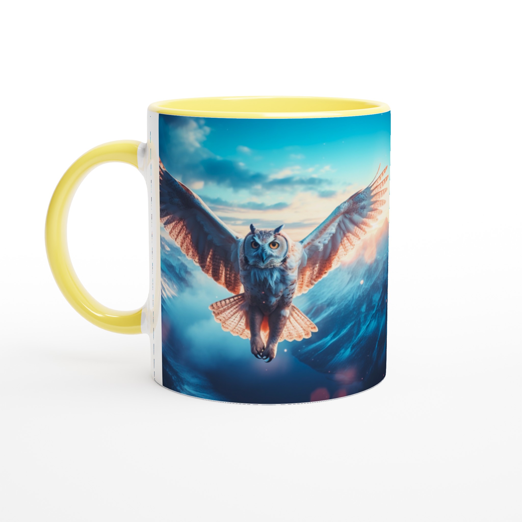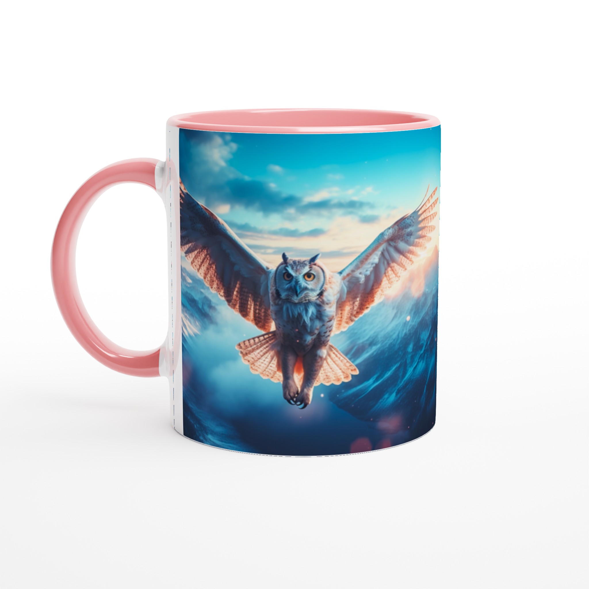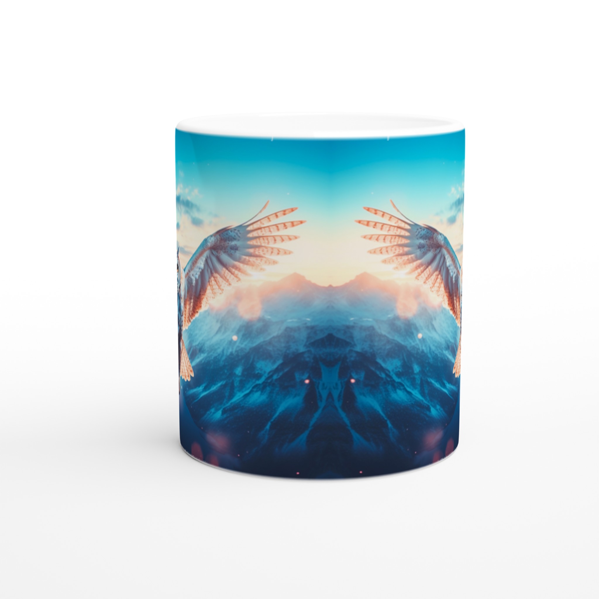 Fånga den magiska känslan av frihet med vår keramiska mugg med motiv av majestätiska ugglor i solnedgången över snöklädda berg. Denna mugg är mer än bara en dryckesbehållare; den är en inbjudan att drömma dig bort till höga höjder och vidsträckta vyer, perfekt för att starta din morgon med inspiration eller för att koppla av med en varm dryck på kvällen.