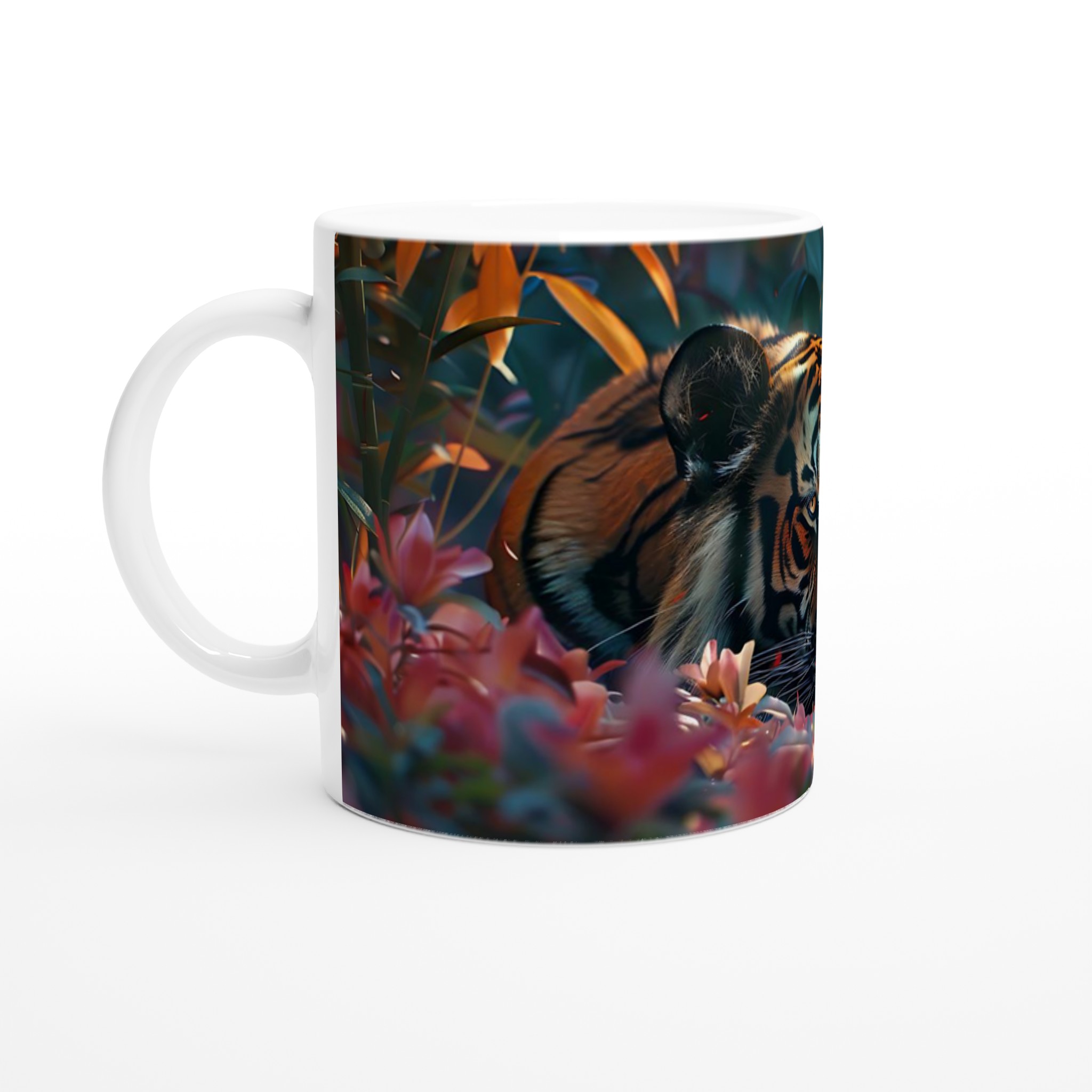 Lyft varje kaffestund med vår premium keramikmugg – stilren, hållbar och skapad för att låta ditt motiv glänsa. Denna fantastiska mugg förvandlar din dryckesupplevelse med en fängslande bild av en majestätisk tiger omgiven av frodiga, färgstarka blommor. Den rika färgpaletten och detaljerade illustrationen skapar en känsla av lugn och vild skönhet, perfekt för naturälskare eller de som uppskattar konstnärliga motiv.