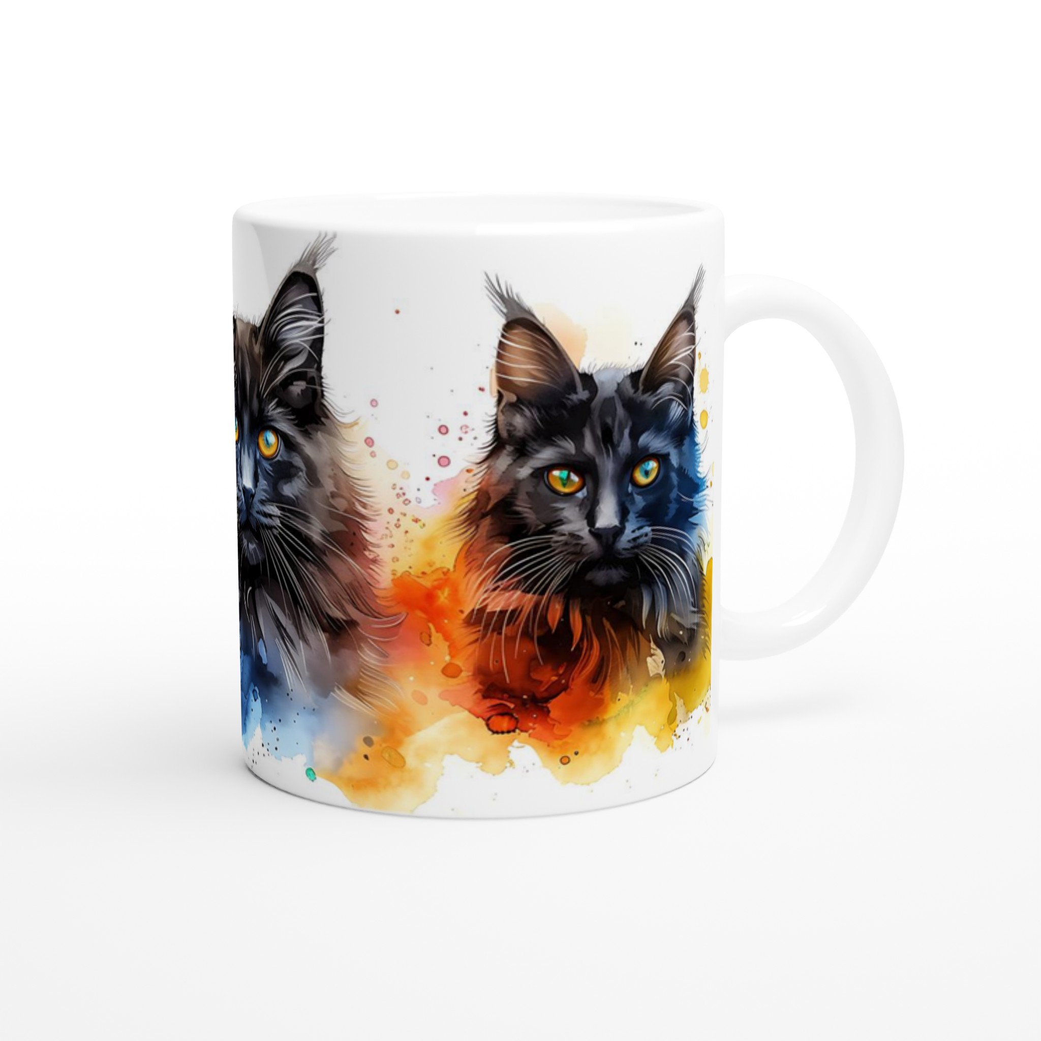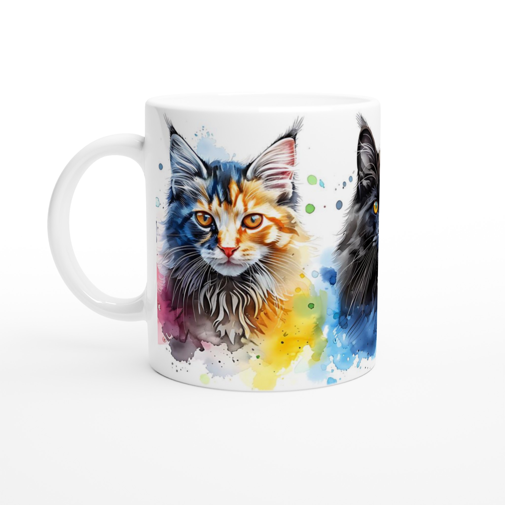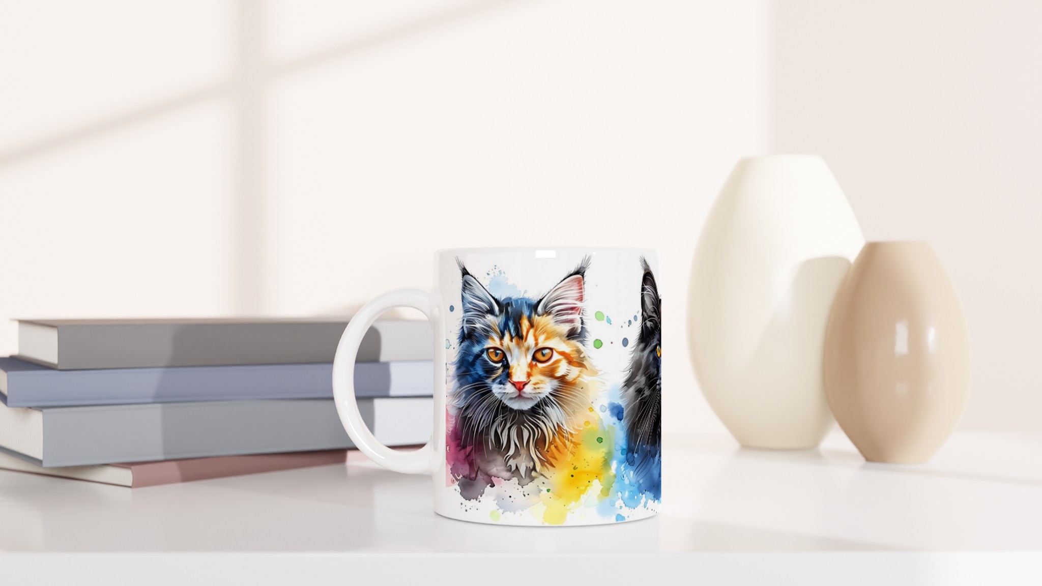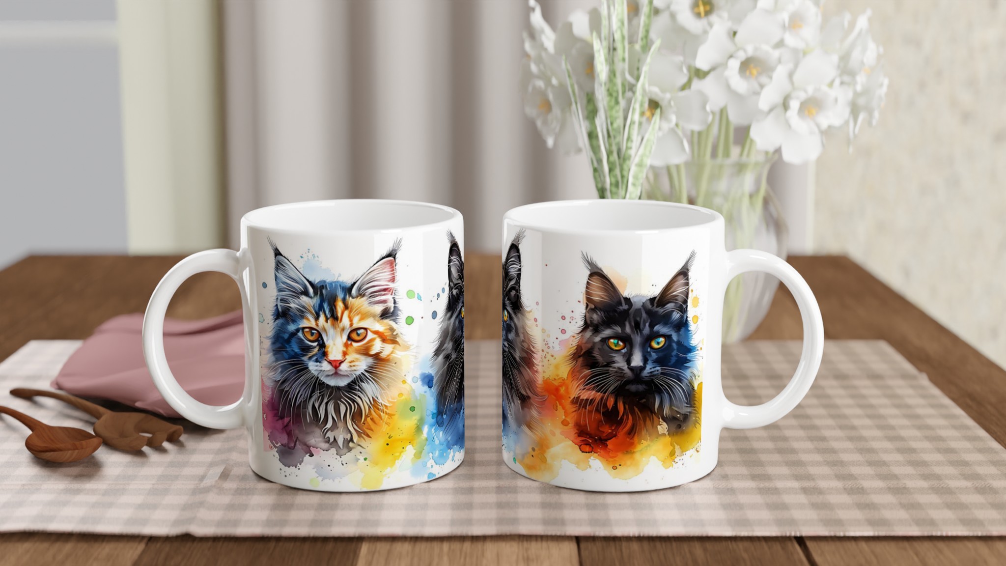 Väck din inre konstnär varje morgon med denna unika keramiska mugg, prydd med ett förtrollande Maine Coon-porträtt i akvarellstil. De levande färgstänkarna och de uttrycksfulla kattansiktena fångar ögonblicket perfekt, vilket gör varje klunk till en liten konstupplevelse. Den här muggen är inte bara en behållare för din favoritdryck; den är ett statement, en hyllning till kattens elegans och en explosion av färg som livar upp varje paus.