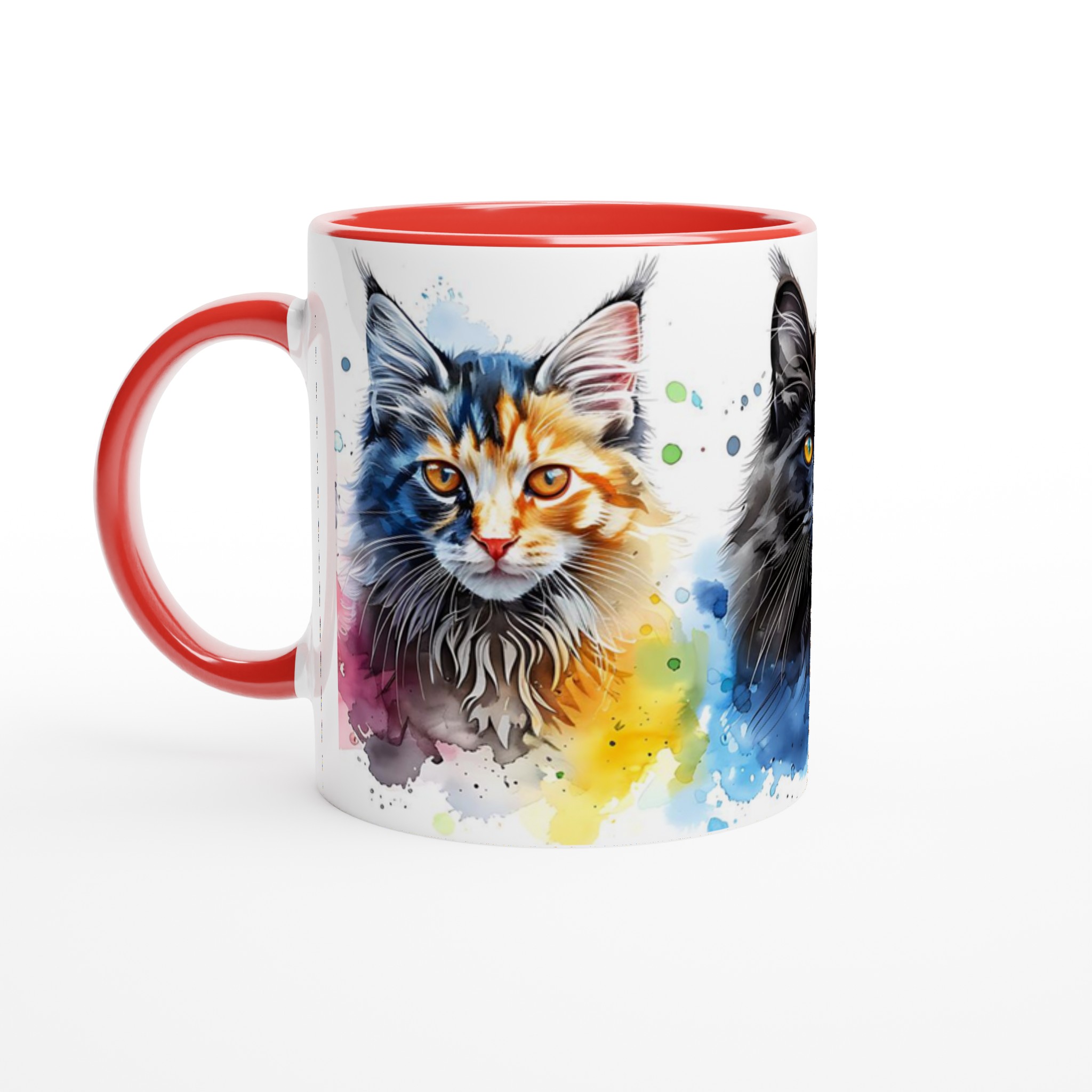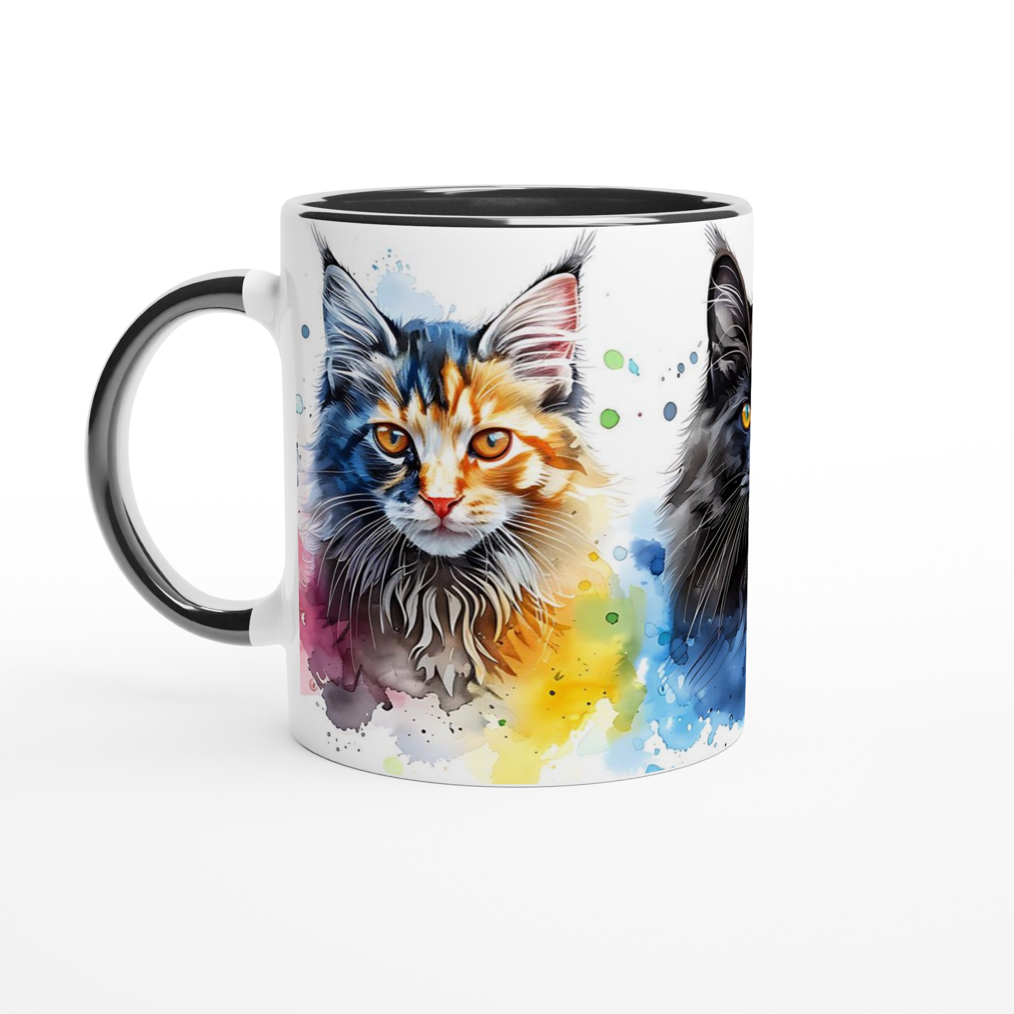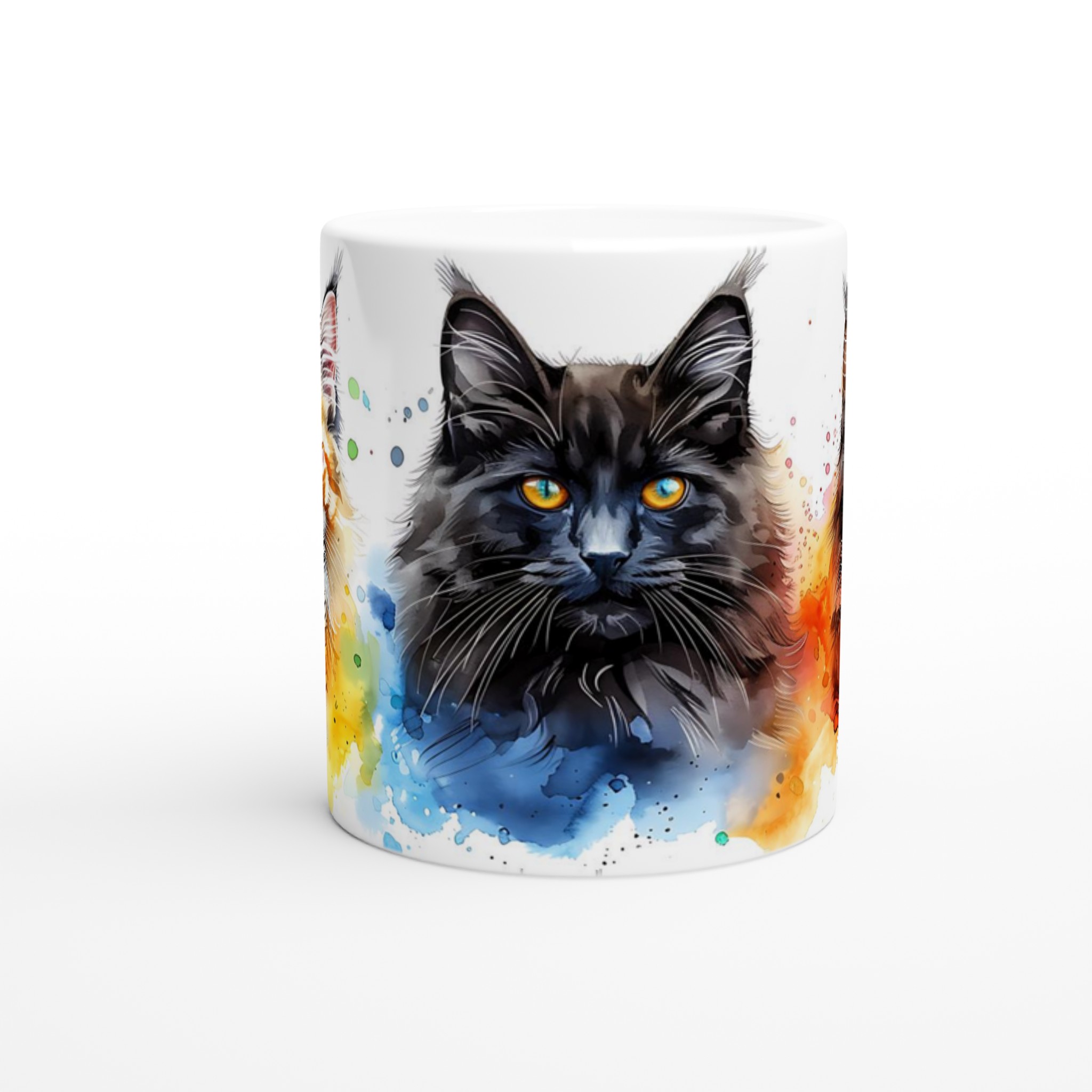 Väck din inre konstnär varje morgon med denna unika keramiska mugg, prydd med ett förtrollande Maine Coon-porträtt i akvarellstil. De levande färgstänkarna och de uttrycksfulla kattansiktena fångar ögonblicket perfekt, vilket gör varje klunk till en liten konstupplevelse. Den här muggen är inte bara en behållare för din favoritdryck; den är ett statement, en hyllning till kattens elegans och en explosion av färg som livar upp varje paus.