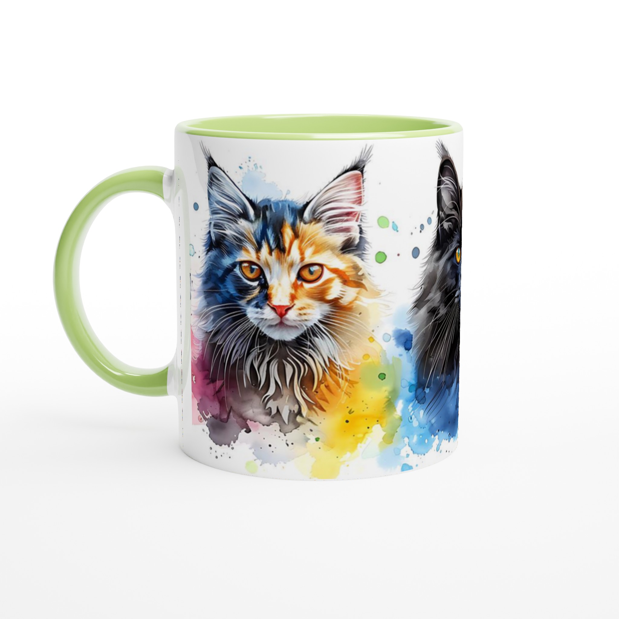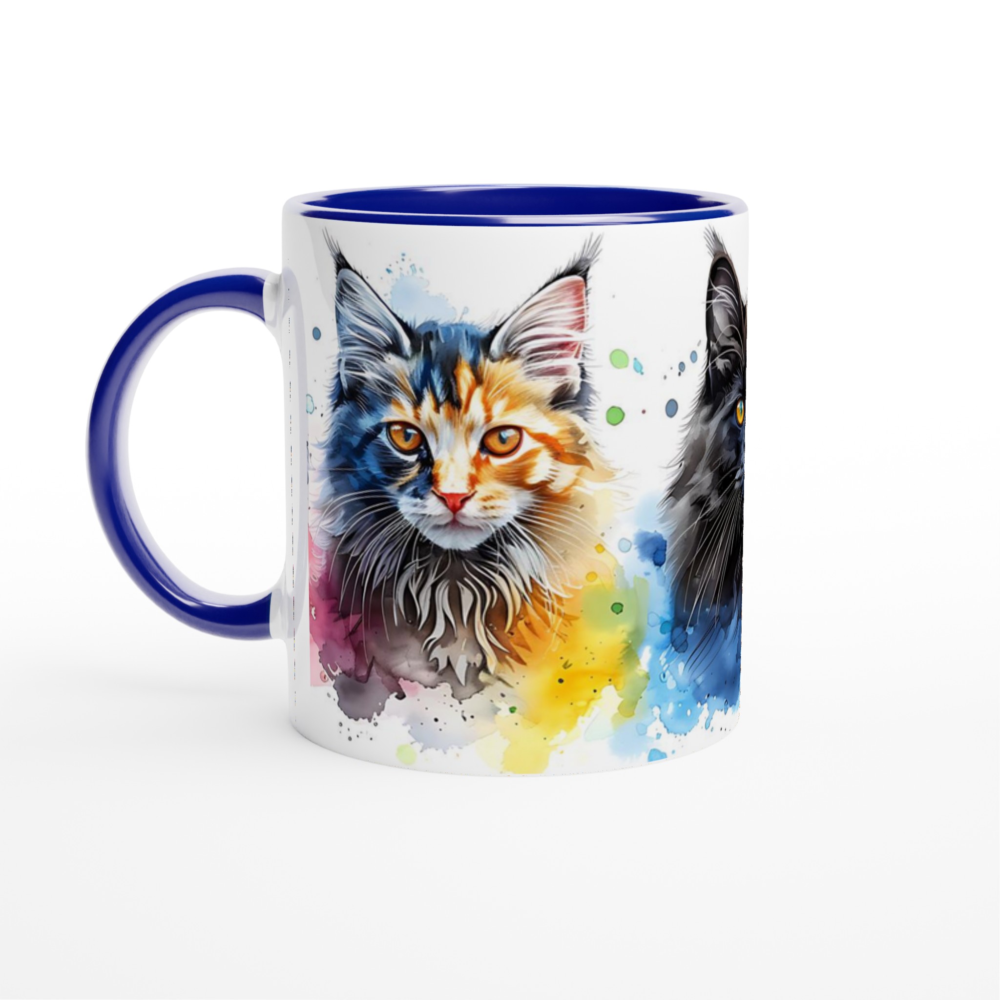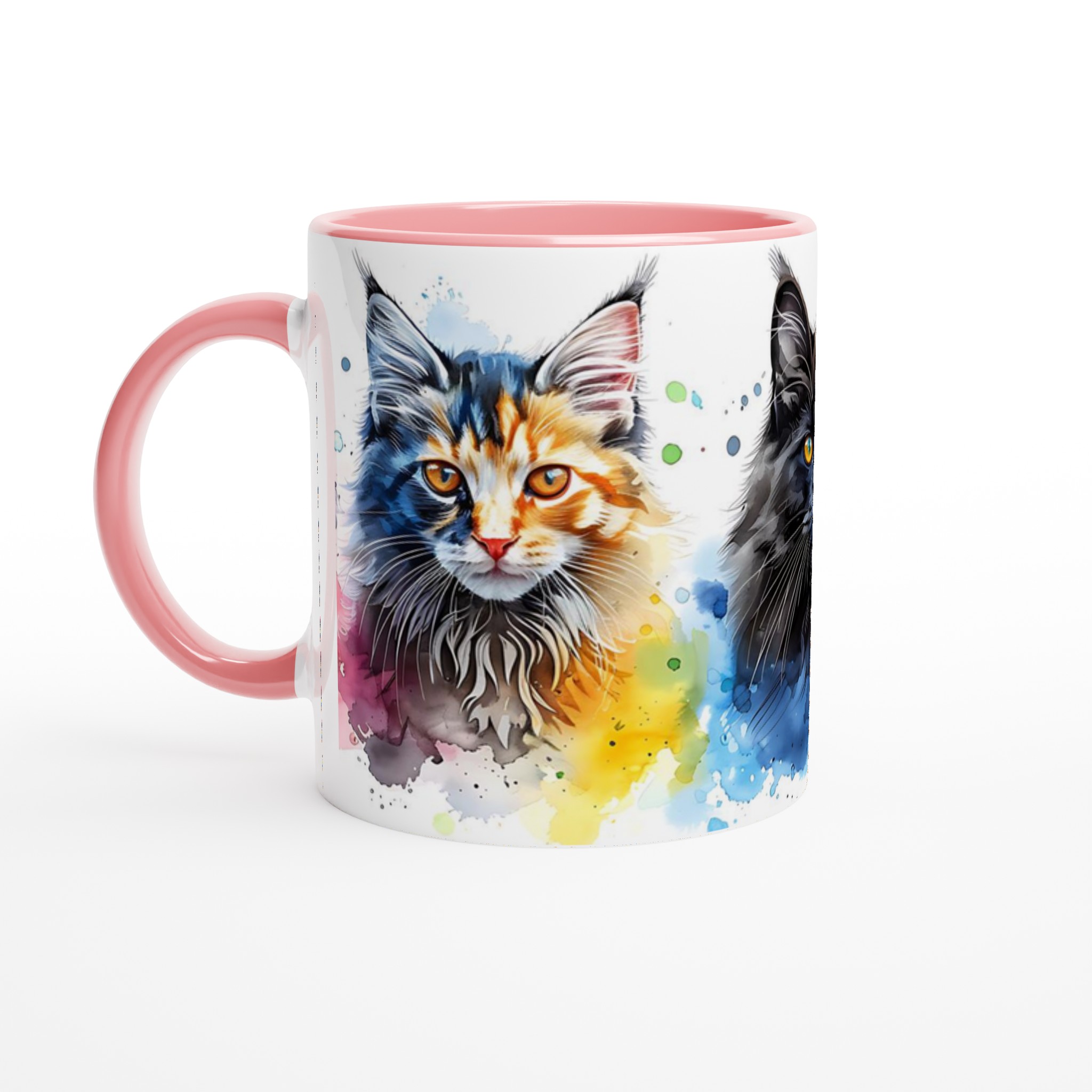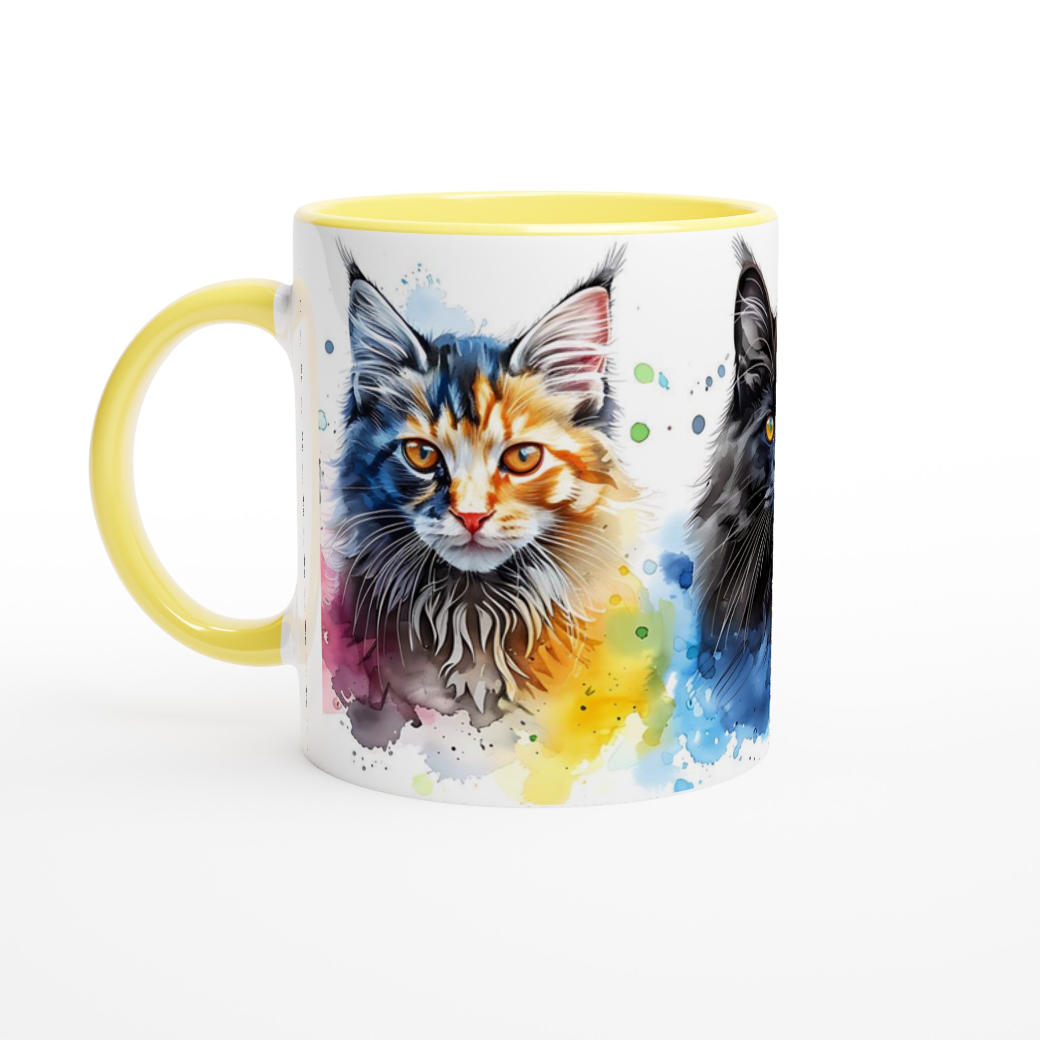 Väck din inre konstnär varje morgon med denna unika keramiska mugg, prydd med ett förtrollande Maine Coon-porträtt i akvarellstil. De levande färgstänkarna och de uttrycksfulla kattansiktena fångar ögonblicket perfekt, vilket gör varje klunk till en liten konstupplevelse. Den här muggen är inte bara en behållare för din favoritdryck; den är ett statement, en hyllning till kattens elegans och en explosion av färg som livar upp varje paus.