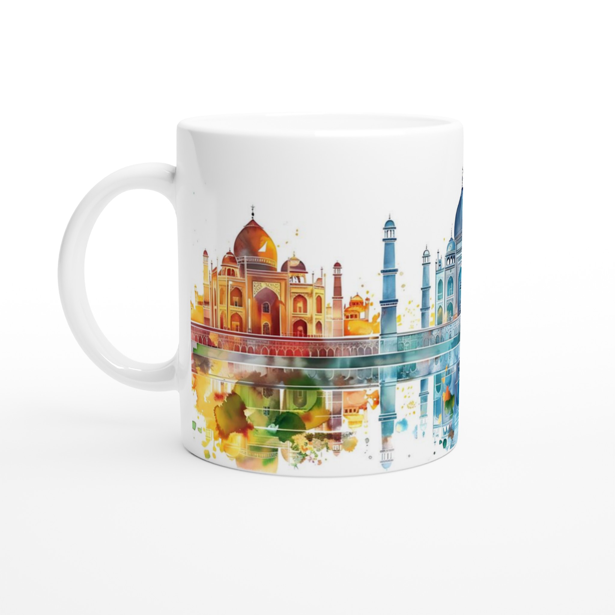 Lyft varje kaffestund med vår premium keramikmugg – stilren, hållbar och skapad för att låta ditt motiv glänsa. Denna fantastiska mugg har en konstnärlig akvarelltolkning av Taj Mahal, reflekterad i en levande färgpalett av varma terrakotta-, svala blå- och gyllene toner, vilket ger en touch av drömsk elegans till din dagliga rutin.