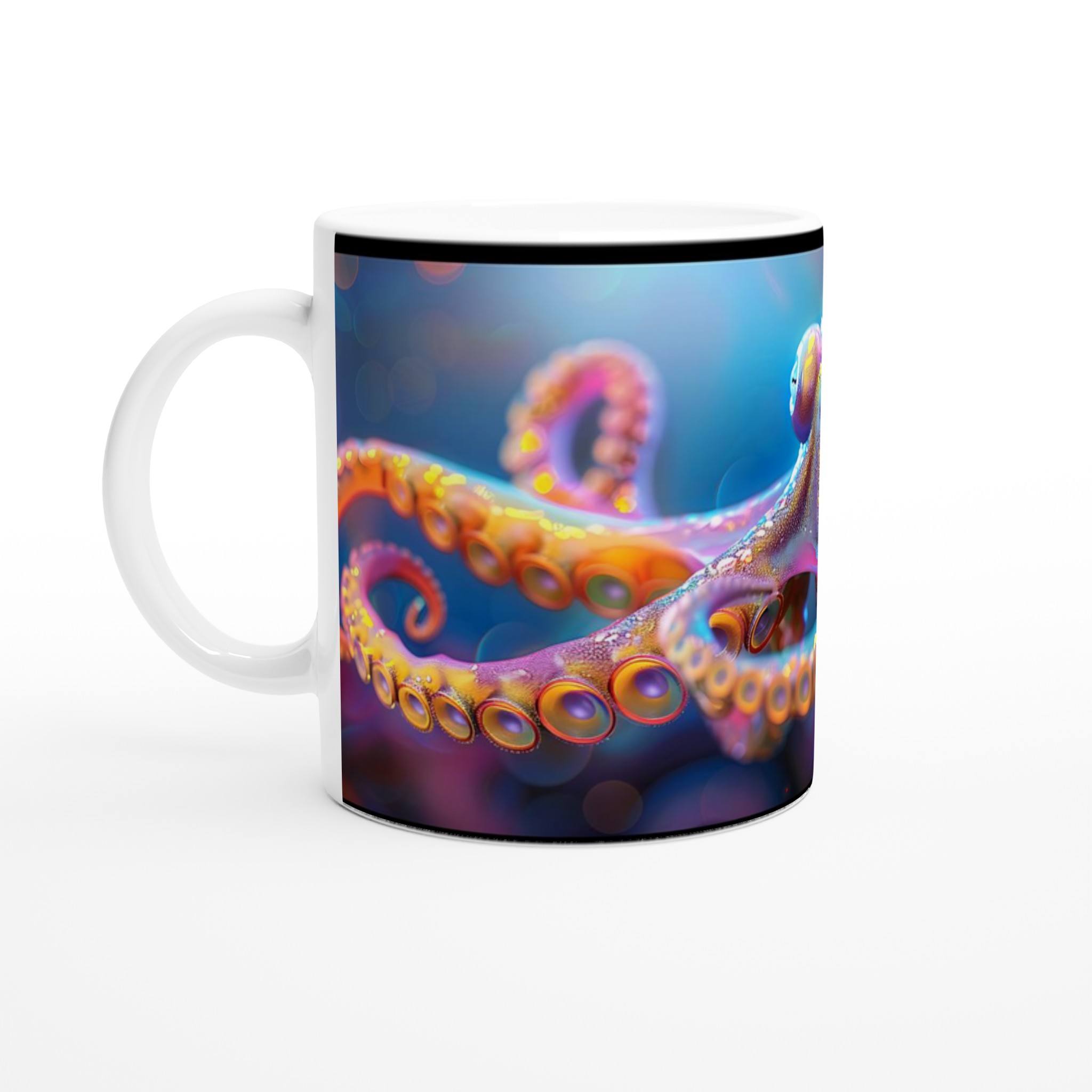 Låt fantasin flöda med denna unika keramikmugg, prydd med en förtrollande mångfärgad bläckfisk som dansar i en drömlik undervattensvärld. De levande nyanserna av turkos, lila, orange och guld skapar en magisk atmosfär och gör varje klunk till en upplevelse. Denna mugg är perfekt för dig som älskar havet, konstnärliga uttryck eller bara vill addera en färgstark touch till din vardag.