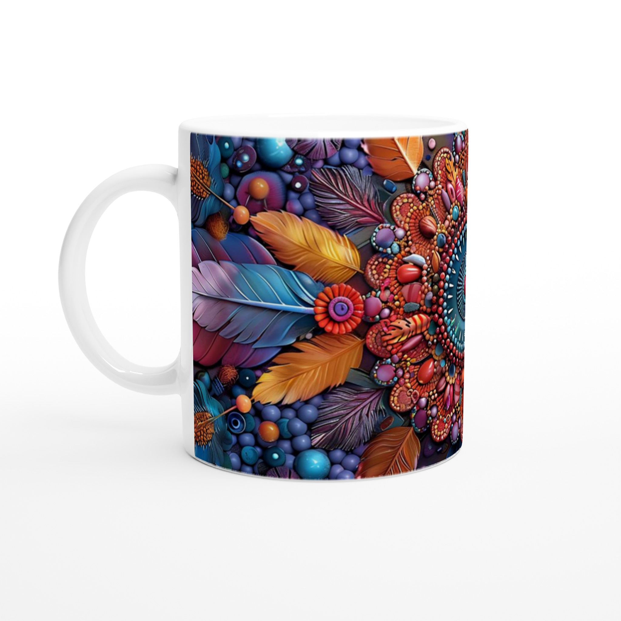 Upplev en explosion av färger och intrikata detaljer med denna fantastiska keramikmugg, prydd med ett levande etniskt mönster inspirerat av natur och tradition. Varje klunk blir en resa genom en konstfull värld av rika nyanser och symboliska former. Denna stilrena och vackra keramikmugg är perfekt för alla dagens stunder – morgonkaffet, en värmande kopp te eller en härlig varm choklad. Den blanka vita ytan gör att trycken framträder klart och färgstarkt, vilket gör muggen till en riktig favorit i vardagen. Tack vare den höga kvaliteten behåller trycket sin lyster även efter många omgångar i både mikrovågsugn och diskmaskin.