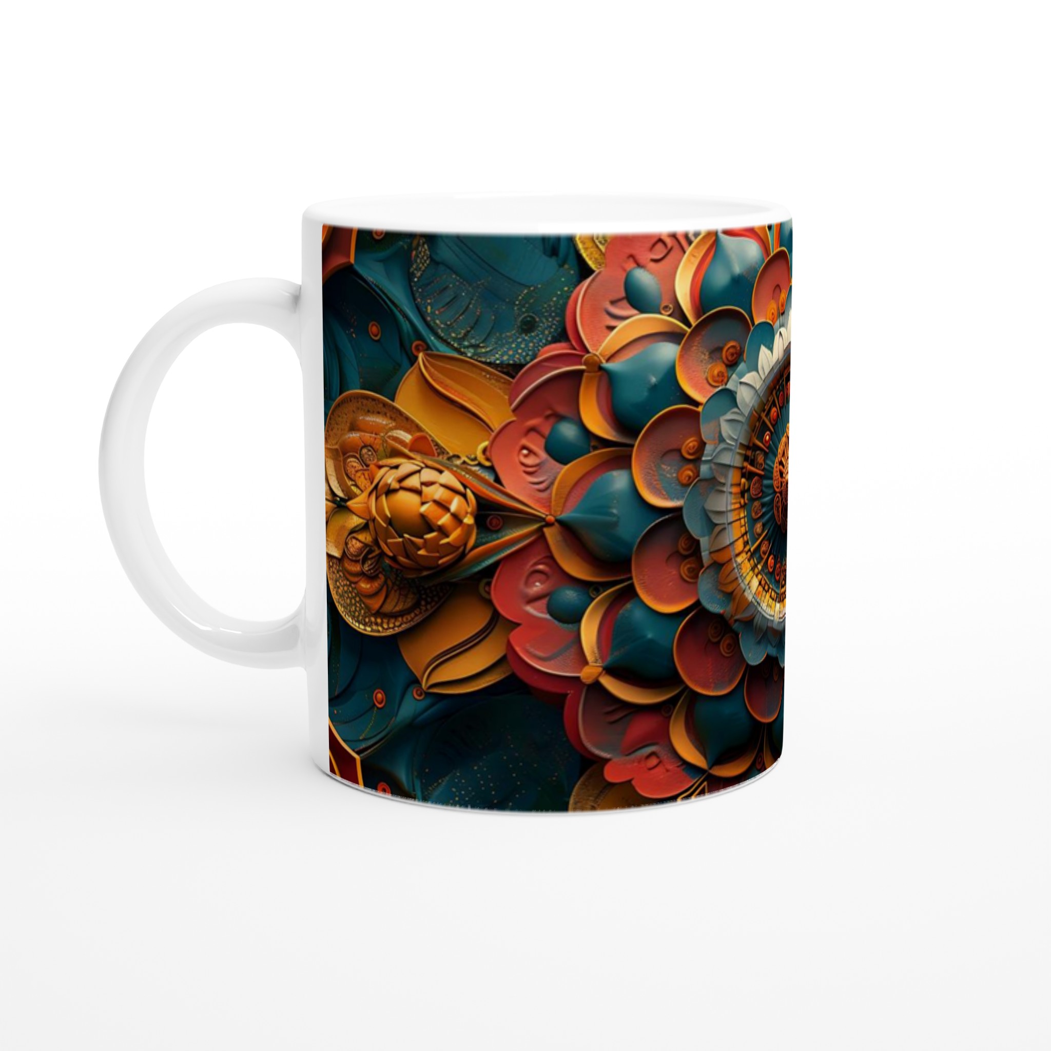Väck dina sinnen med denna förtrollande keramikmugg, prydd med en intrikat mandala-design i en rik palett av teal, guld, terrakotta och djuprött. Varje detalj i detta konstverk inbjuder till lugn och eftertanke, vilket gör varje klunk till en stund av ren njutning. Oavsett om det är morgonkaffet, en värmande kopp te eller en härlig varm choklad, blir denna mugg en vacker mittpunkt i din hand och på ditt bord.